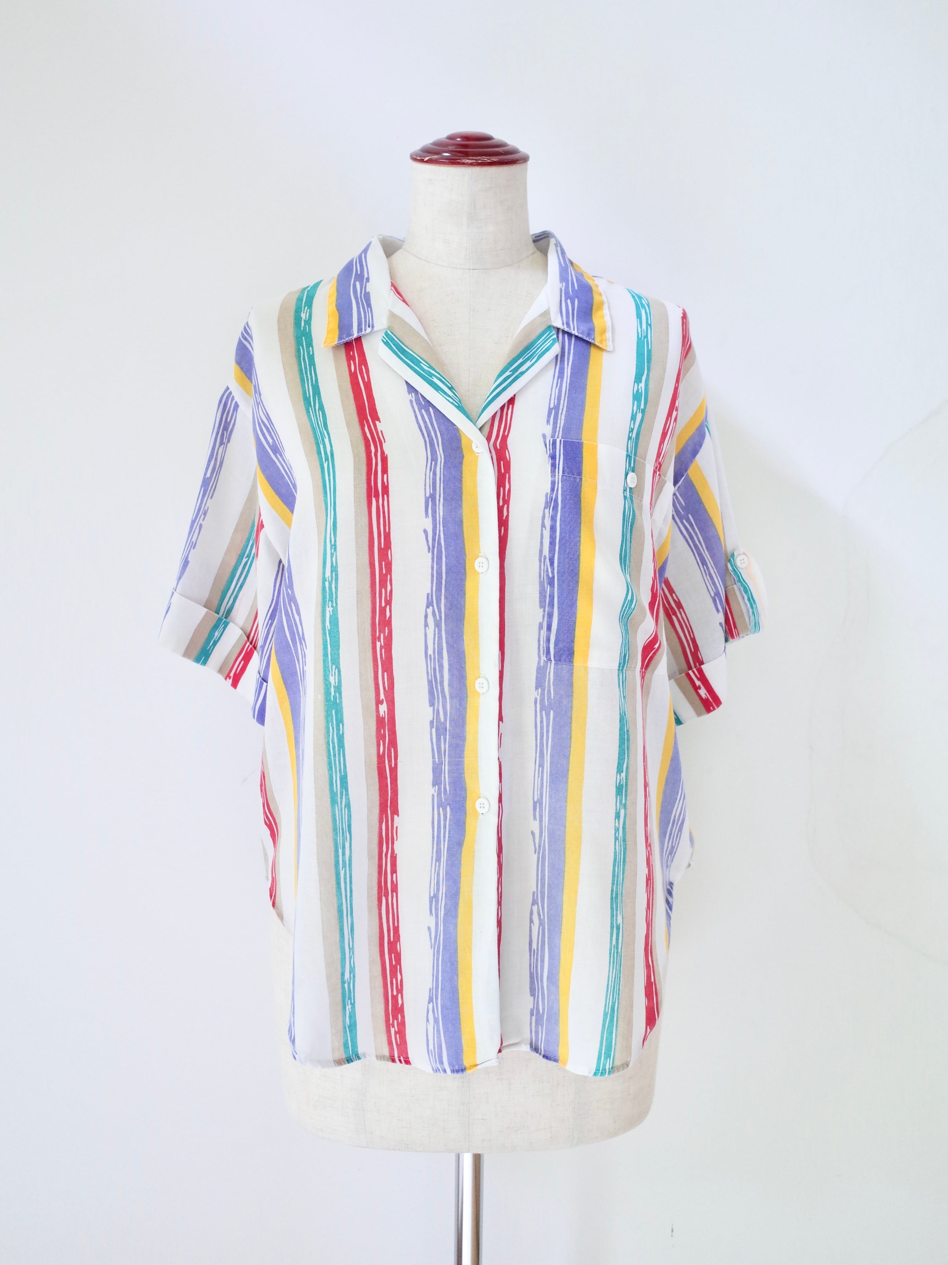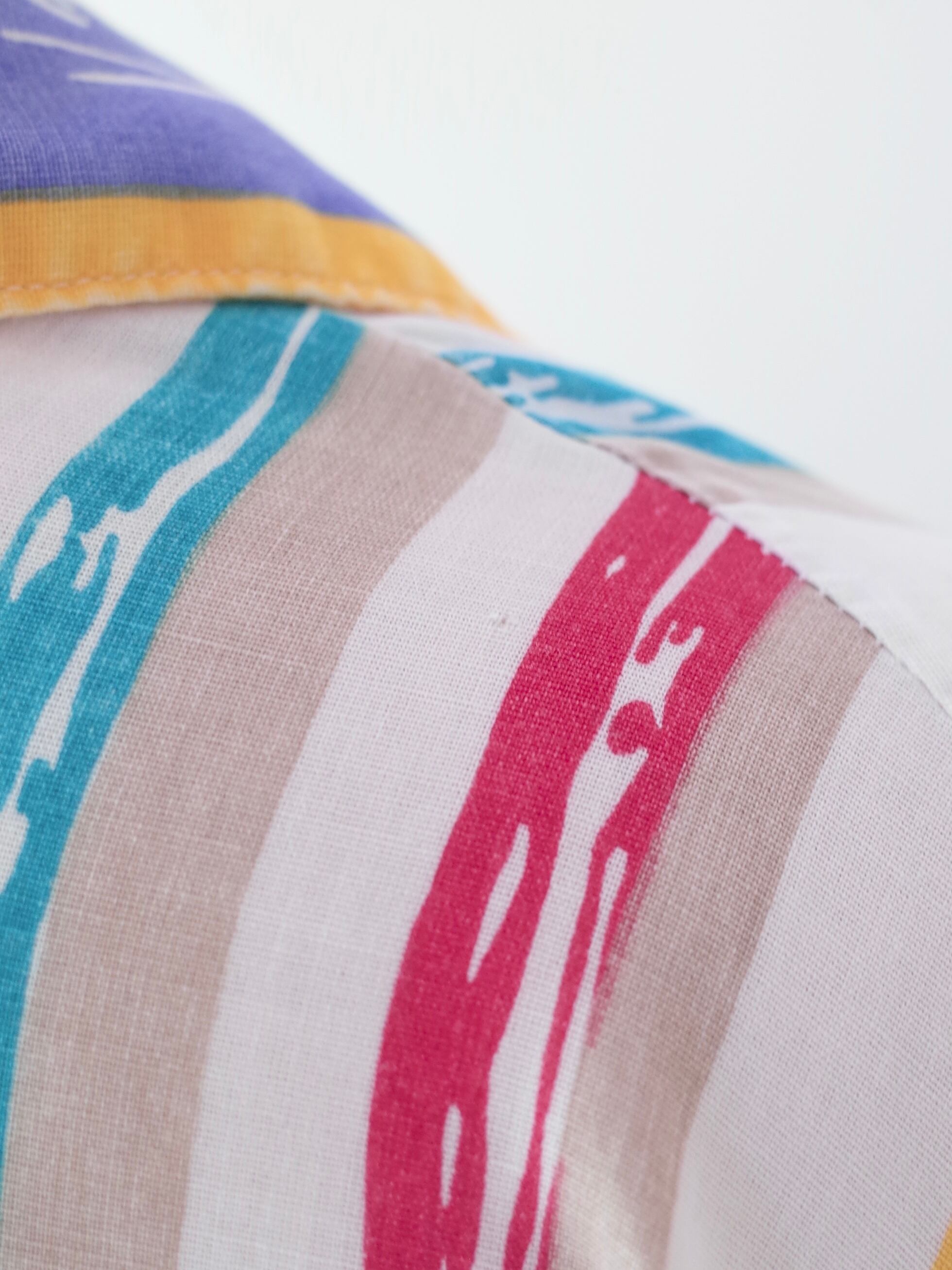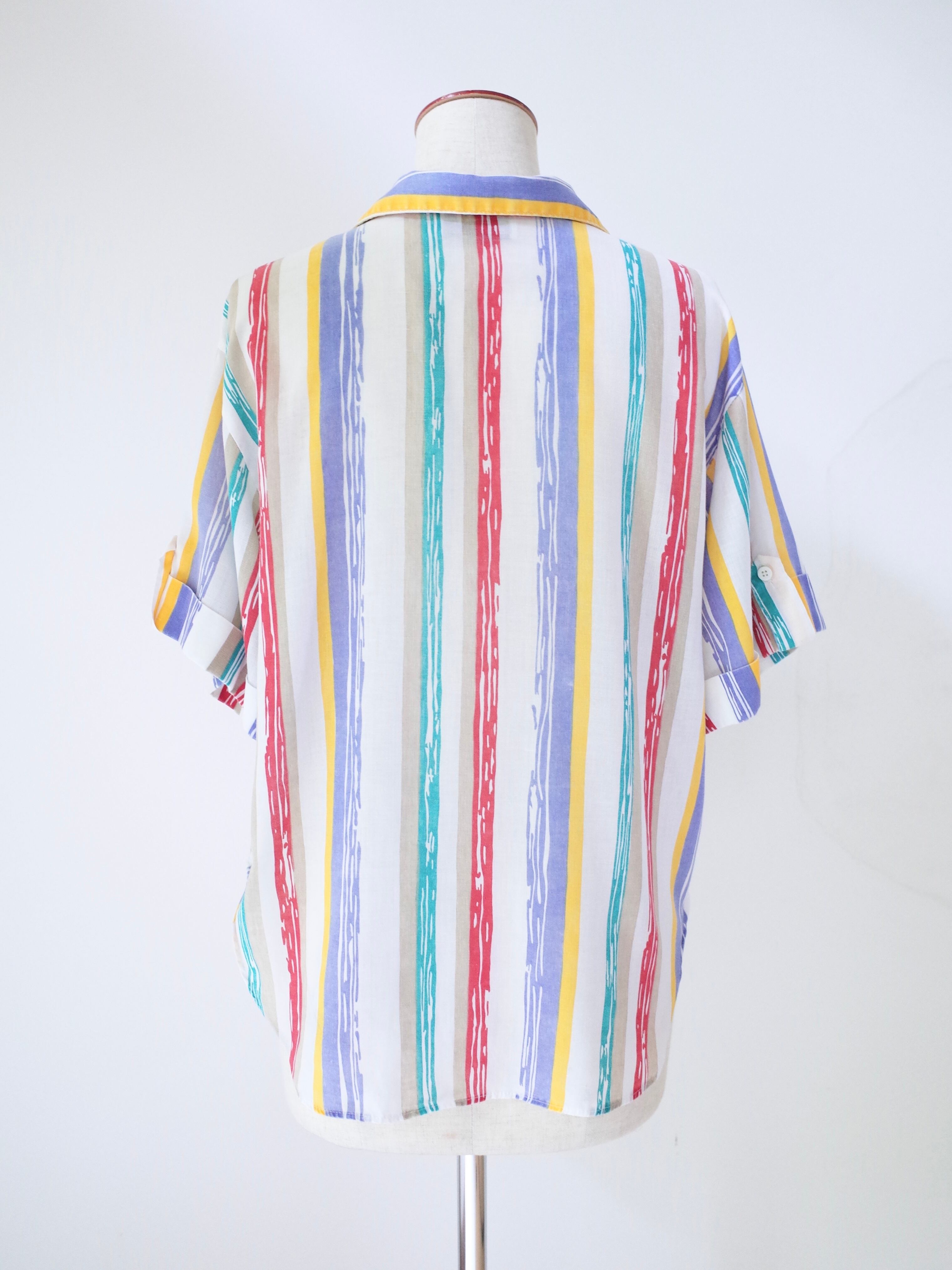 80年代アメリカ製の独特なストライプ柄が可愛い半袖シャツ。薄手の生地感で、涼しく着用出来る一枚です。