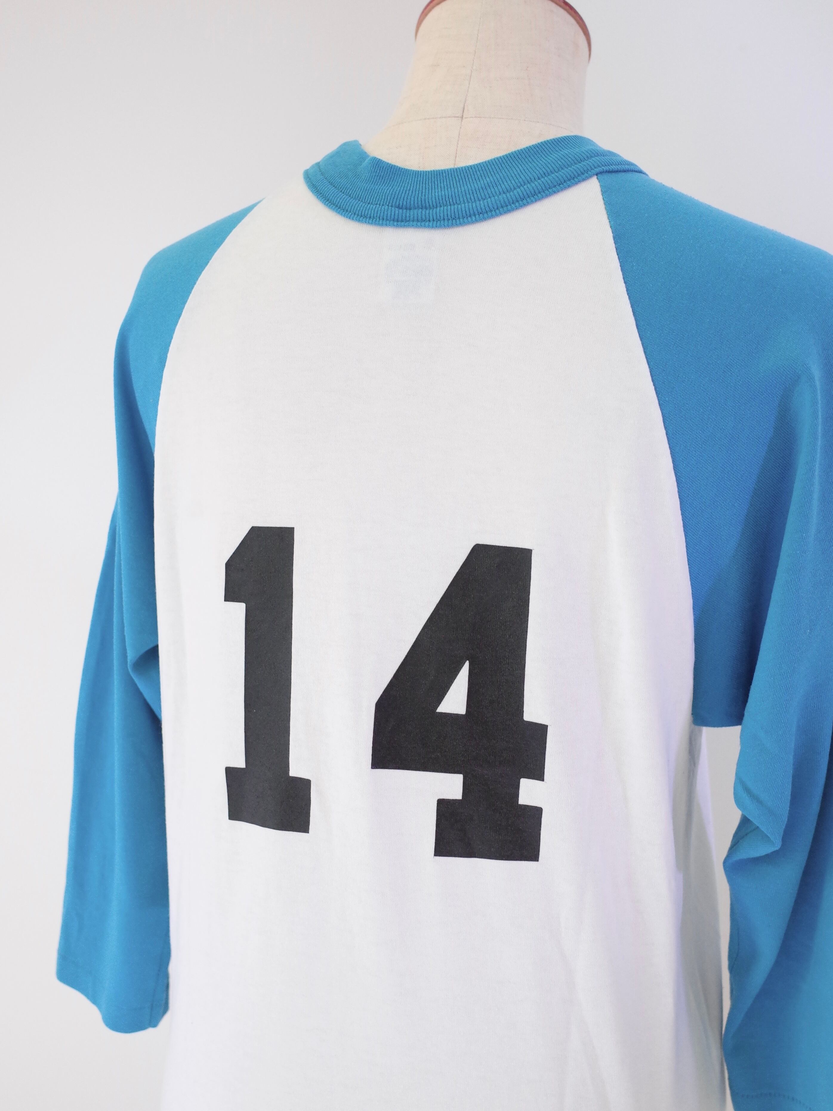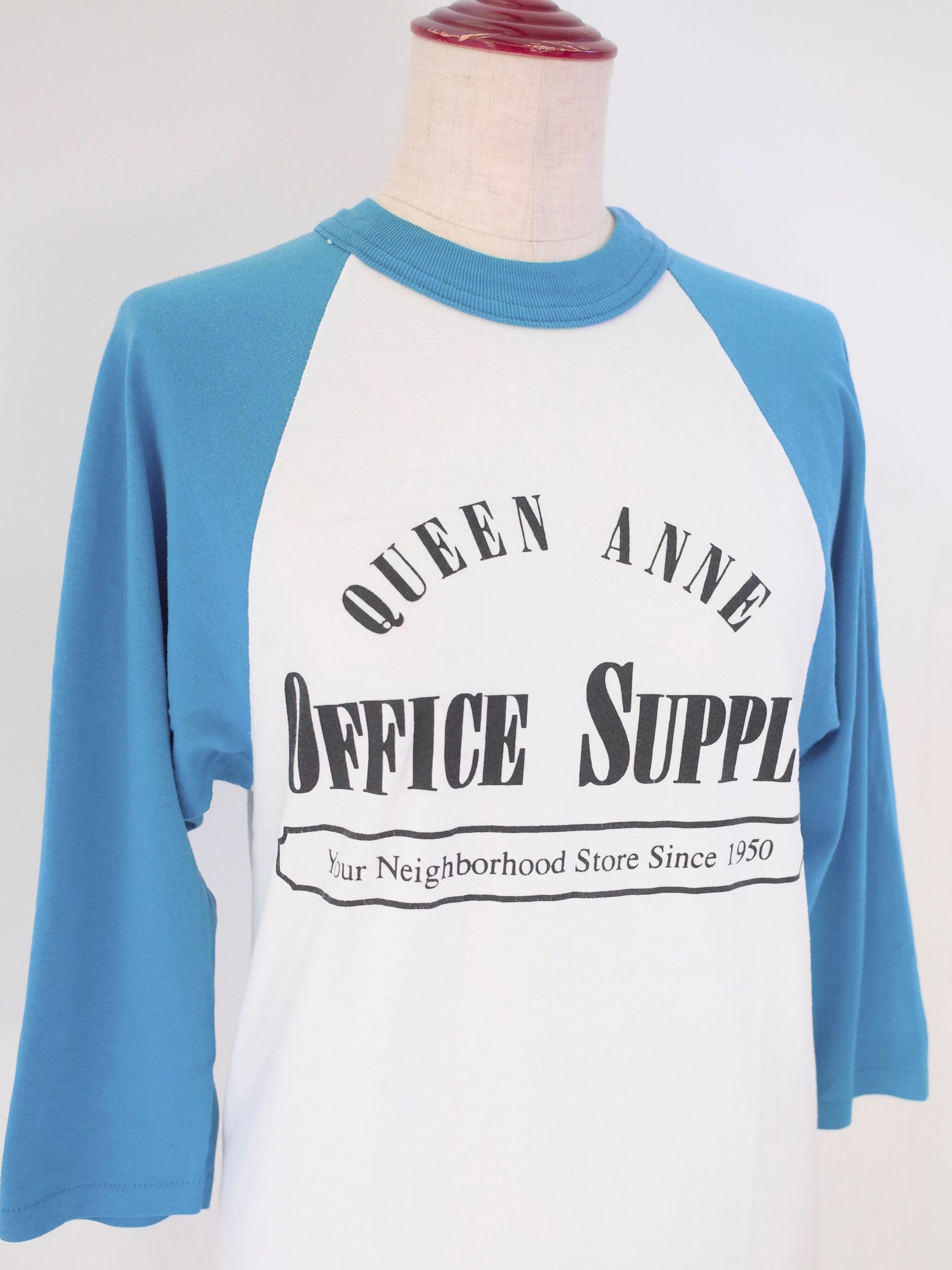 80〜90年代アメリカ製、シアトルにあった"Queen Anne Office Supply"のTシャツ。ボディはSOFFEです。シンプルなプリントにバックはナンバリング。鮮やかなターコイズブルーのラグランスリーブがGOODな一枚です。
