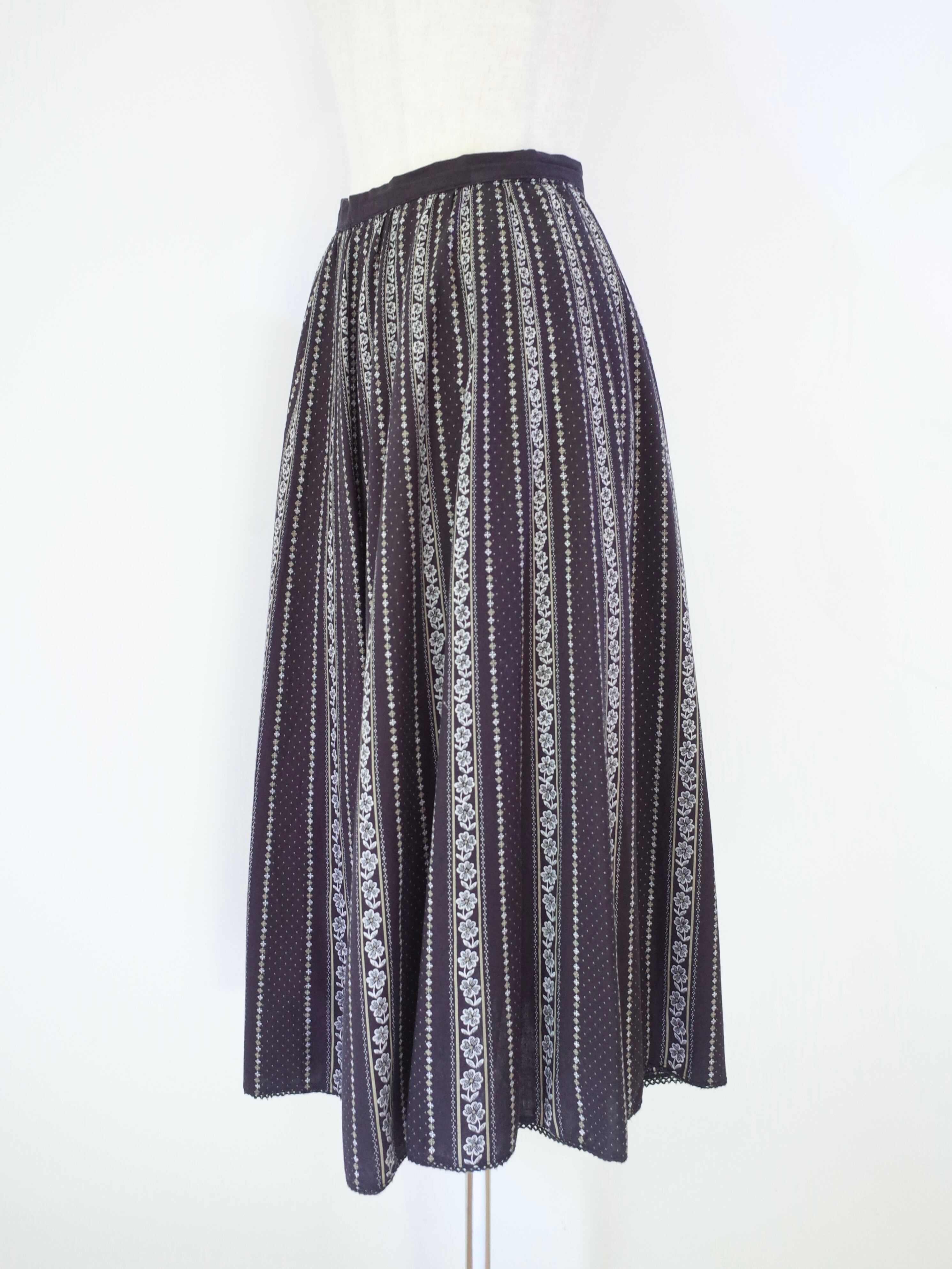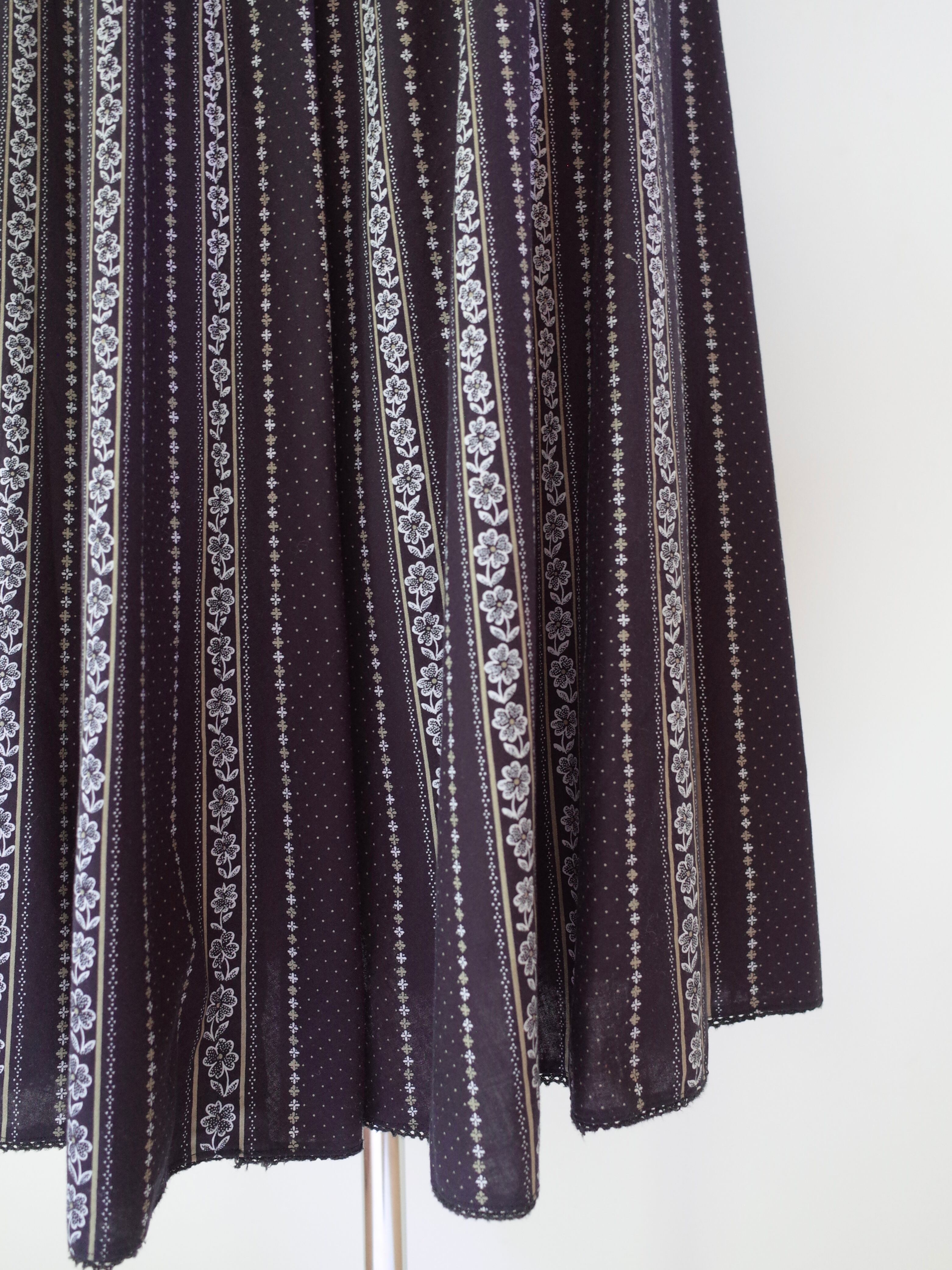 お花やドットなどがプリントされたユーロらしい柄のロングスカートです。ブラック地にホワイトとゴールドのカラーが上品な配色の一枚。裾にはさり気なくレースが施されています。夏はTシャツとスタイリングするだけで可愛いスカートです。