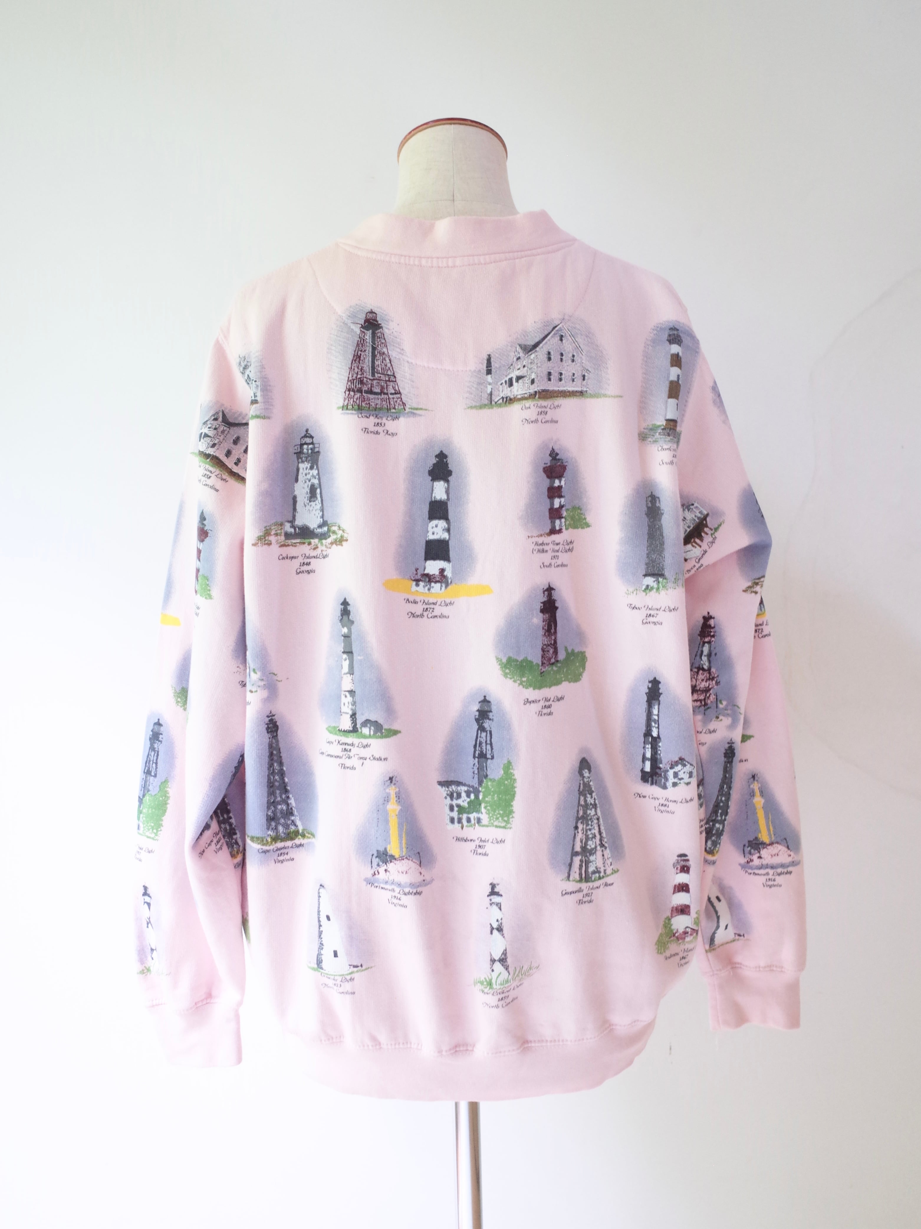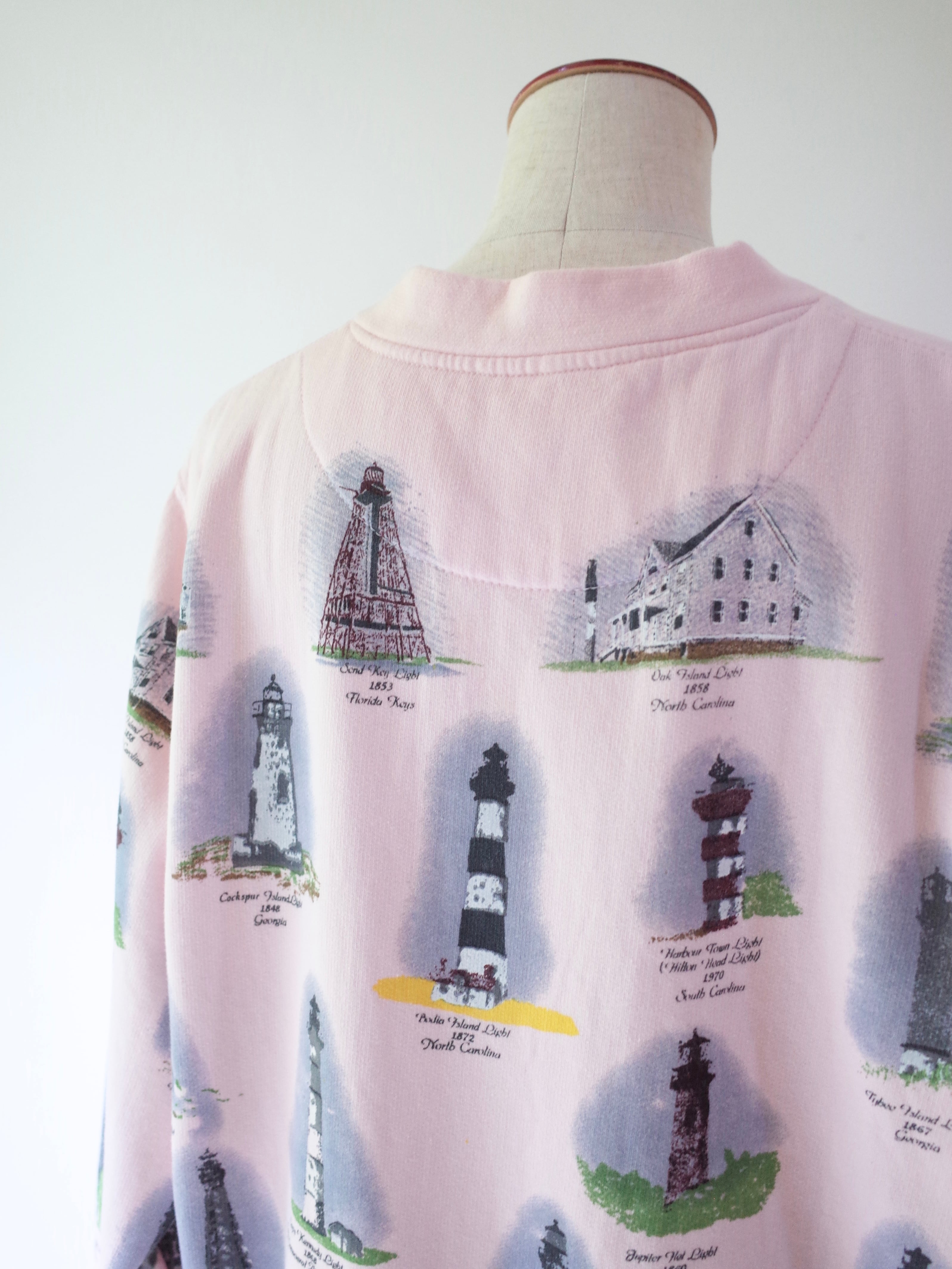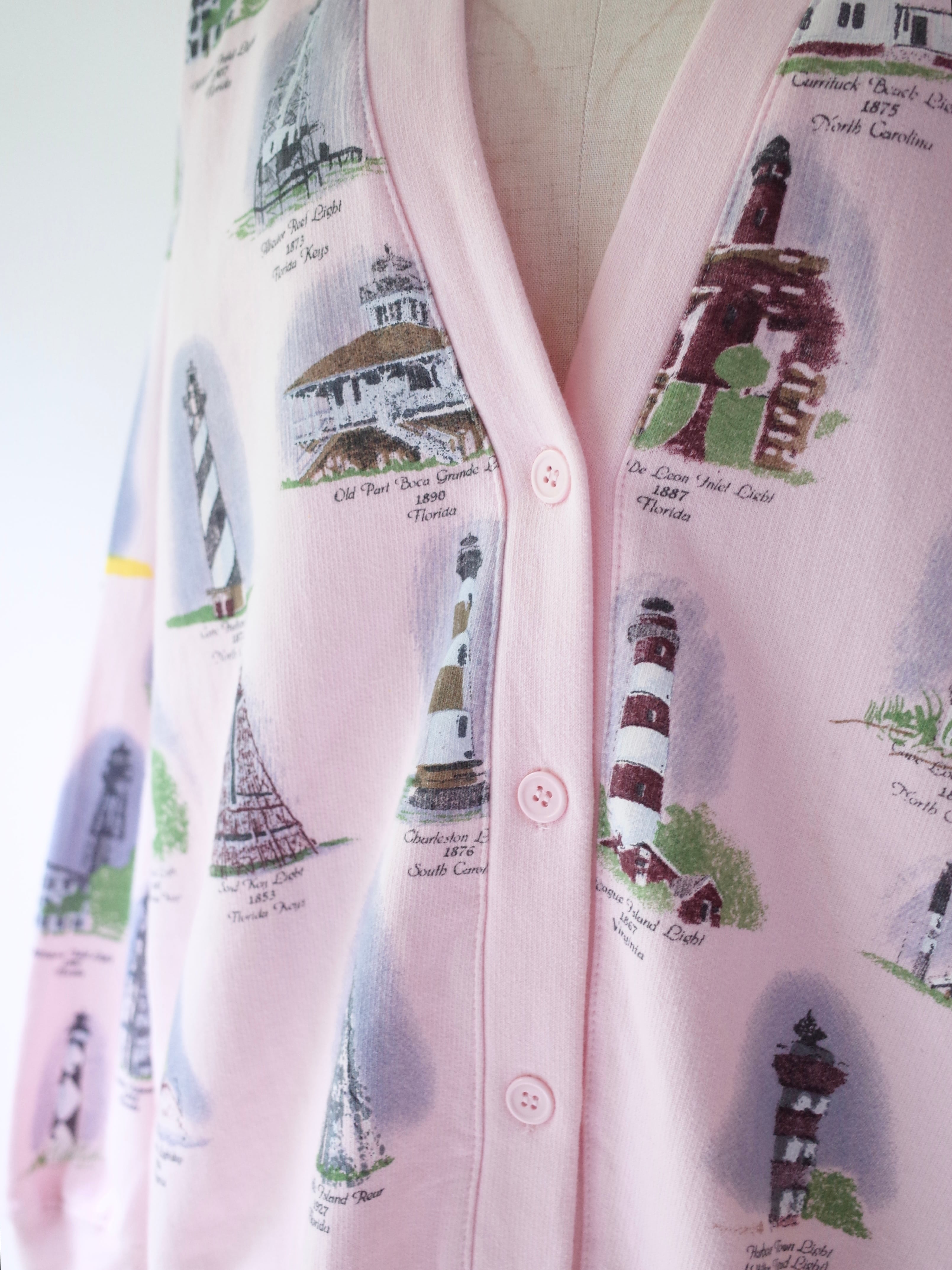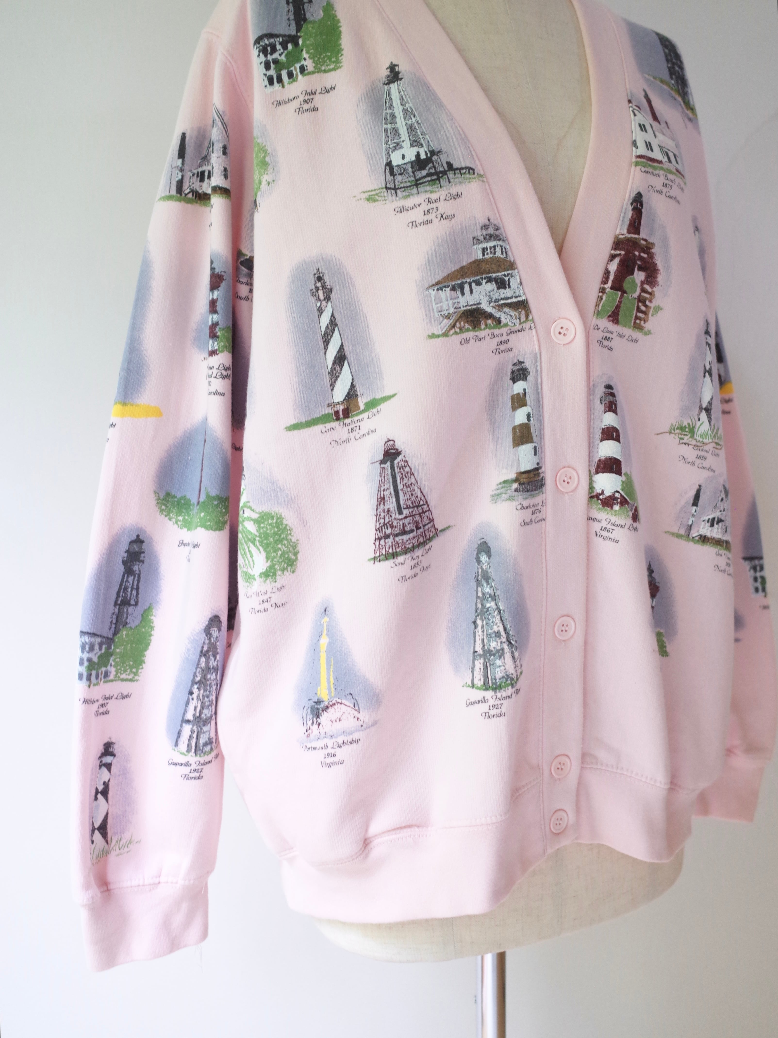 ・可愛らしいライトピンクのボディカラーに、灯台がプリントされたスウェット生地のカーディガン