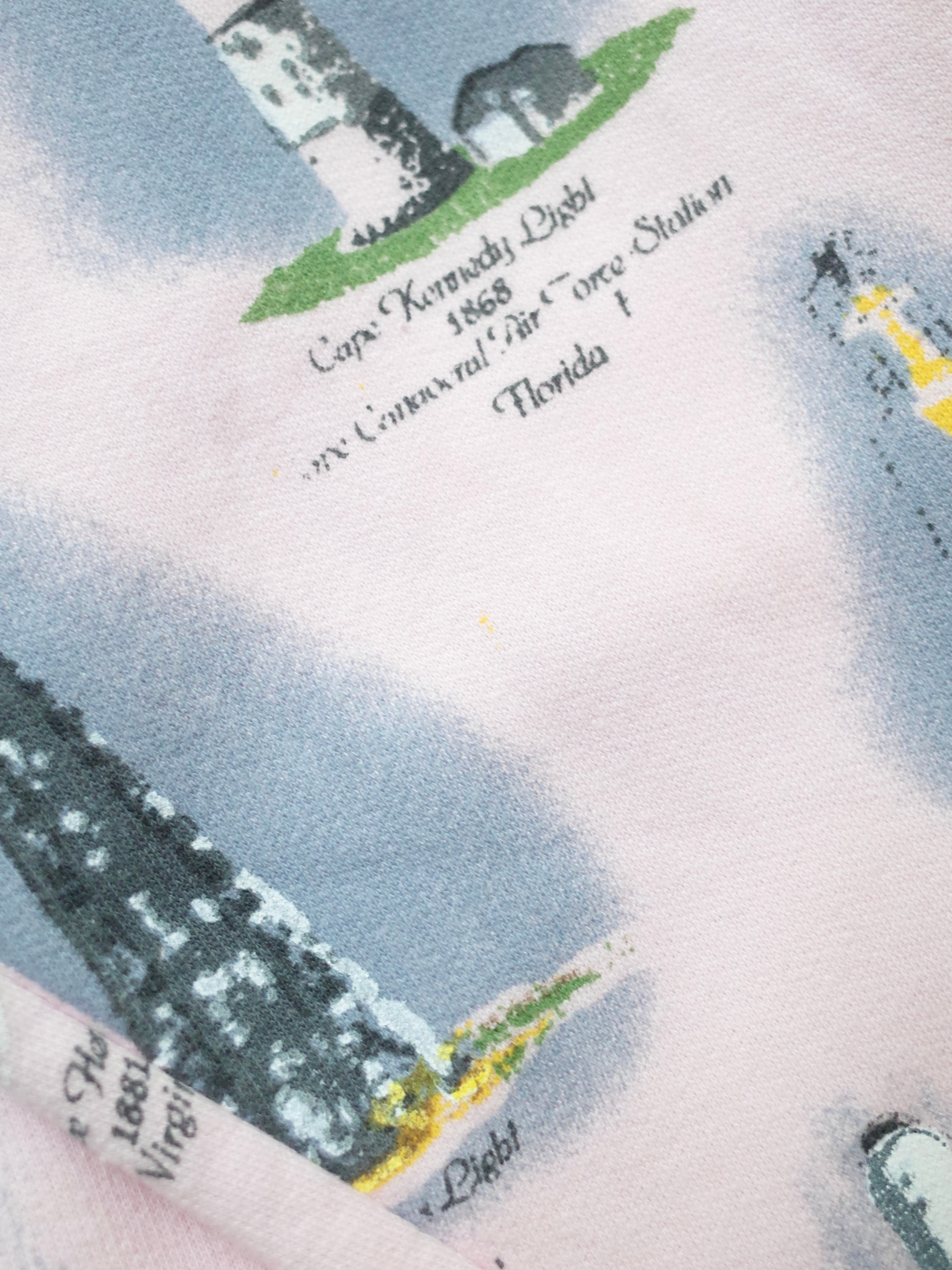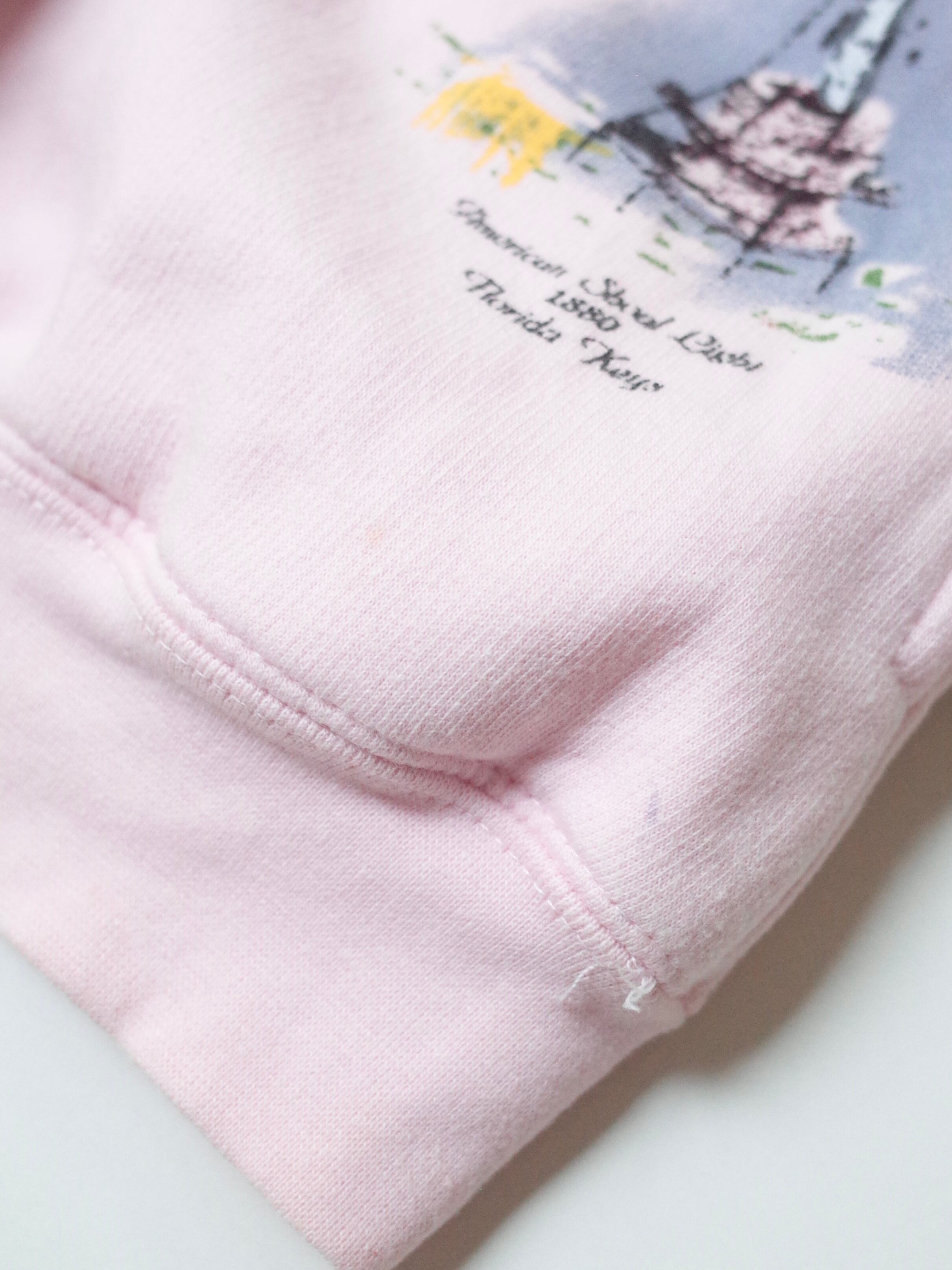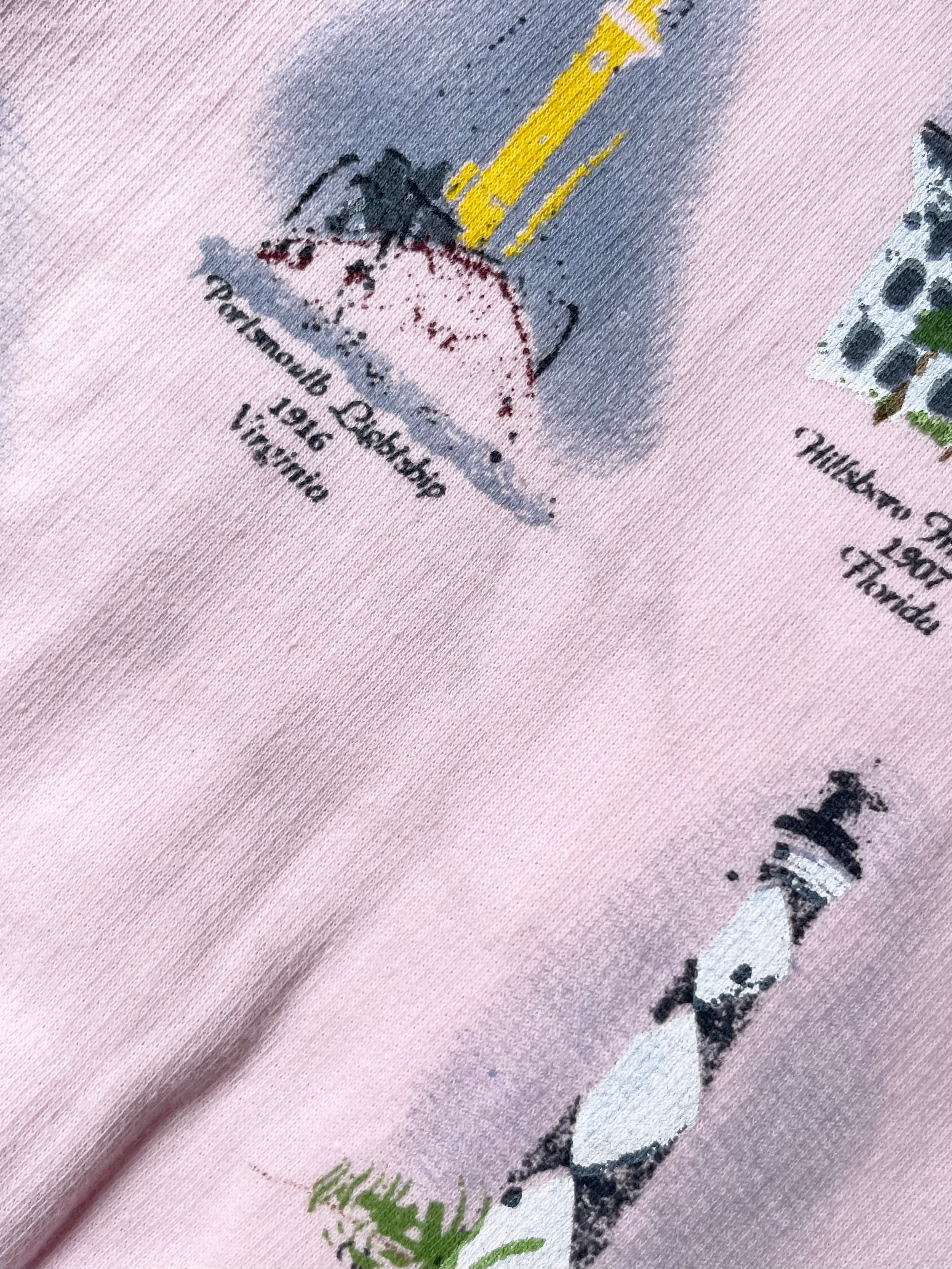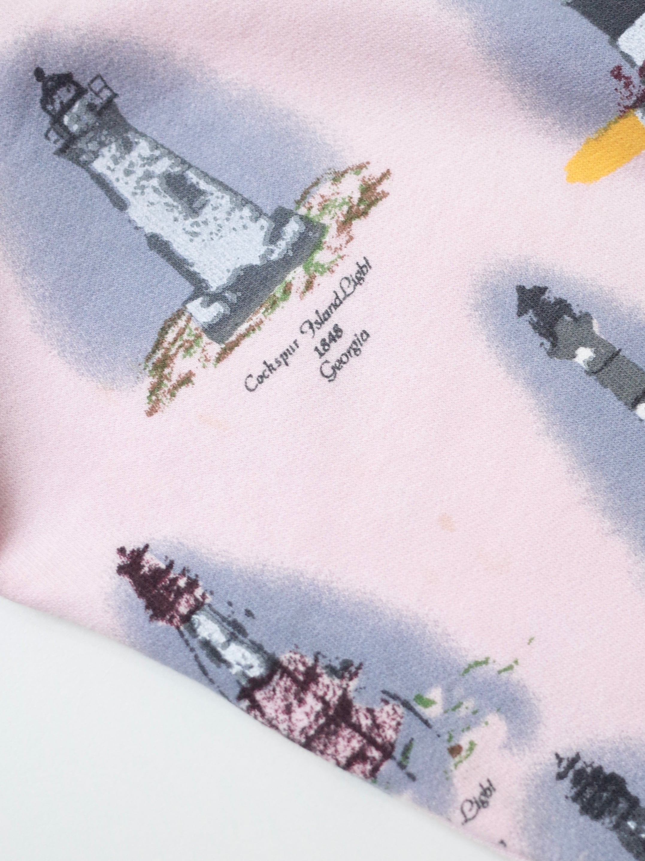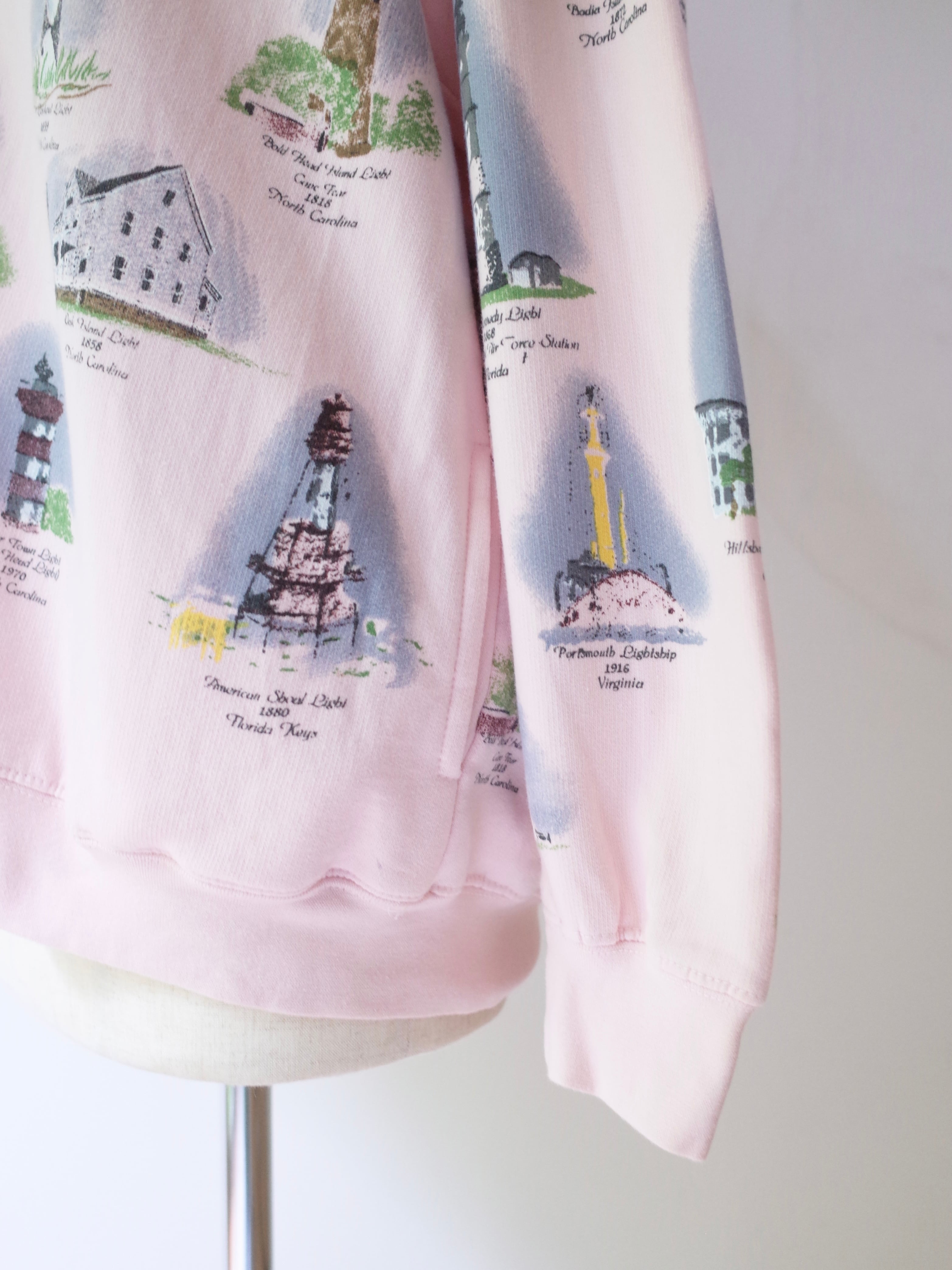 ・可愛らしいライトピンクのボディカラーに、灯台がプリントされたスウェット生地のカーディガン