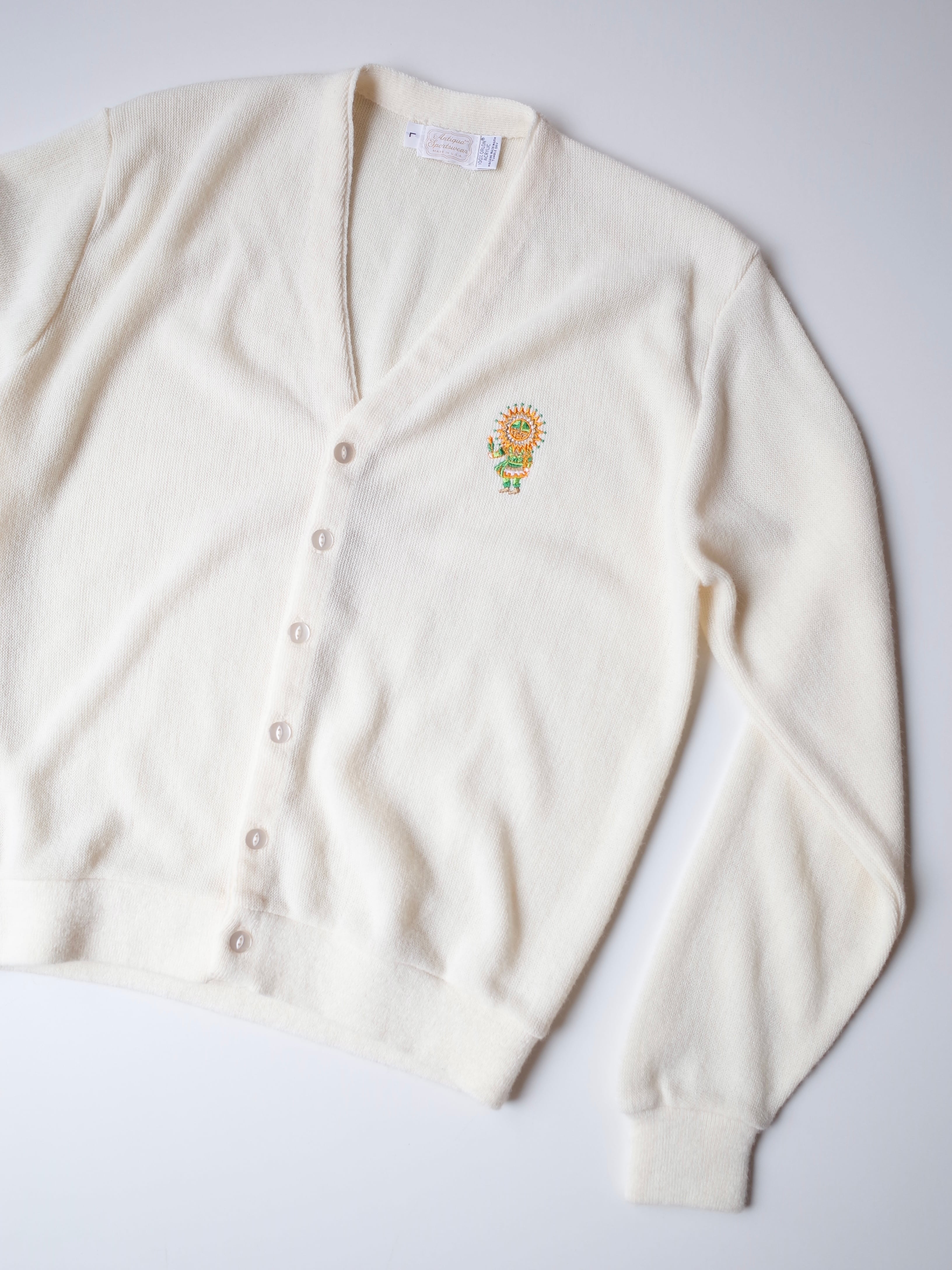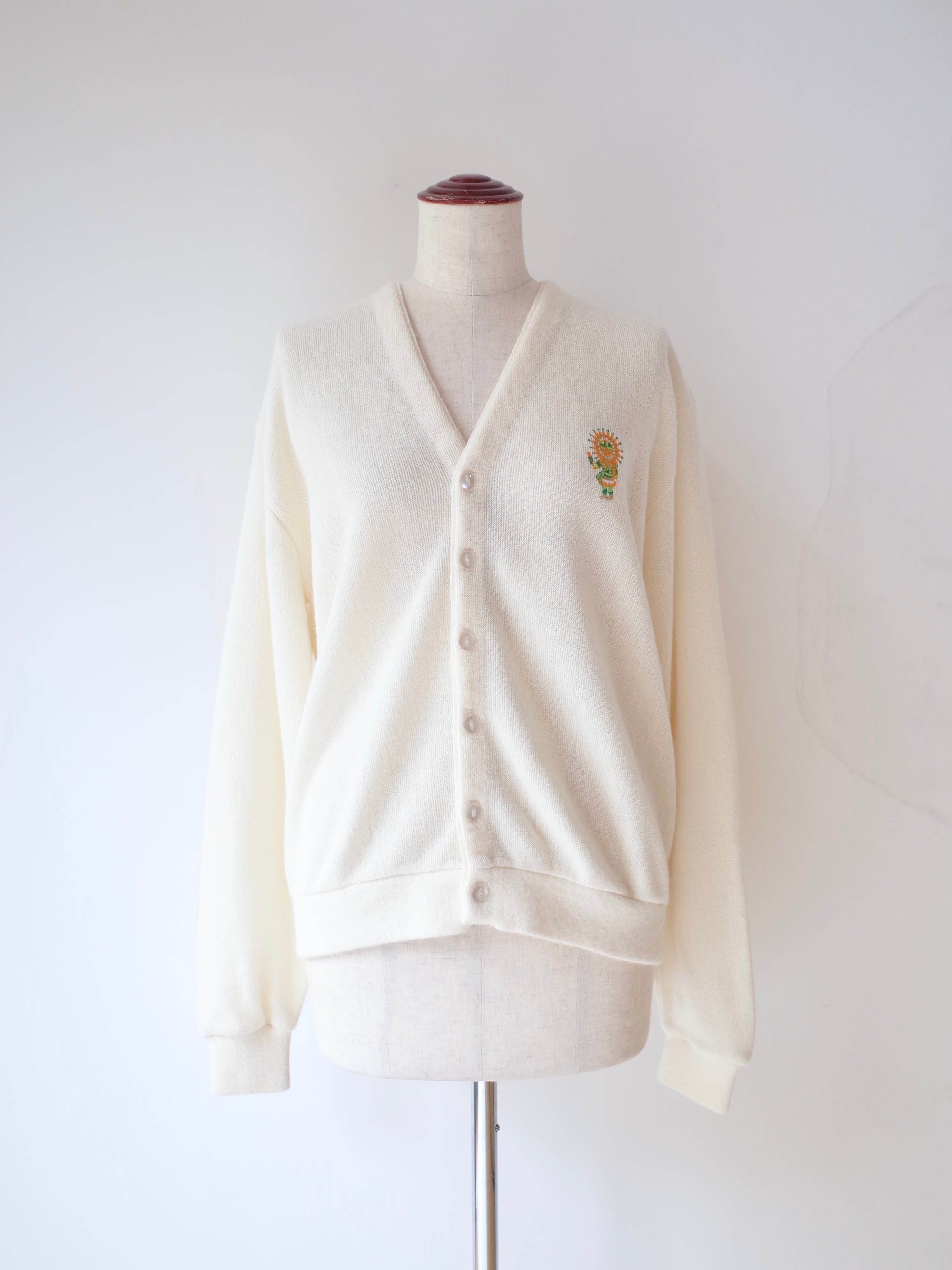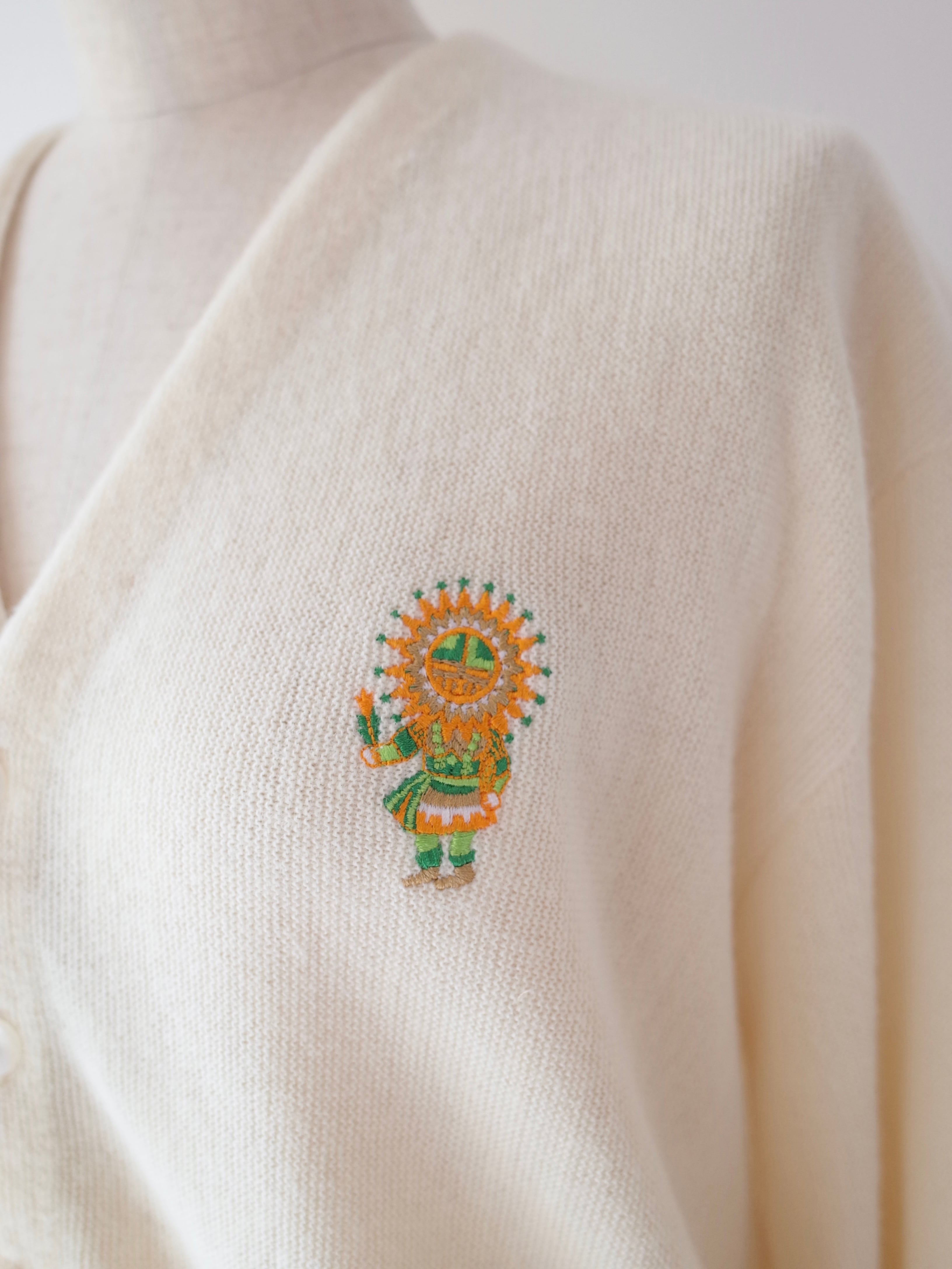 ・70〜80年代アメリカ製、生成りカラーのニットにネイティブアメリカンのカッチーナモチーフ刺繍がワンポイントで施された一着