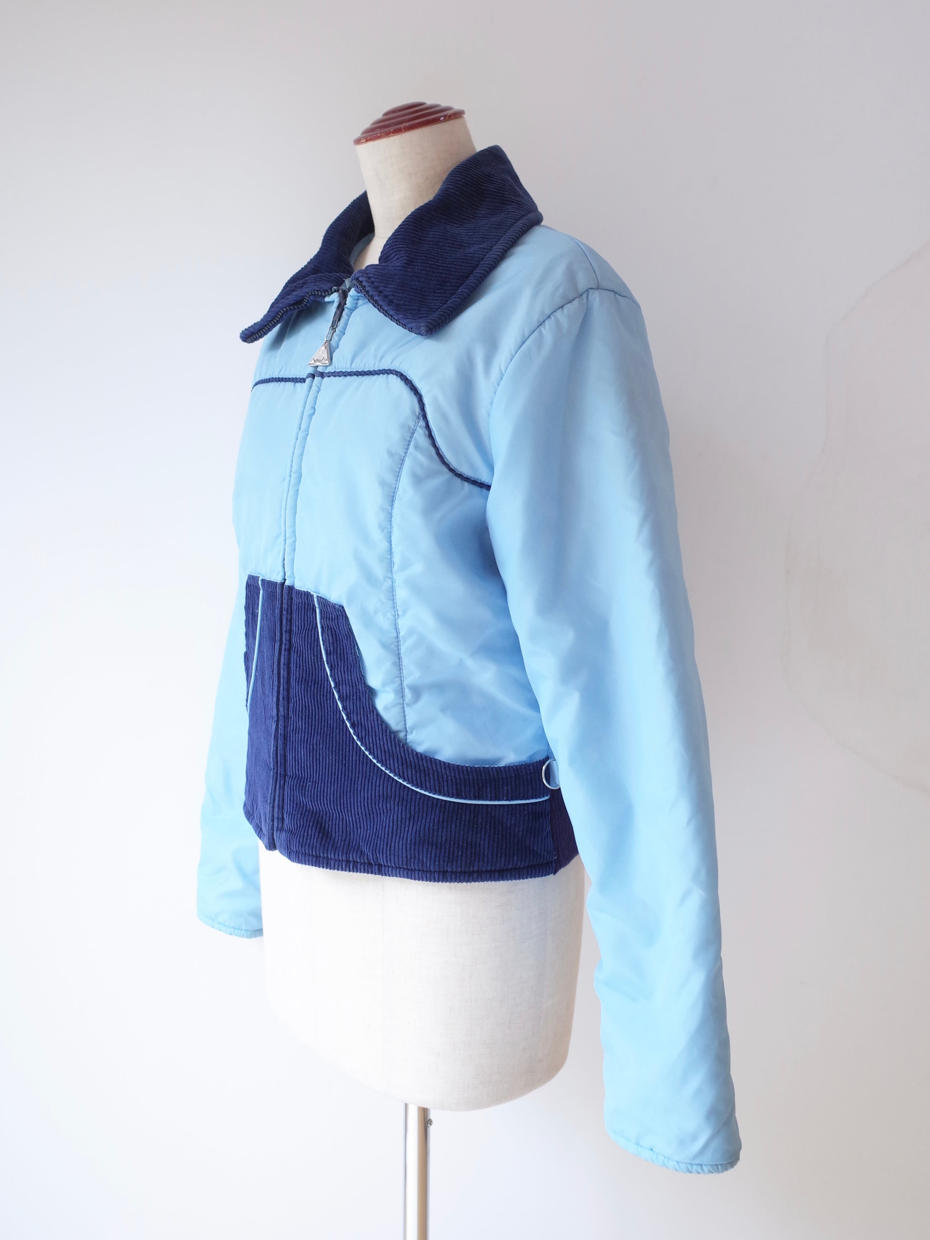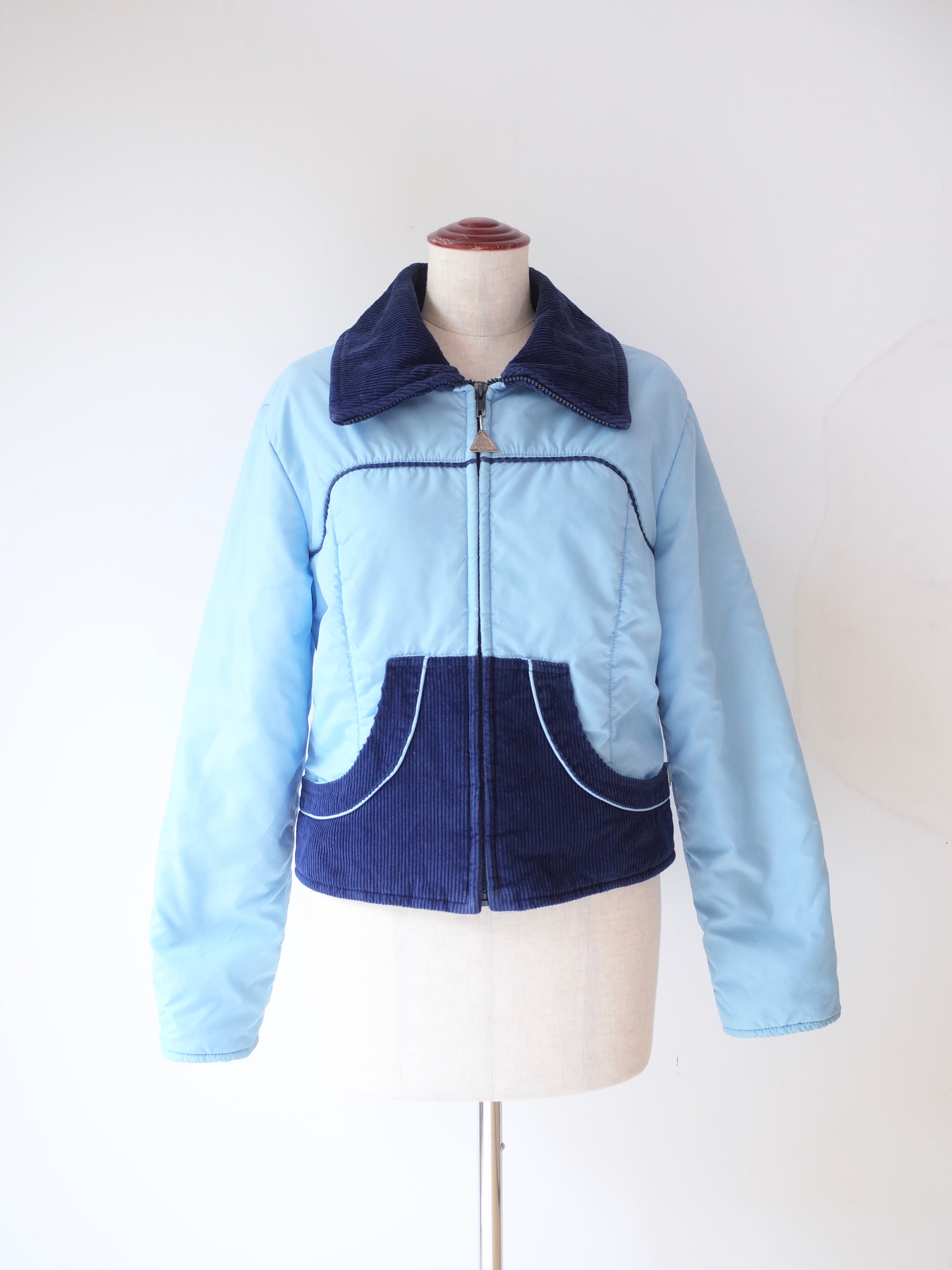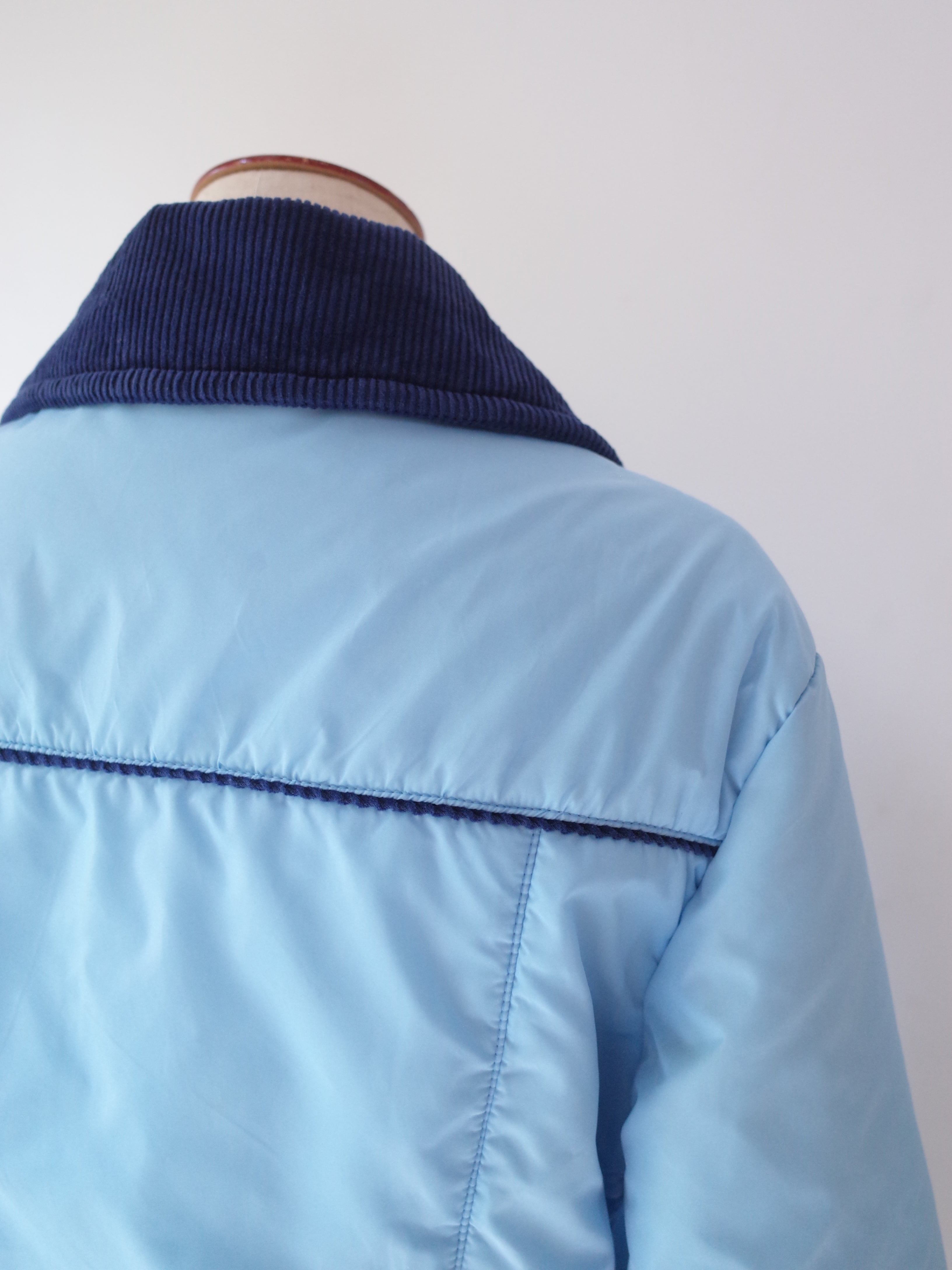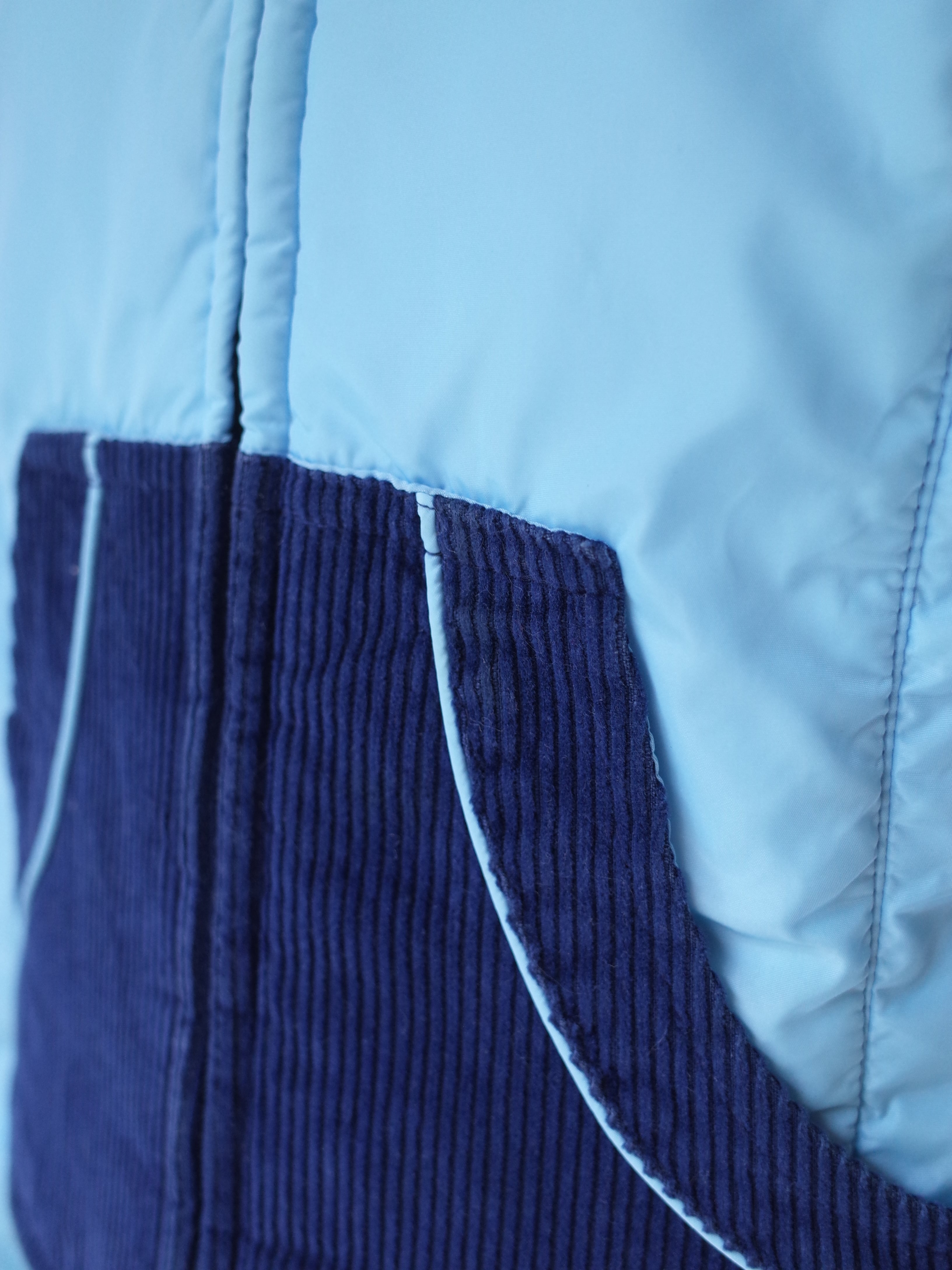 ・淡いライトブルーのボディに、ネイビーのコーデュロイ襟とポケットを組み合わせた、コントラストの効いたデザインが印象的