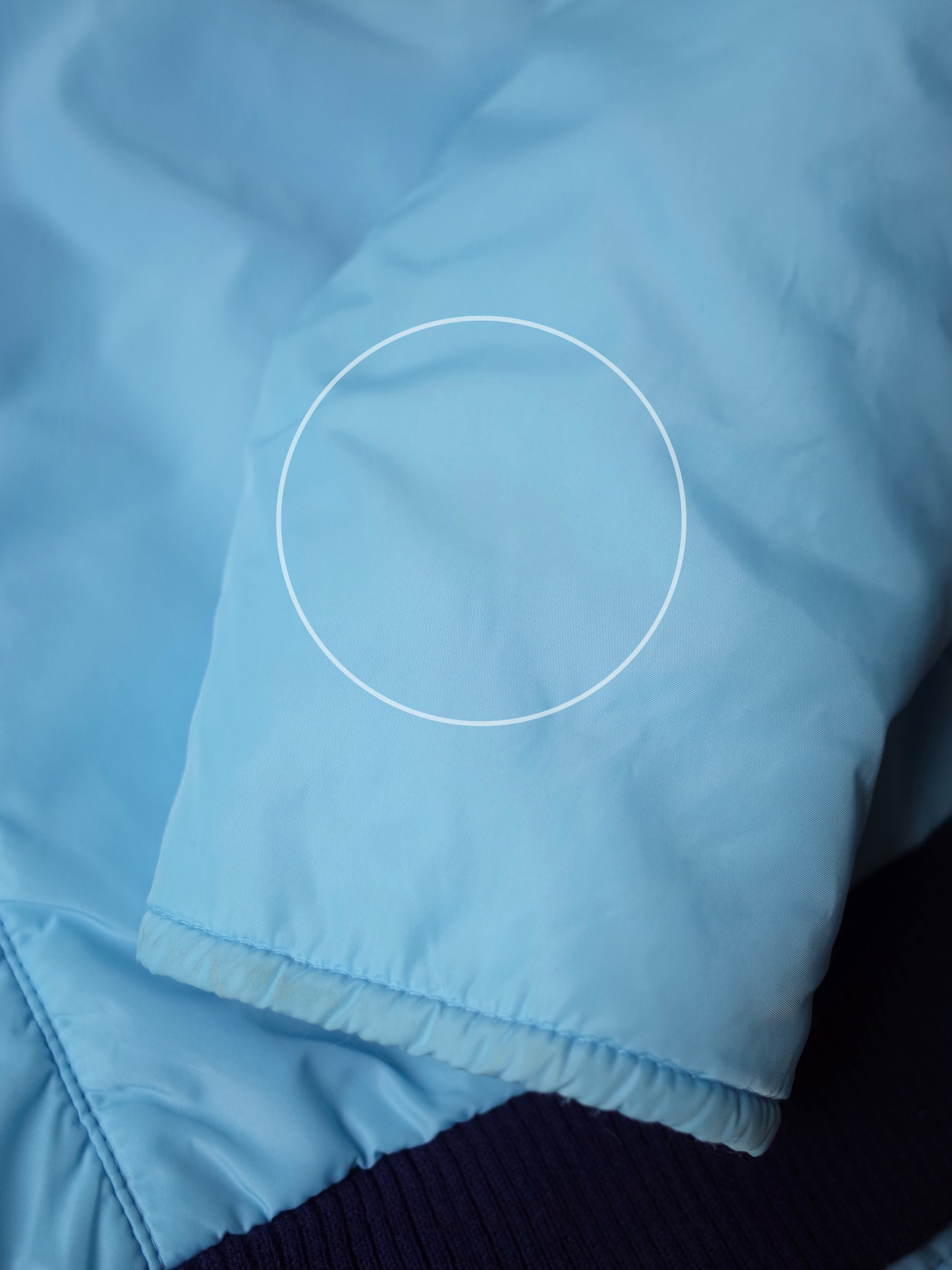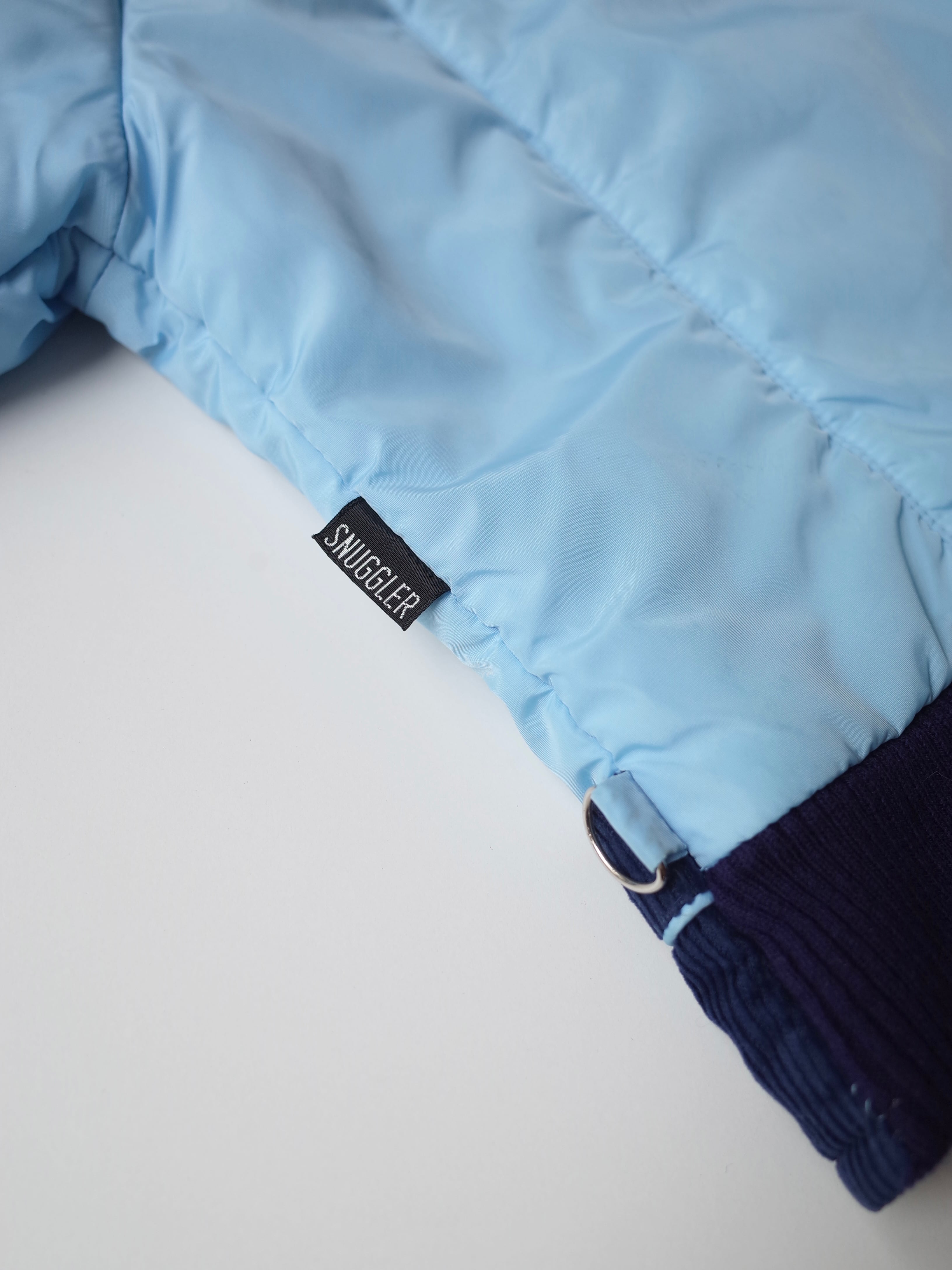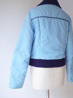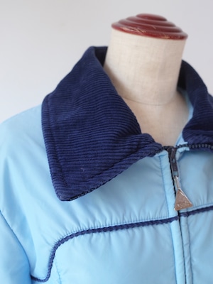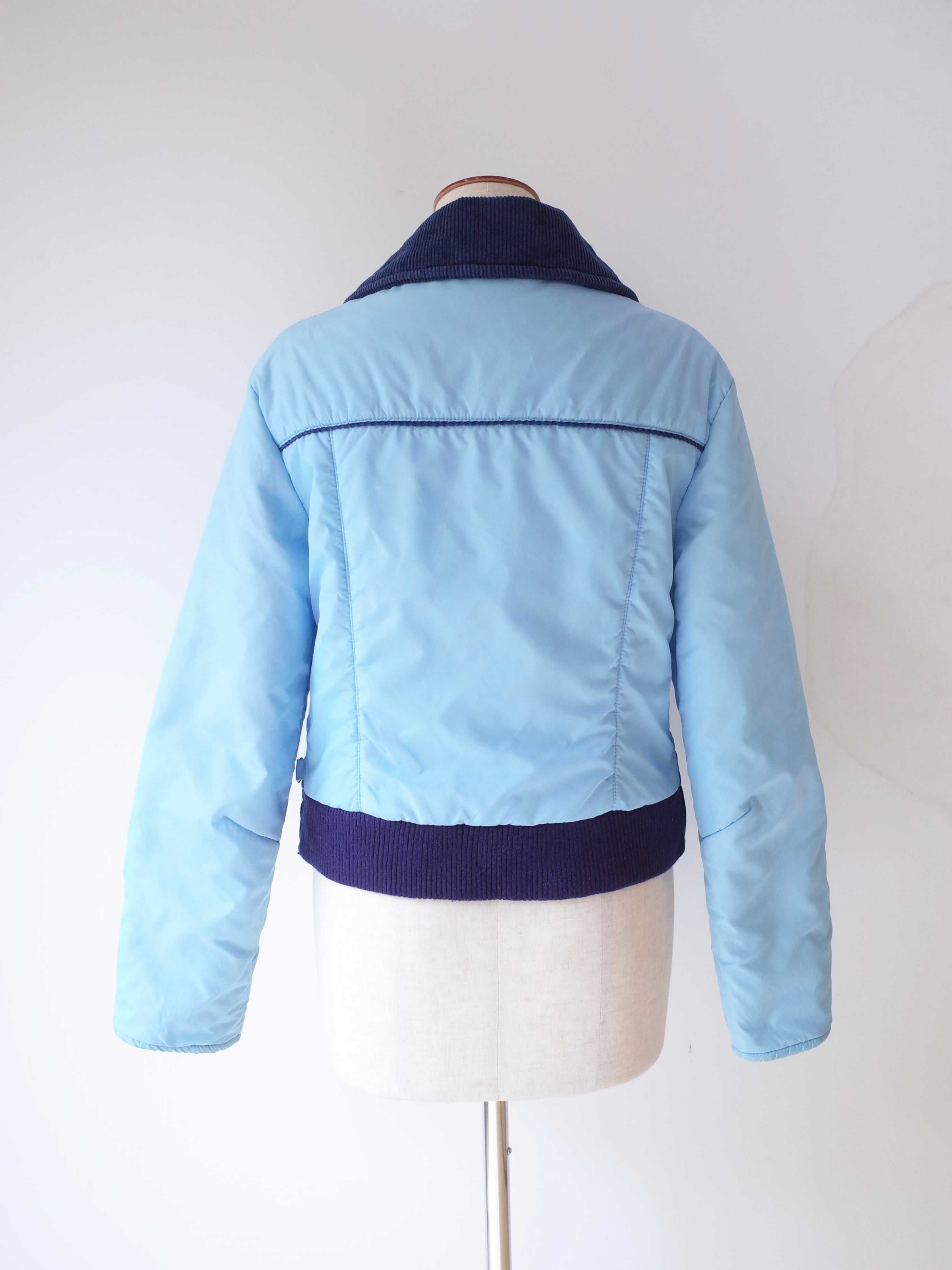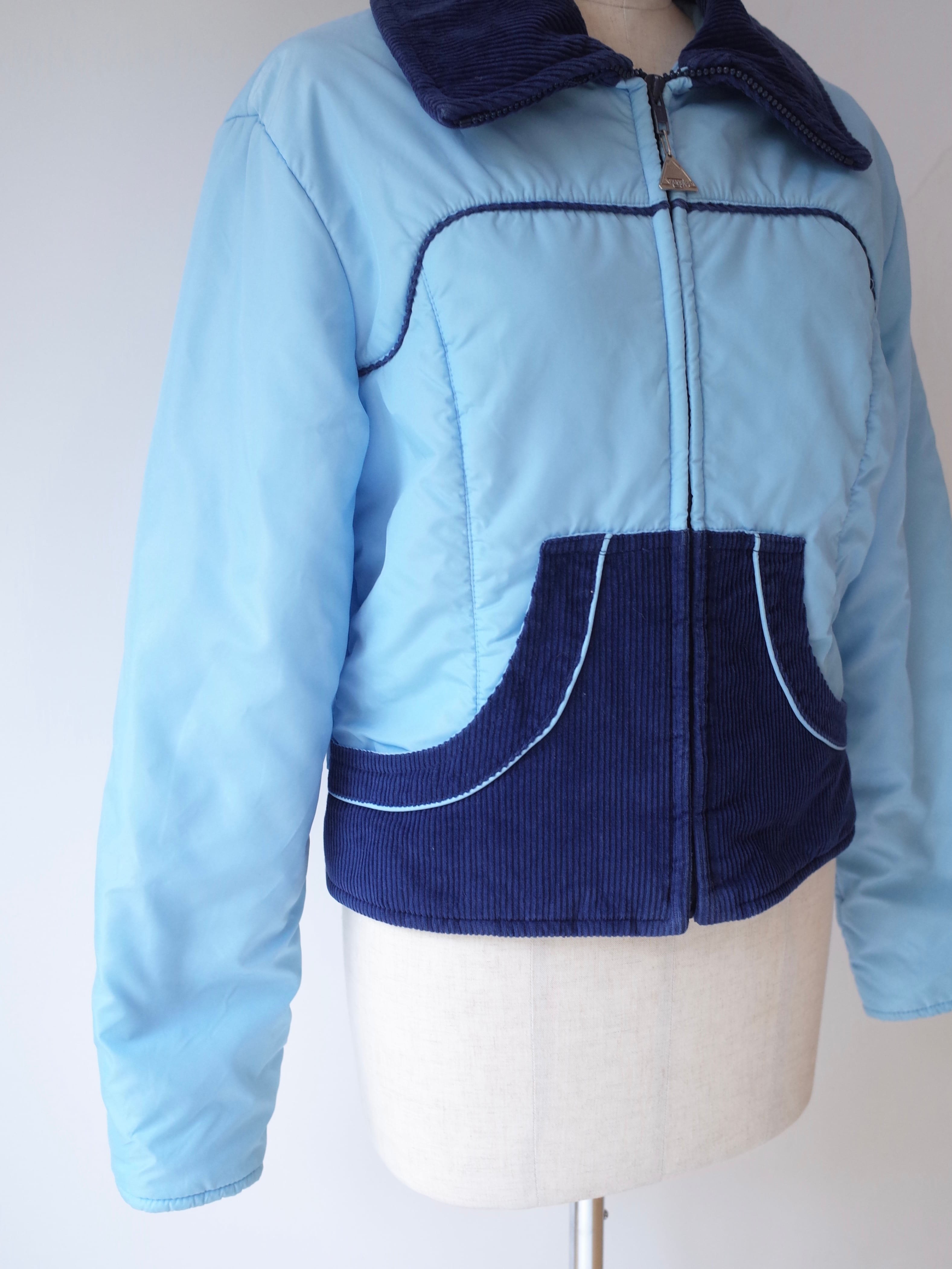 ・淡いライトブルーのボディに、ネイビーのコーデュロイ襟とポケットを組み合わせた、コントラストの効いたデザインが印象的