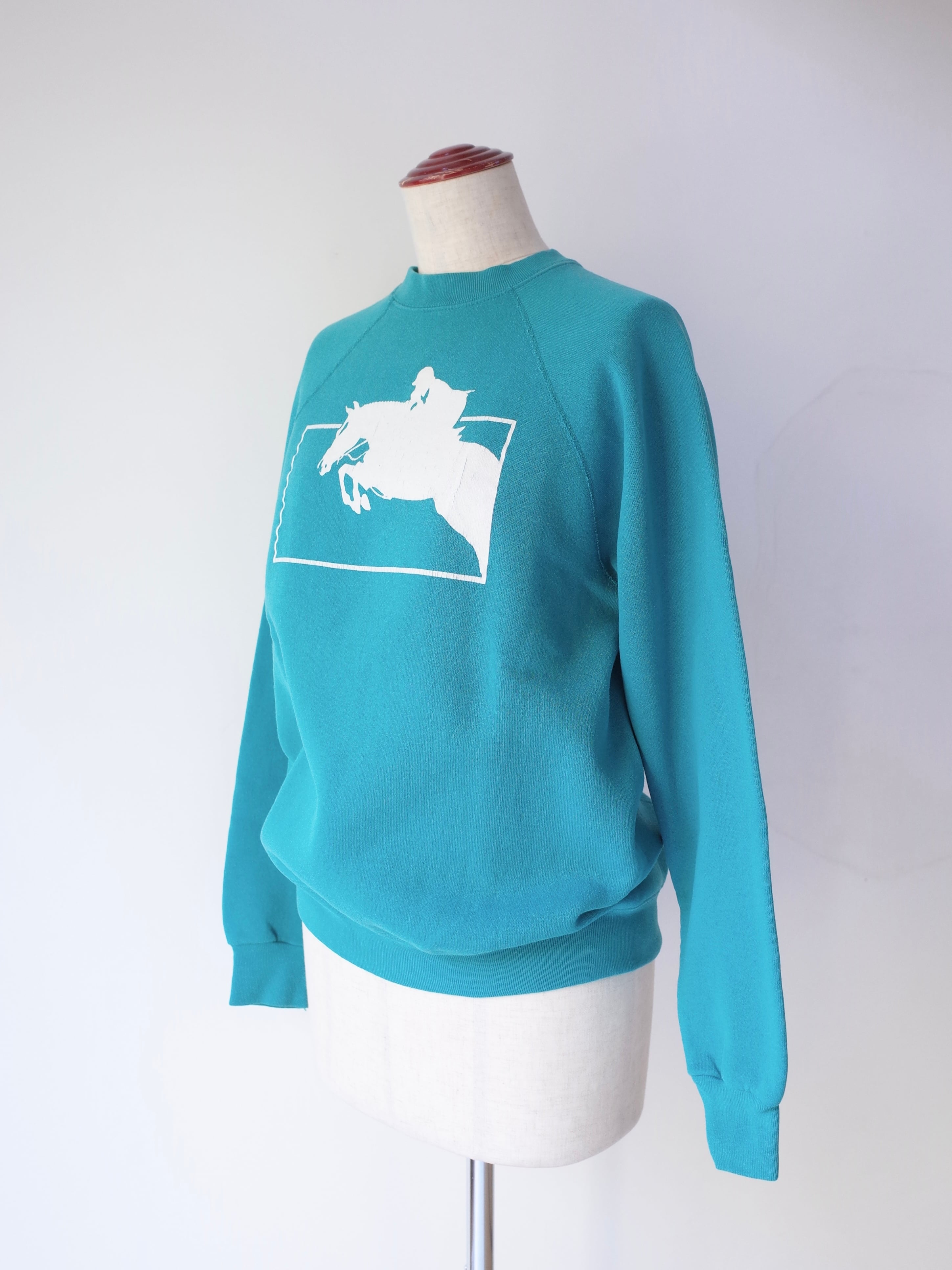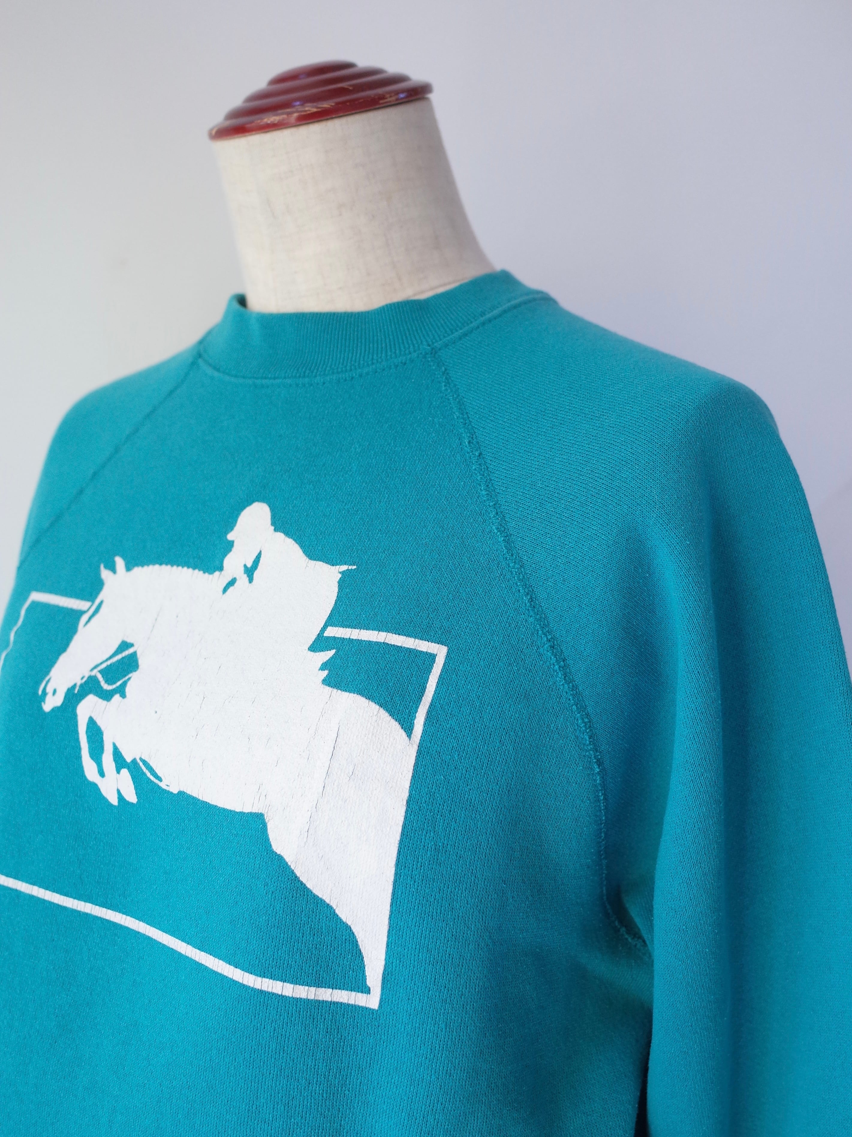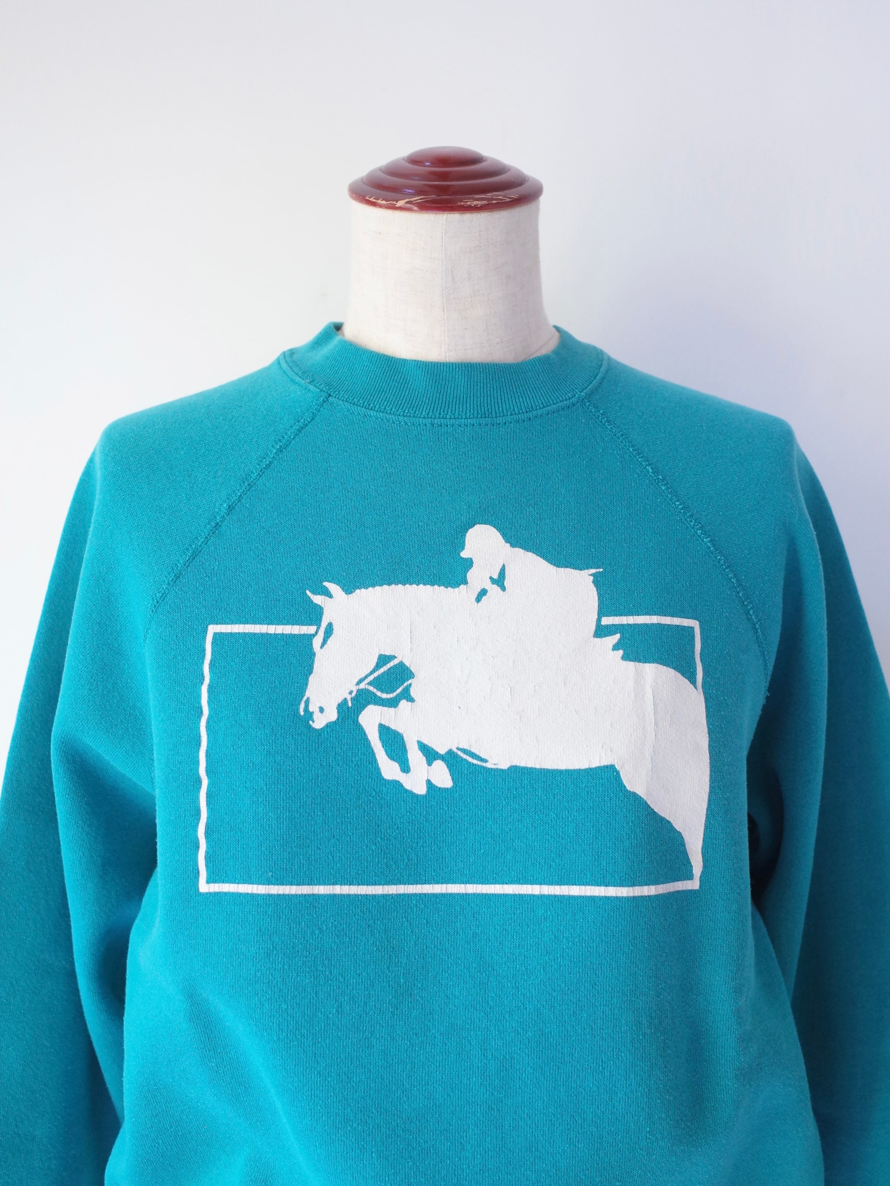 ・フロントには乗馬モチーフのプリントが施され、US古着らしいターコイズブルーのカラーが良い雰囲気の一枚