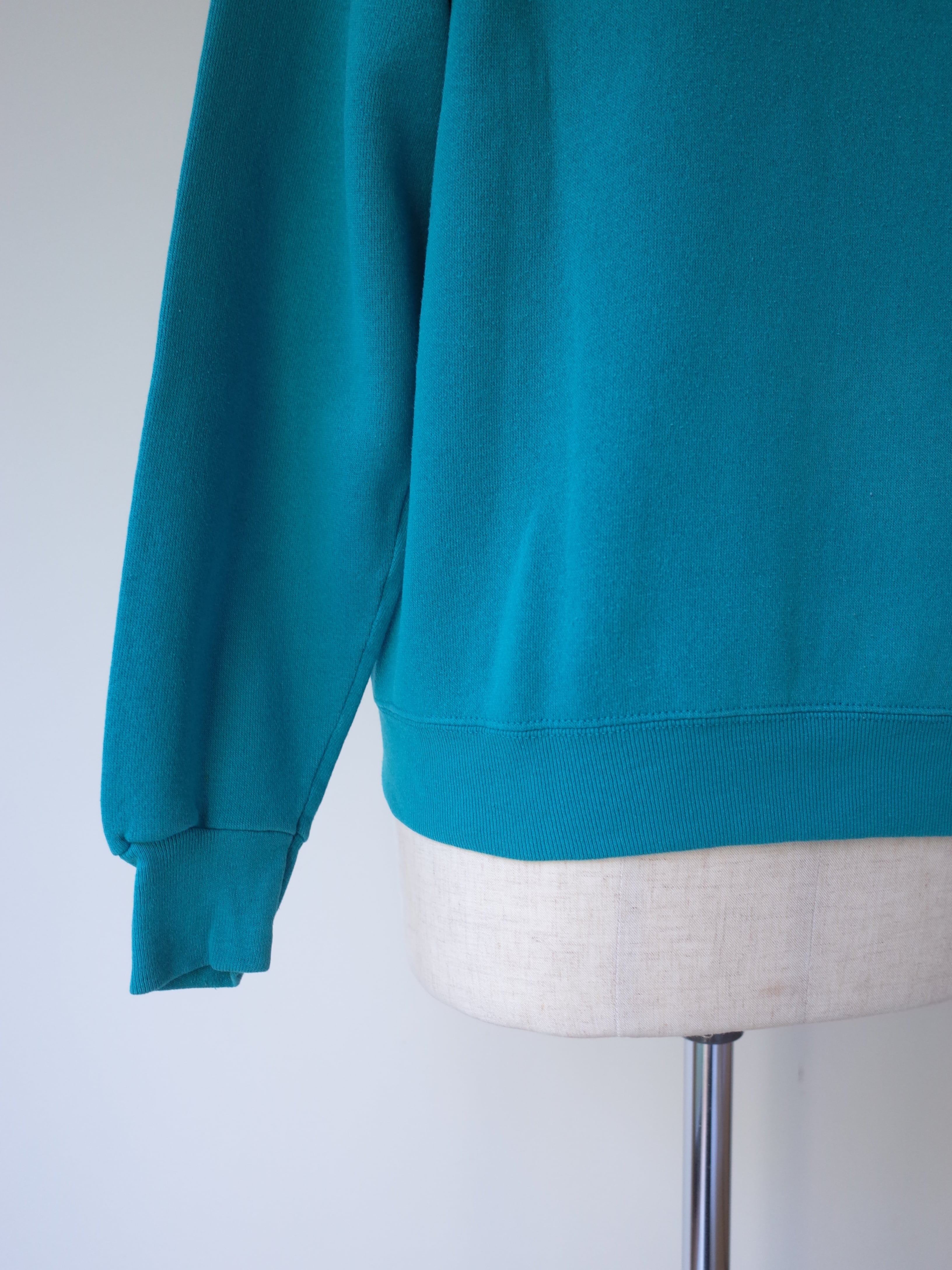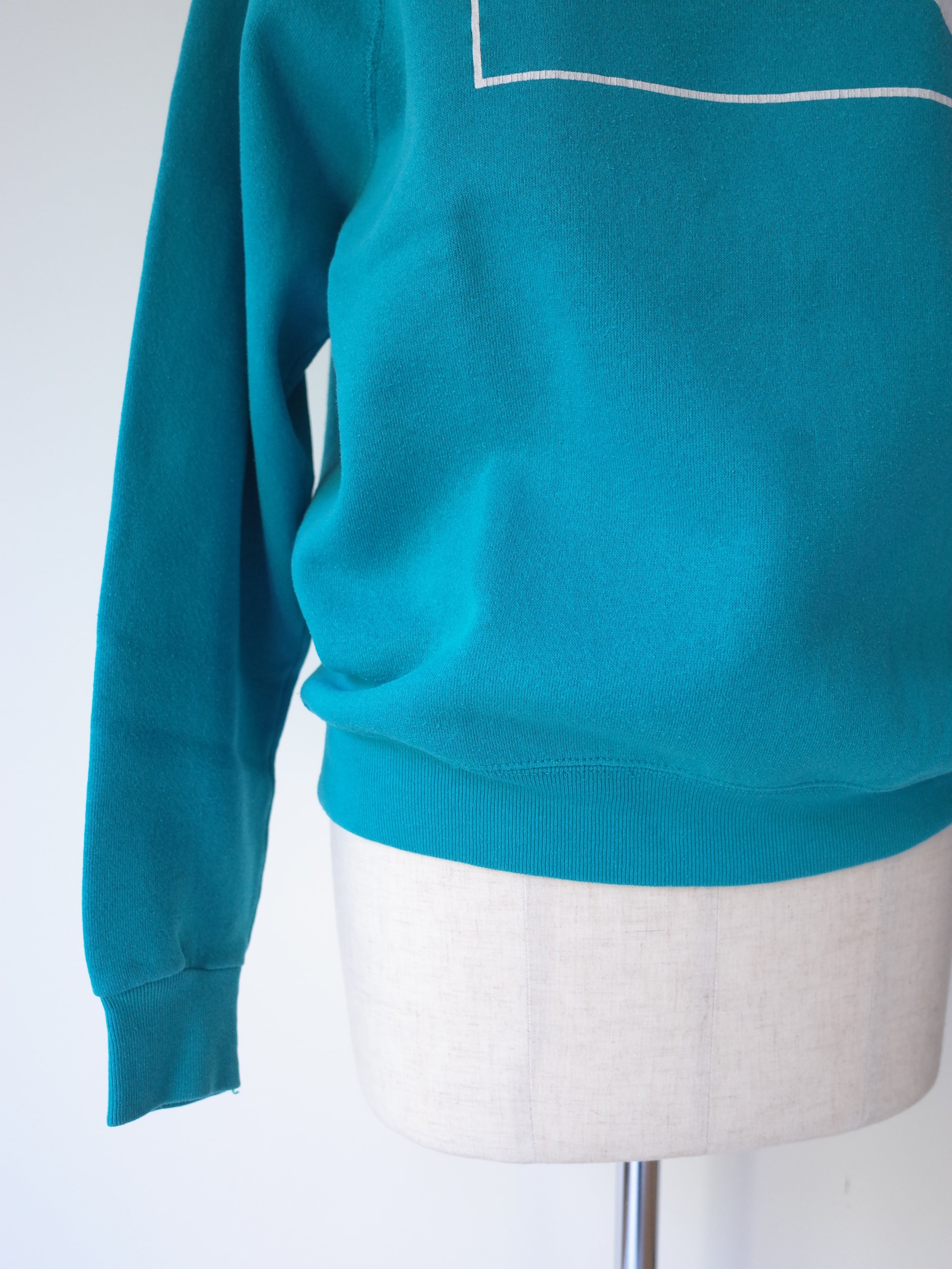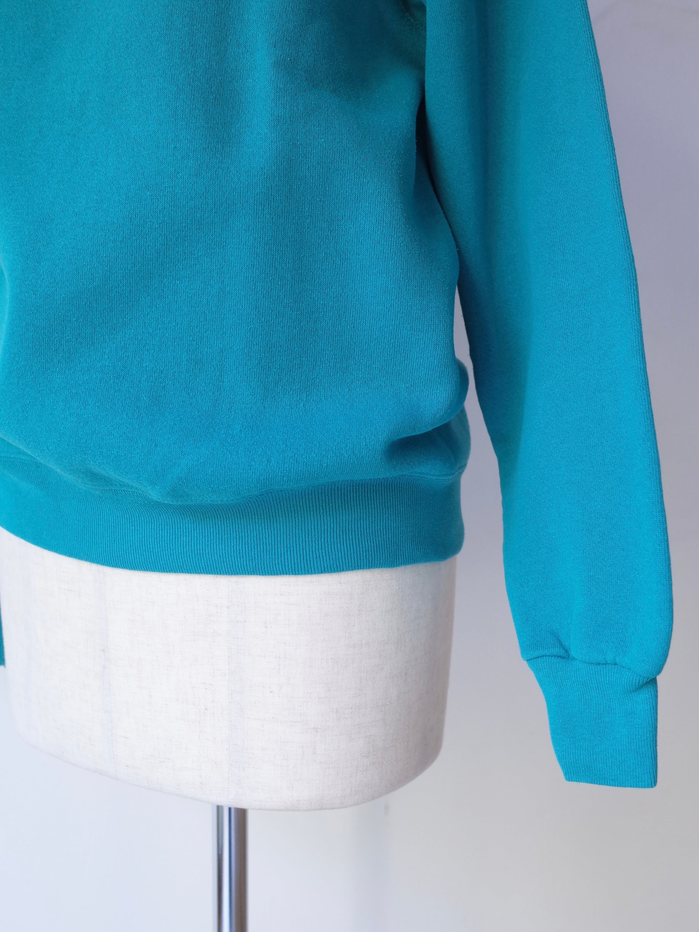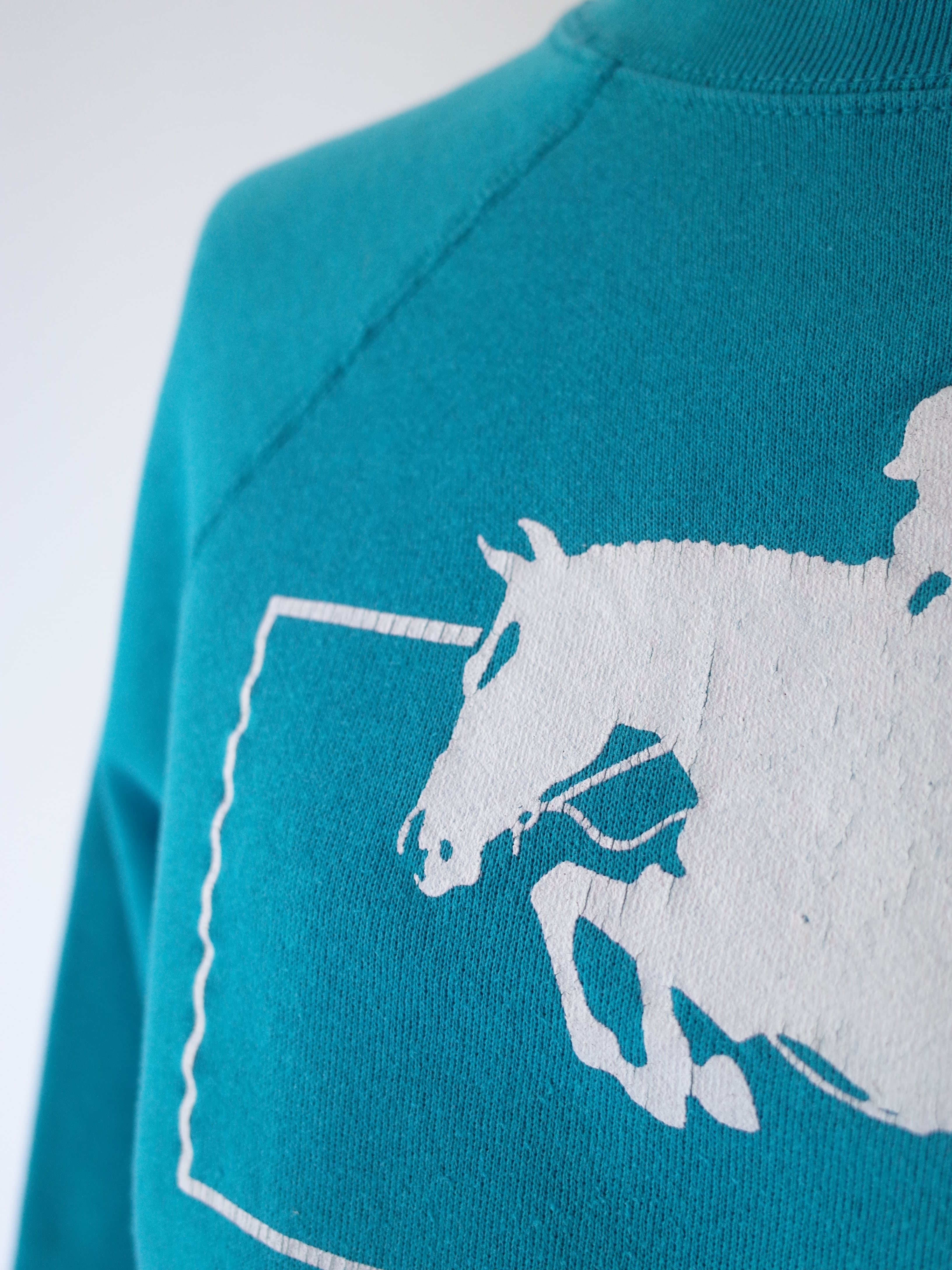 ・フロントには乗馬モチーフのプリントが施され、US古着らしいターコイズブルーのカラーが良い雰囲気の一枚