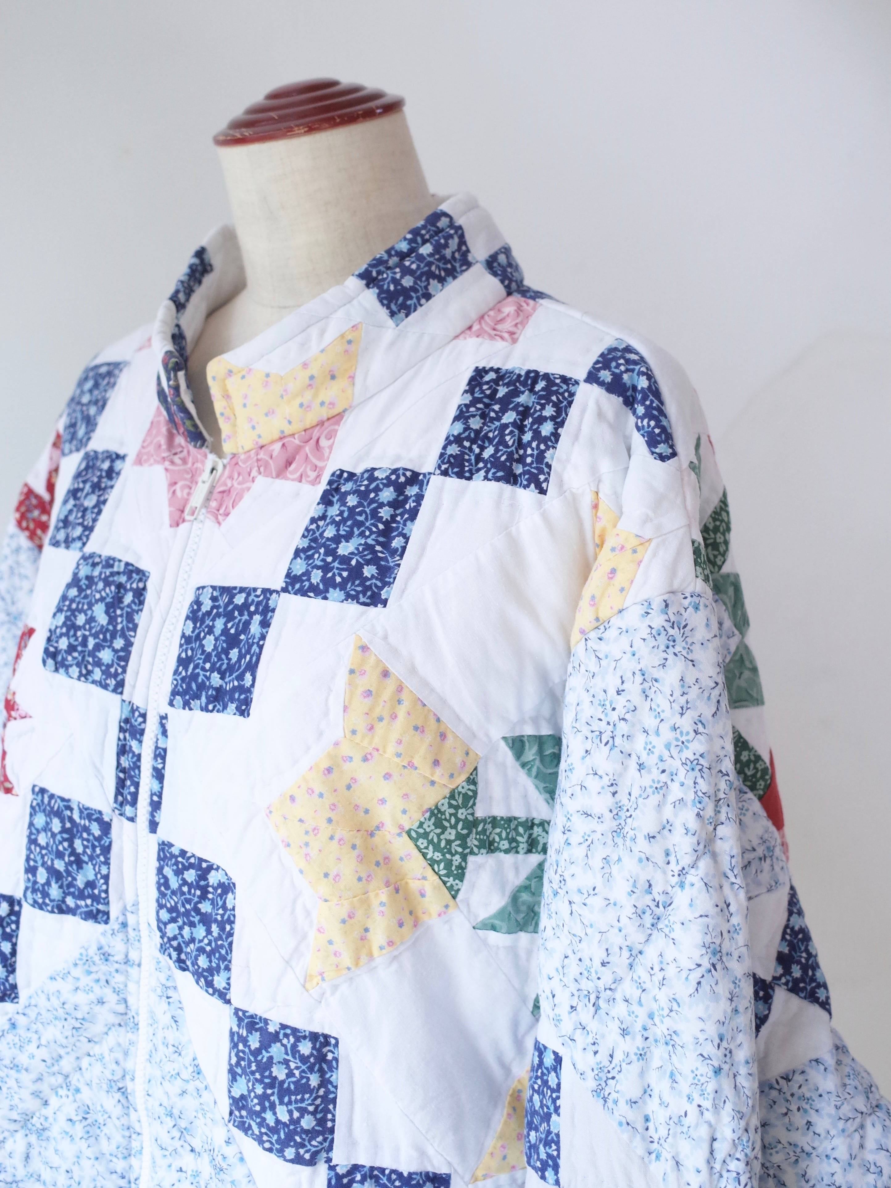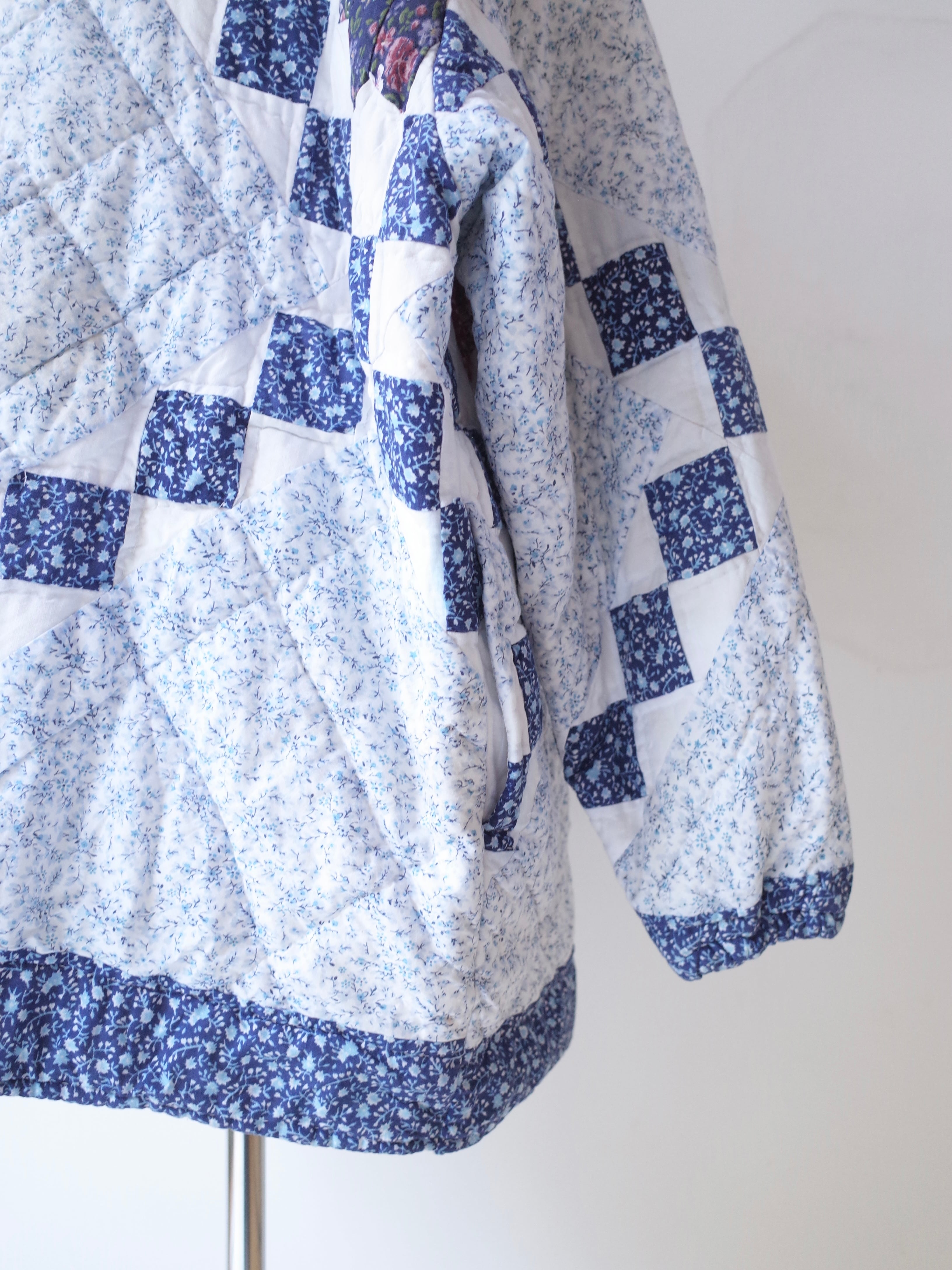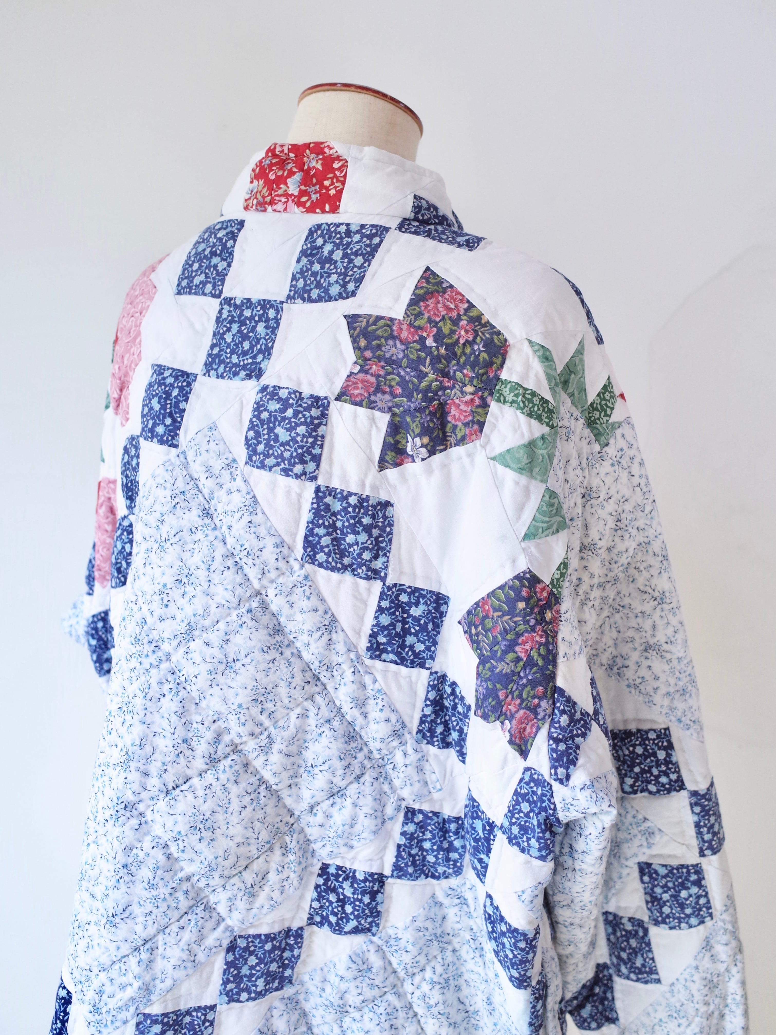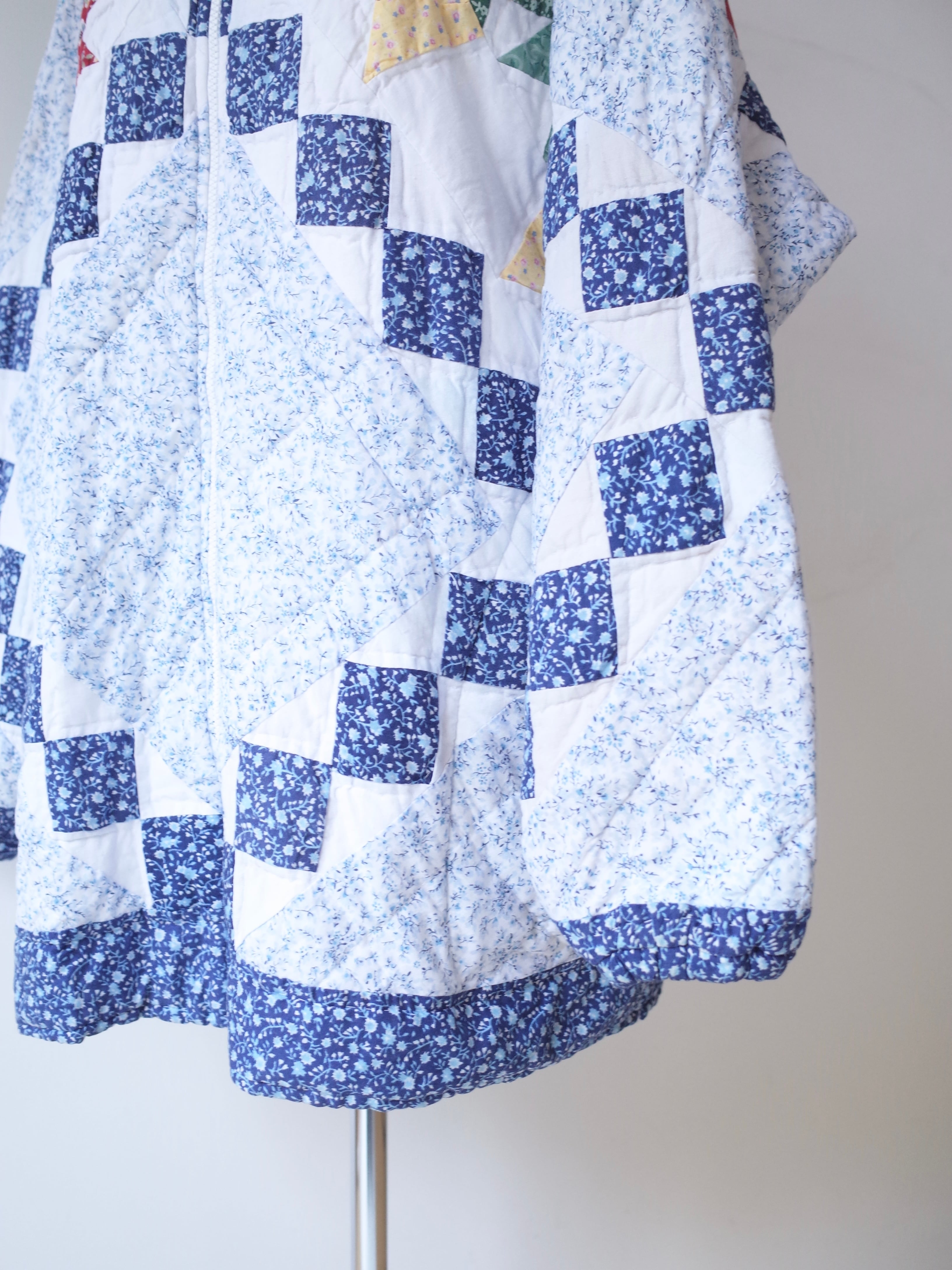 ・ブルーを基調にした細かなフローラル生地を組み合わせた、クラシックなアメリカンキルトパターンが特徴的な一着