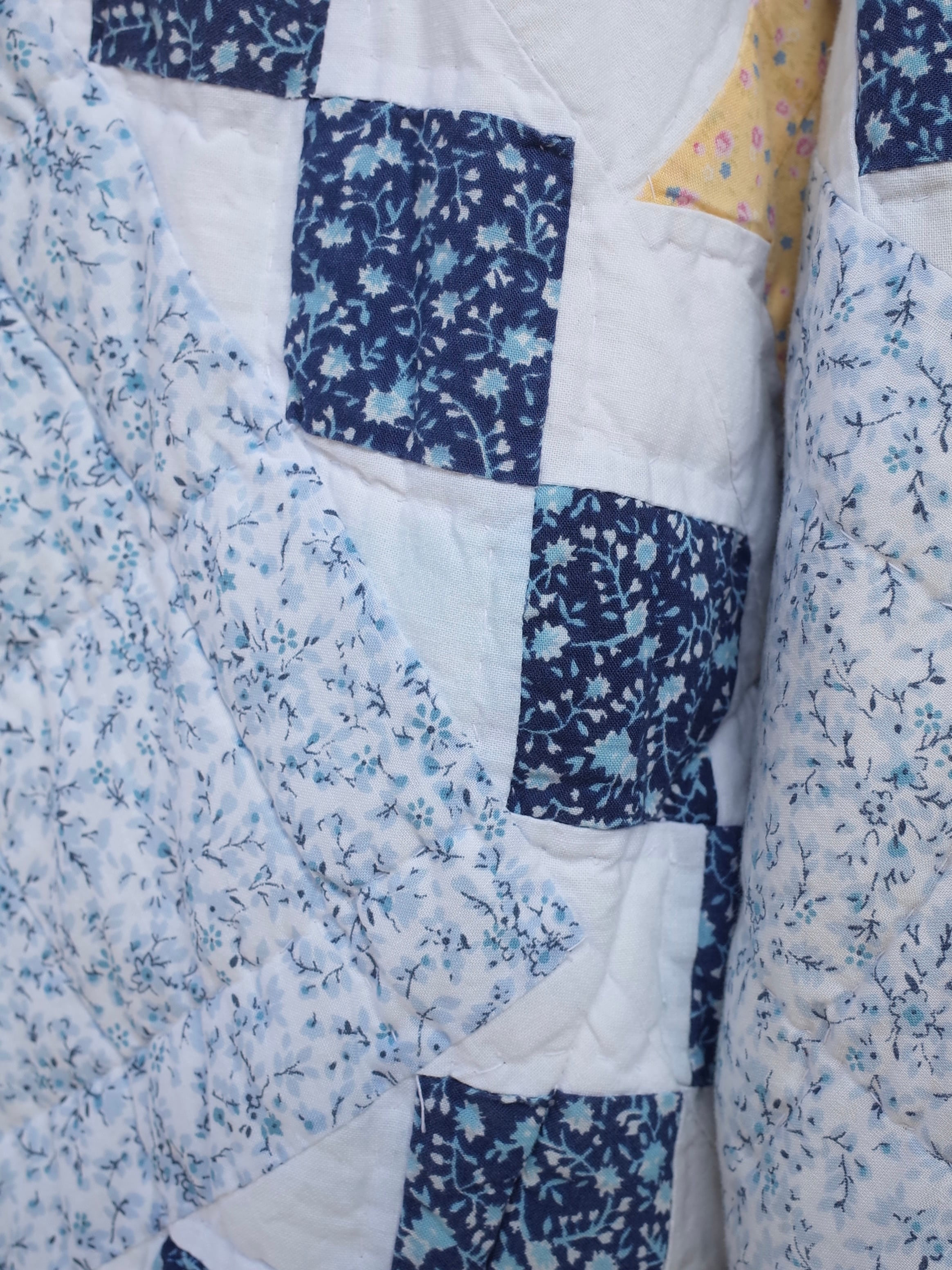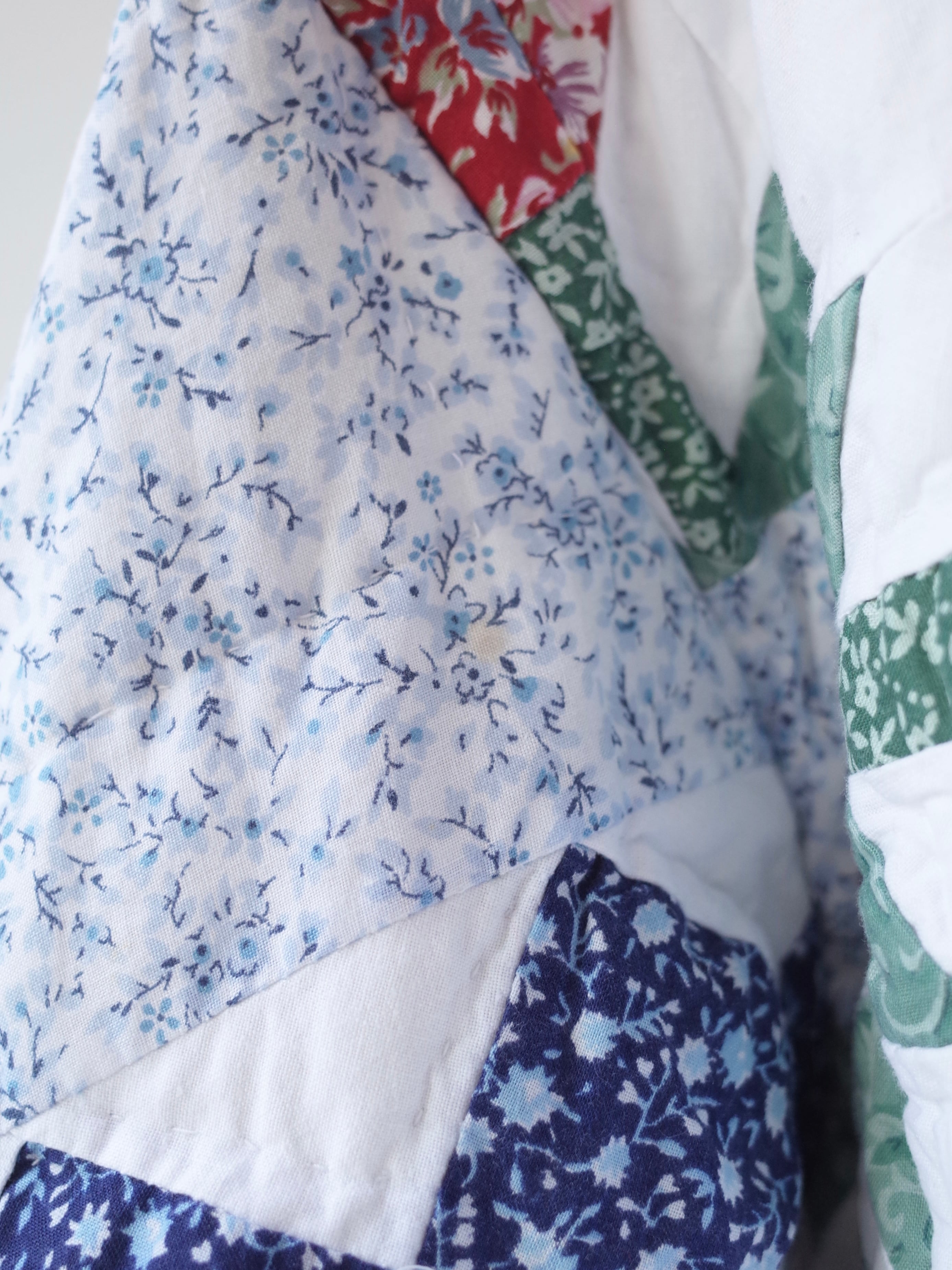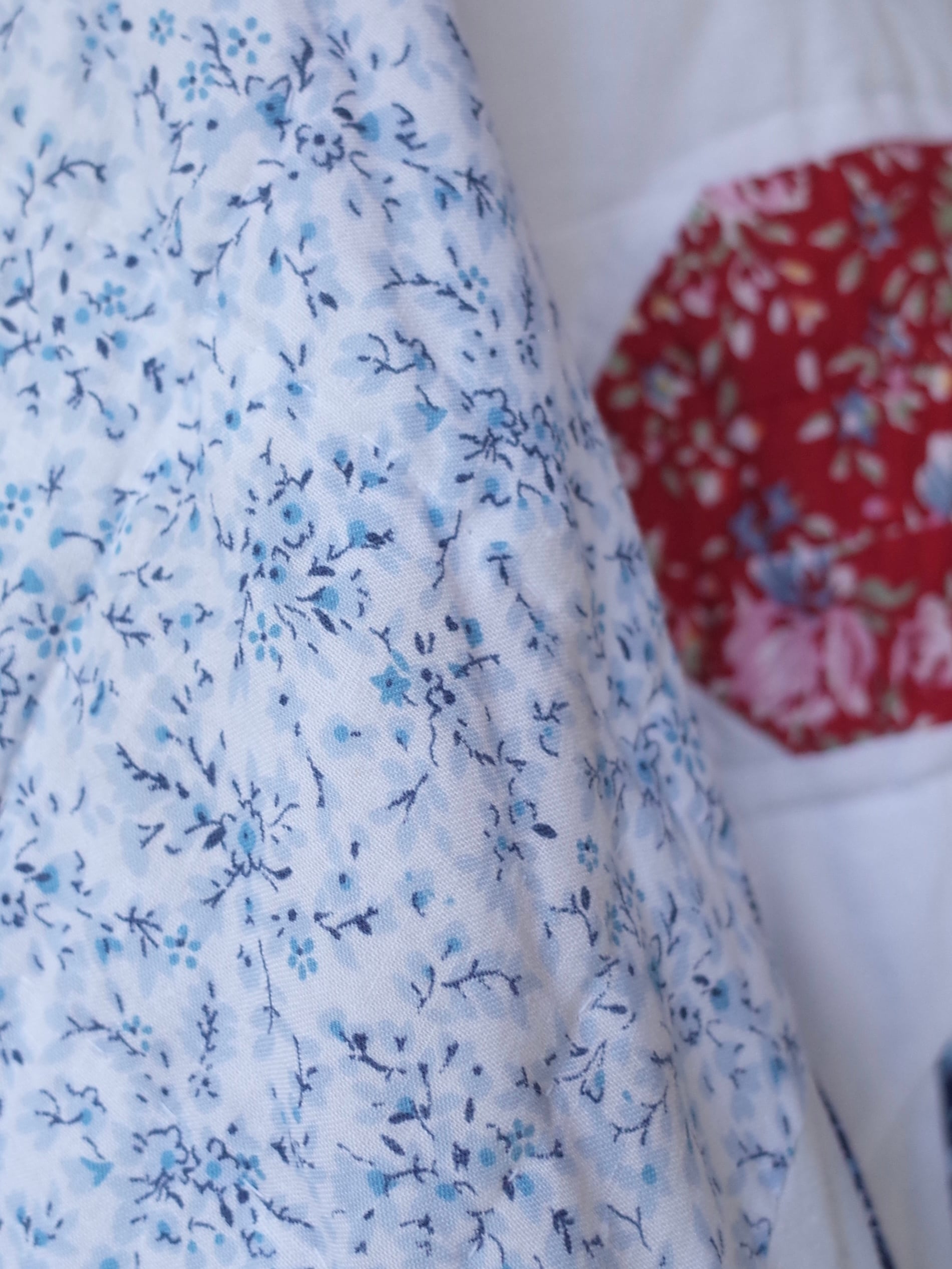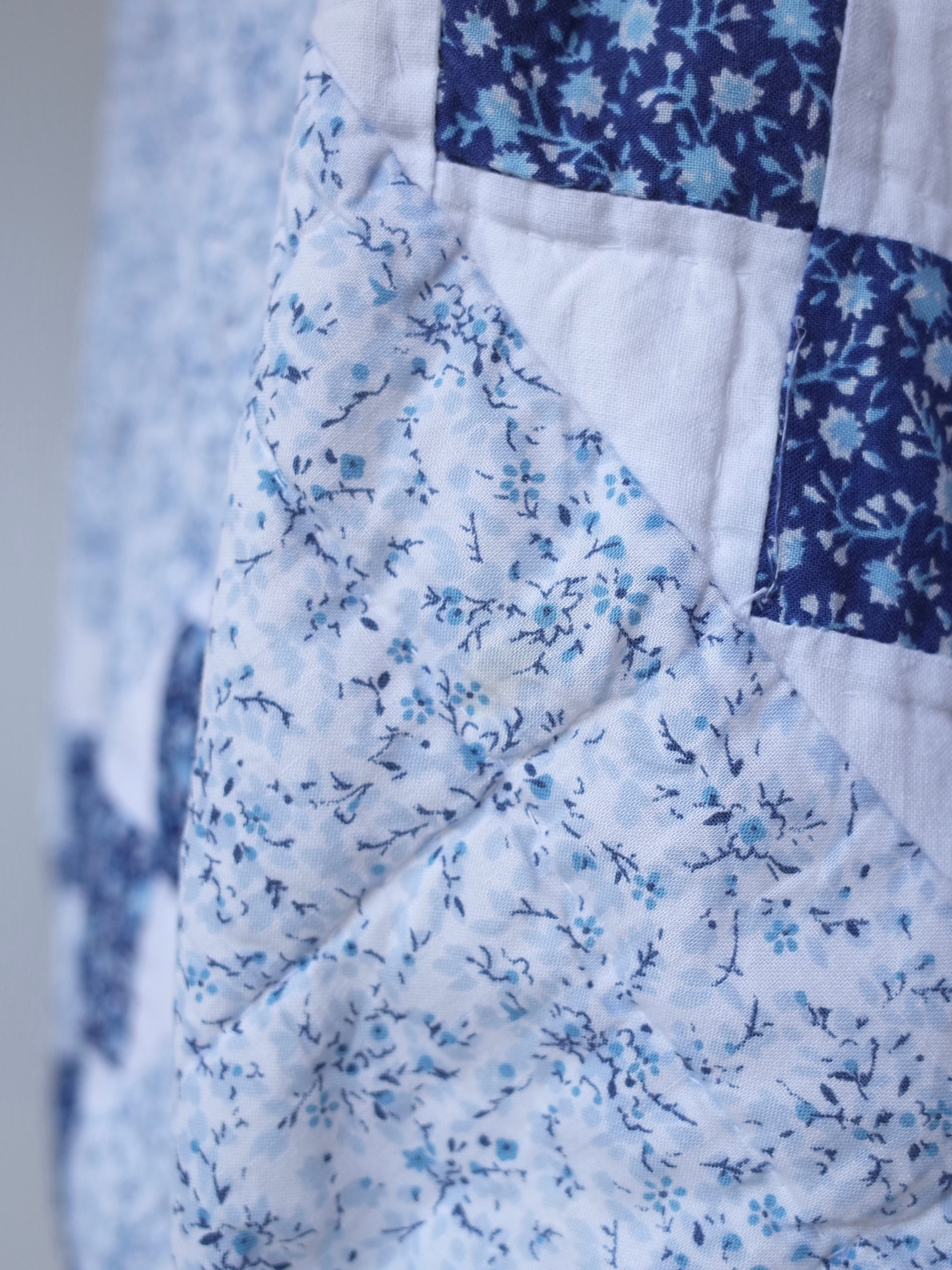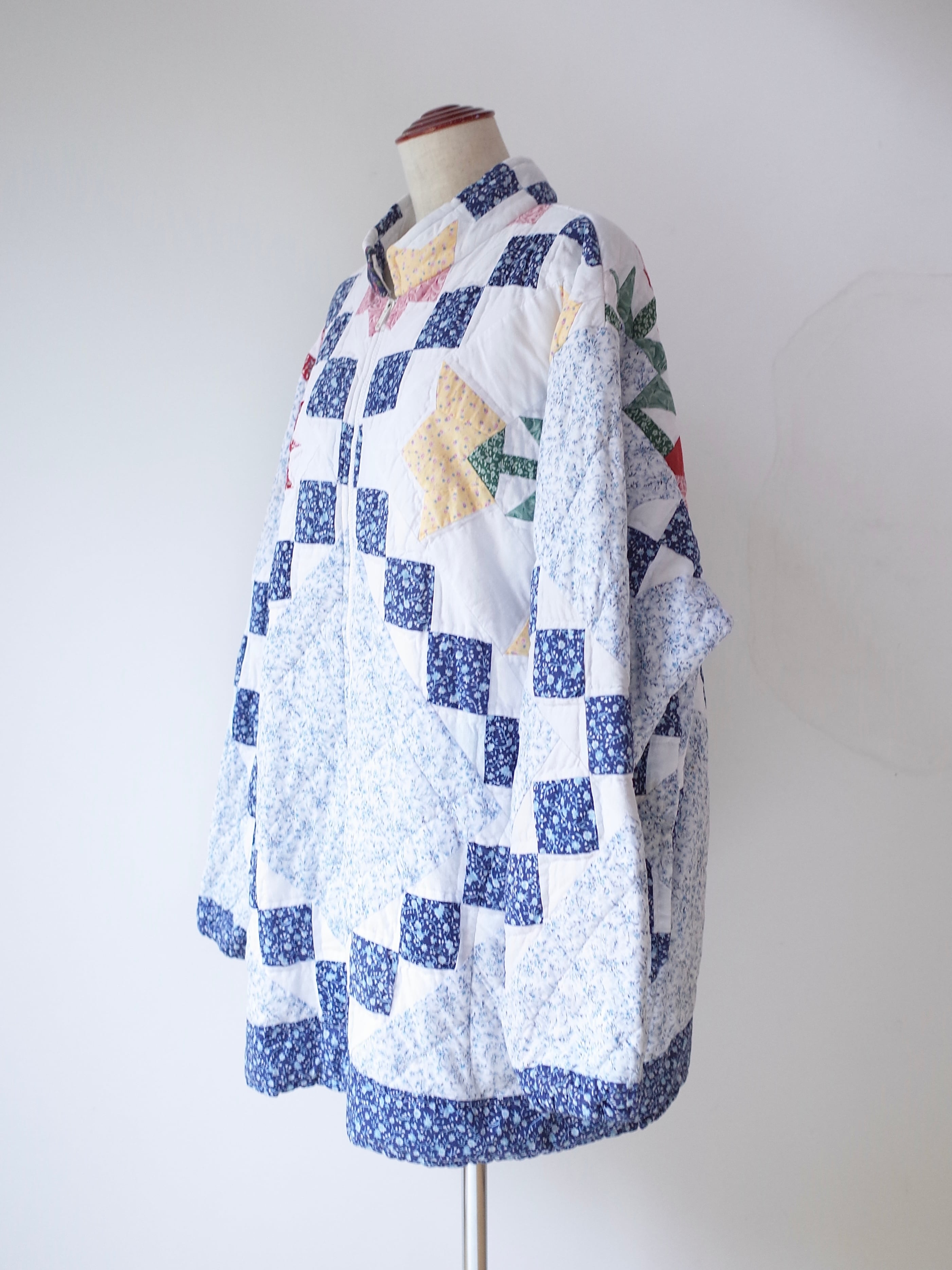・ブルーを基調にした細かなフローラル生地を組み合わせた、クラシックなアメリカンキルトパターンが特徴的な一着