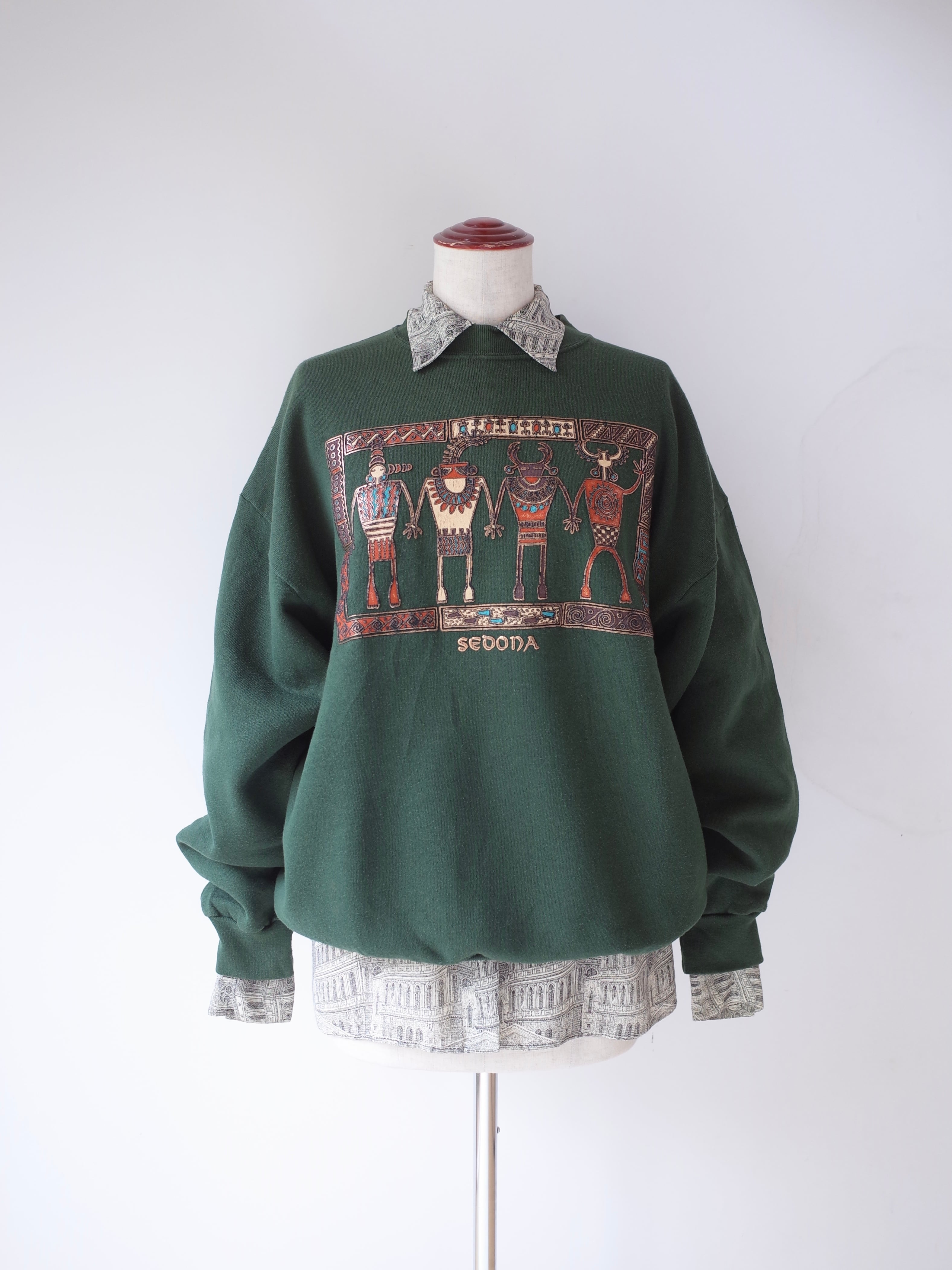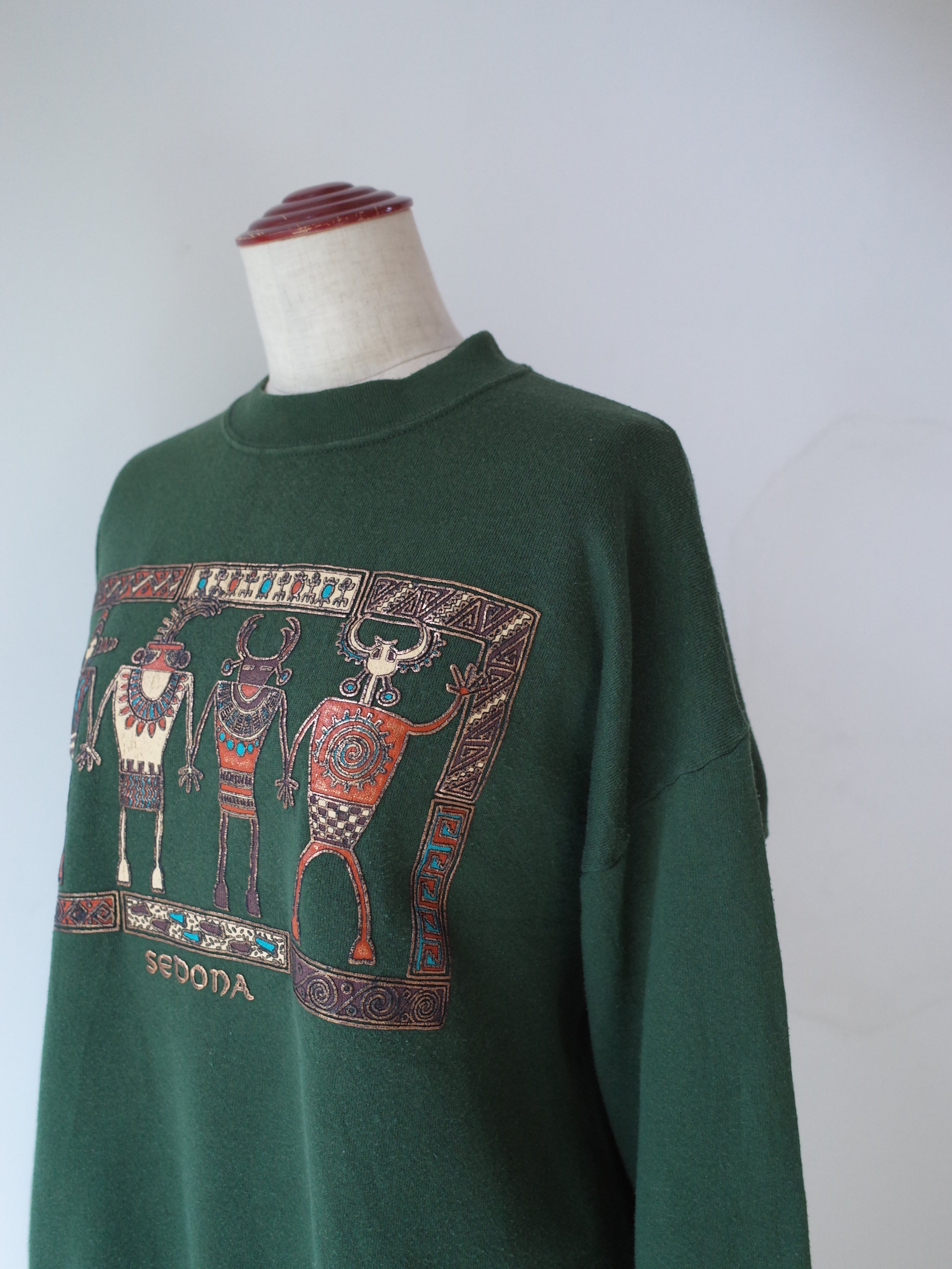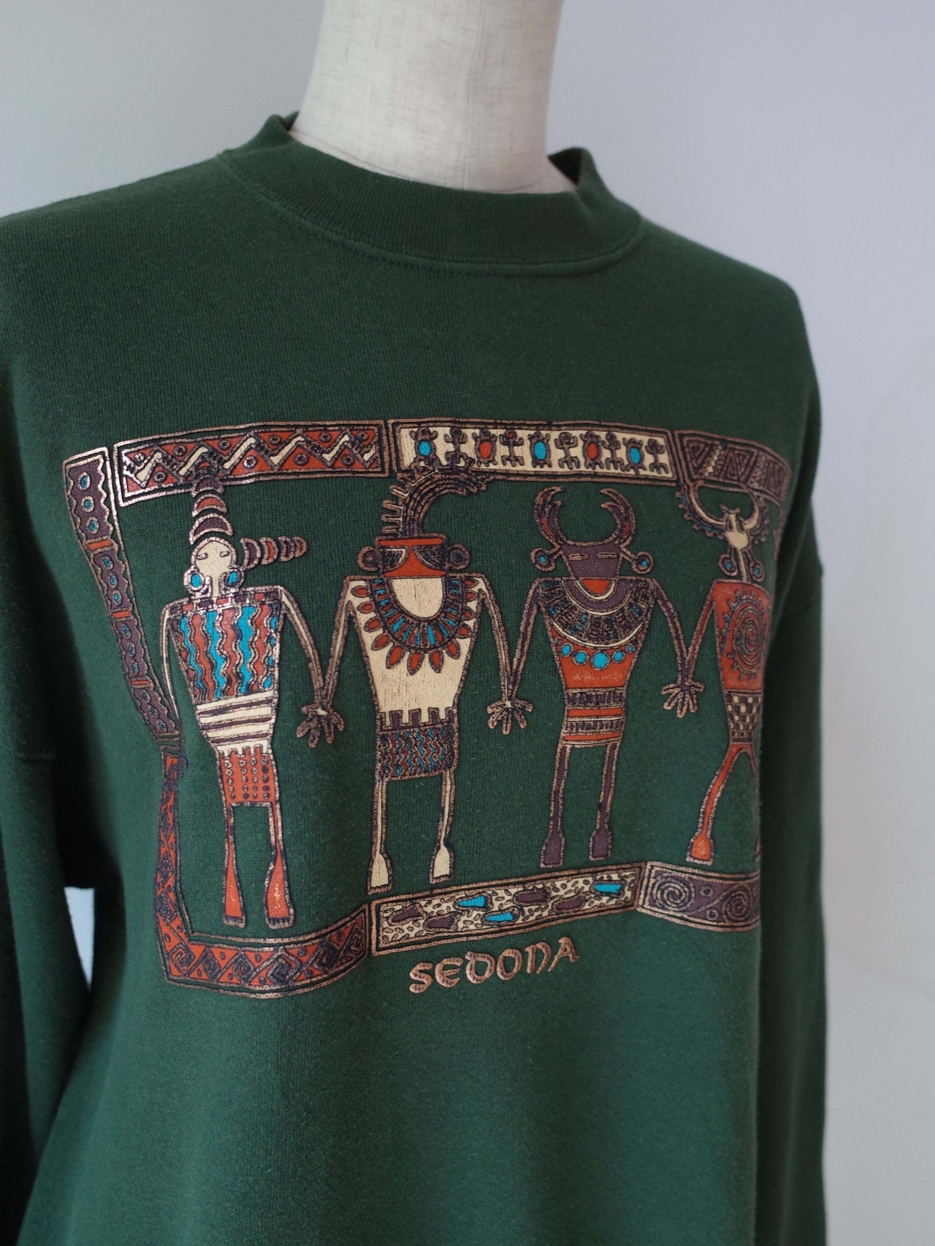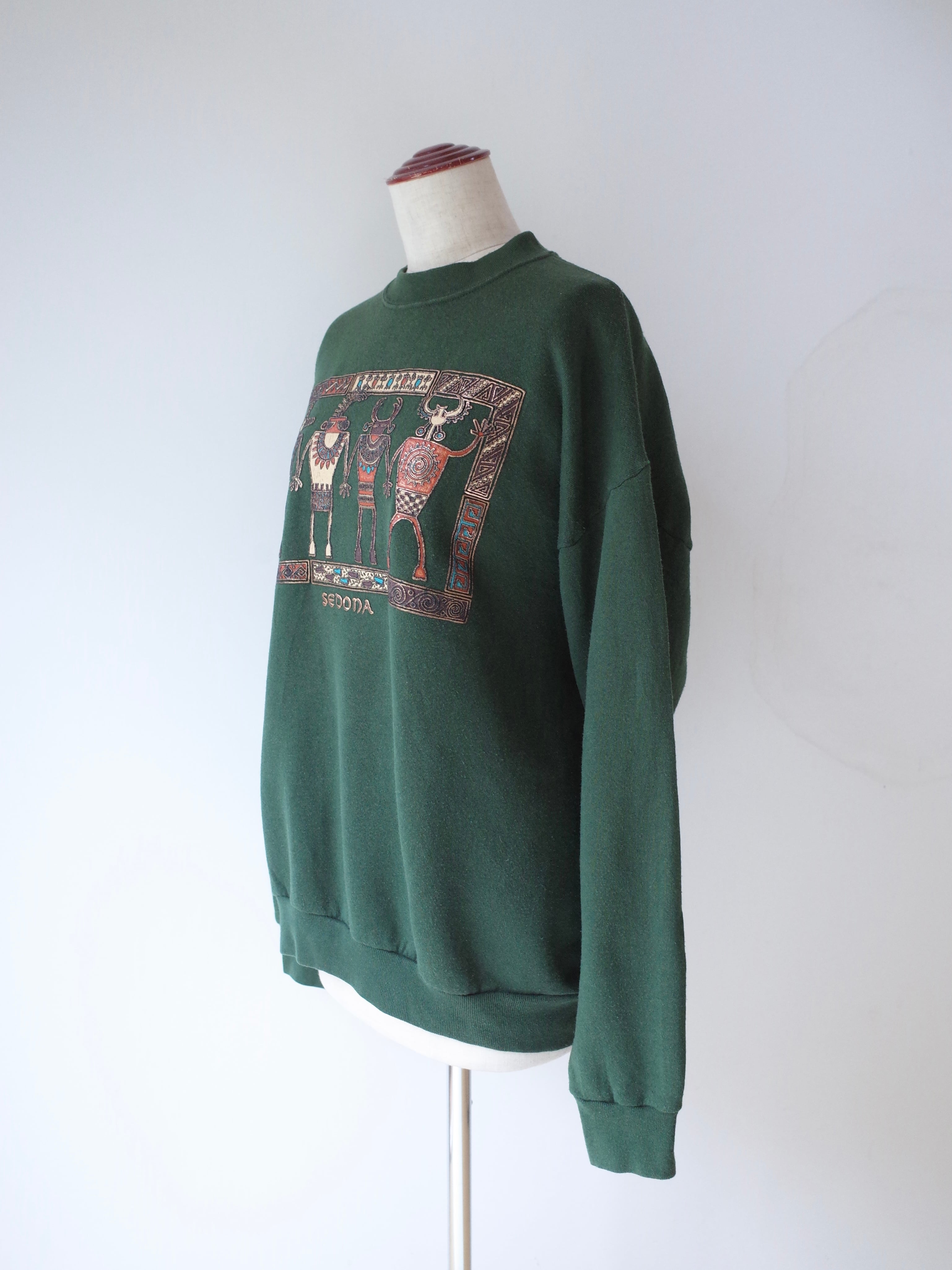 ・フォレストグリーンのボディにネイティブ調アートプリントが施されたセドナのスーベニアスウェット