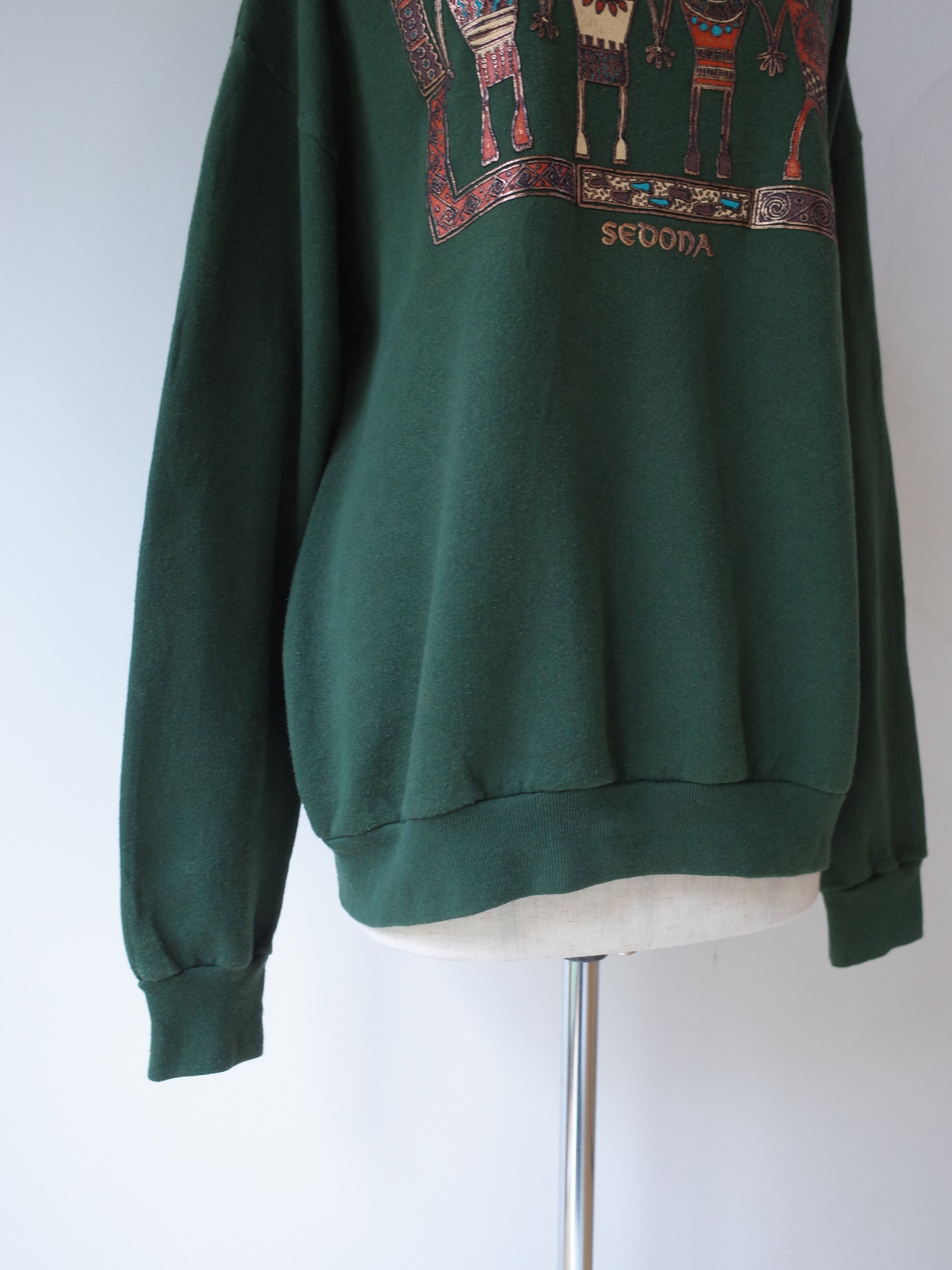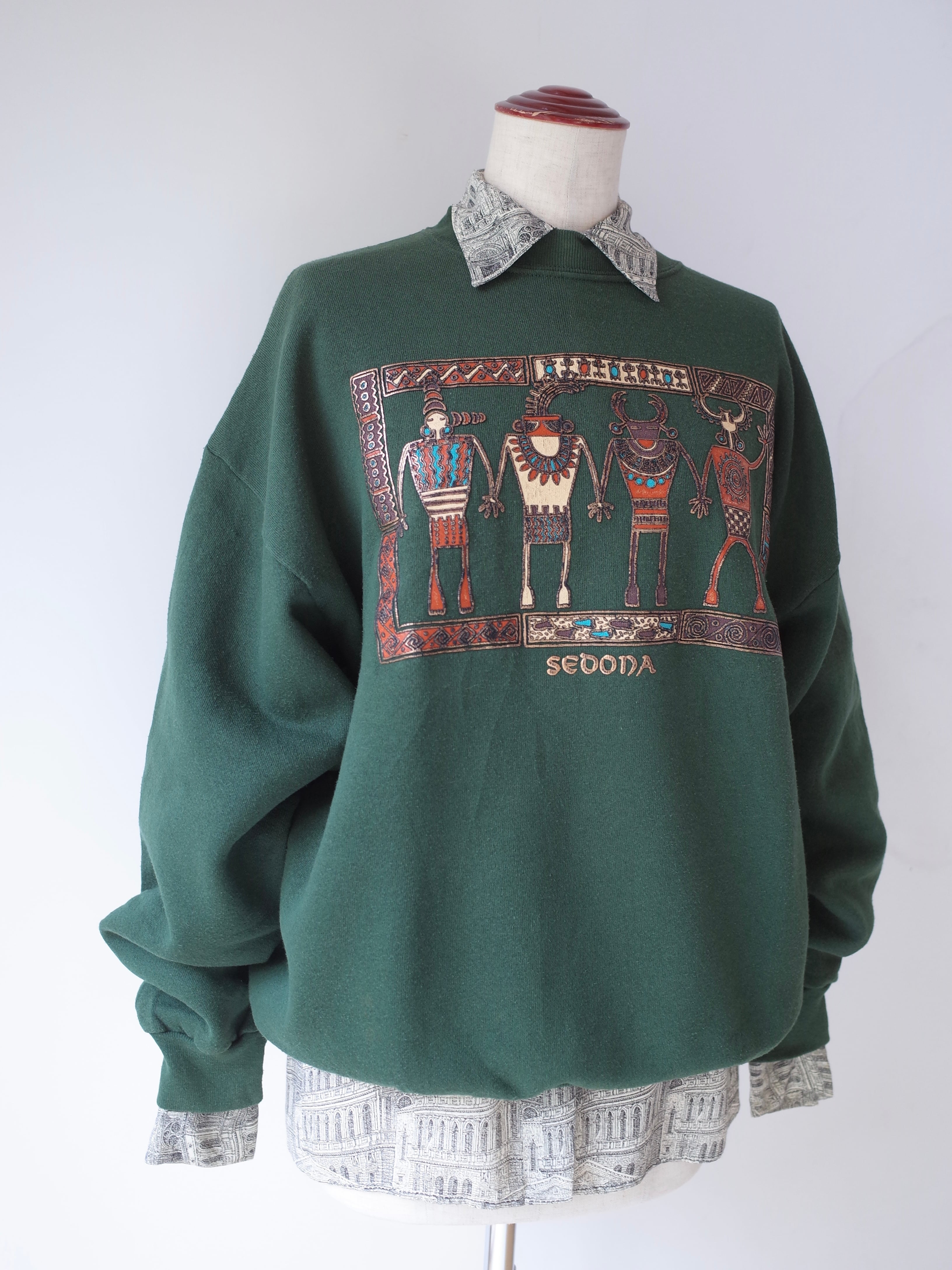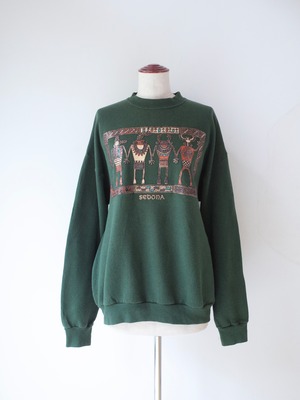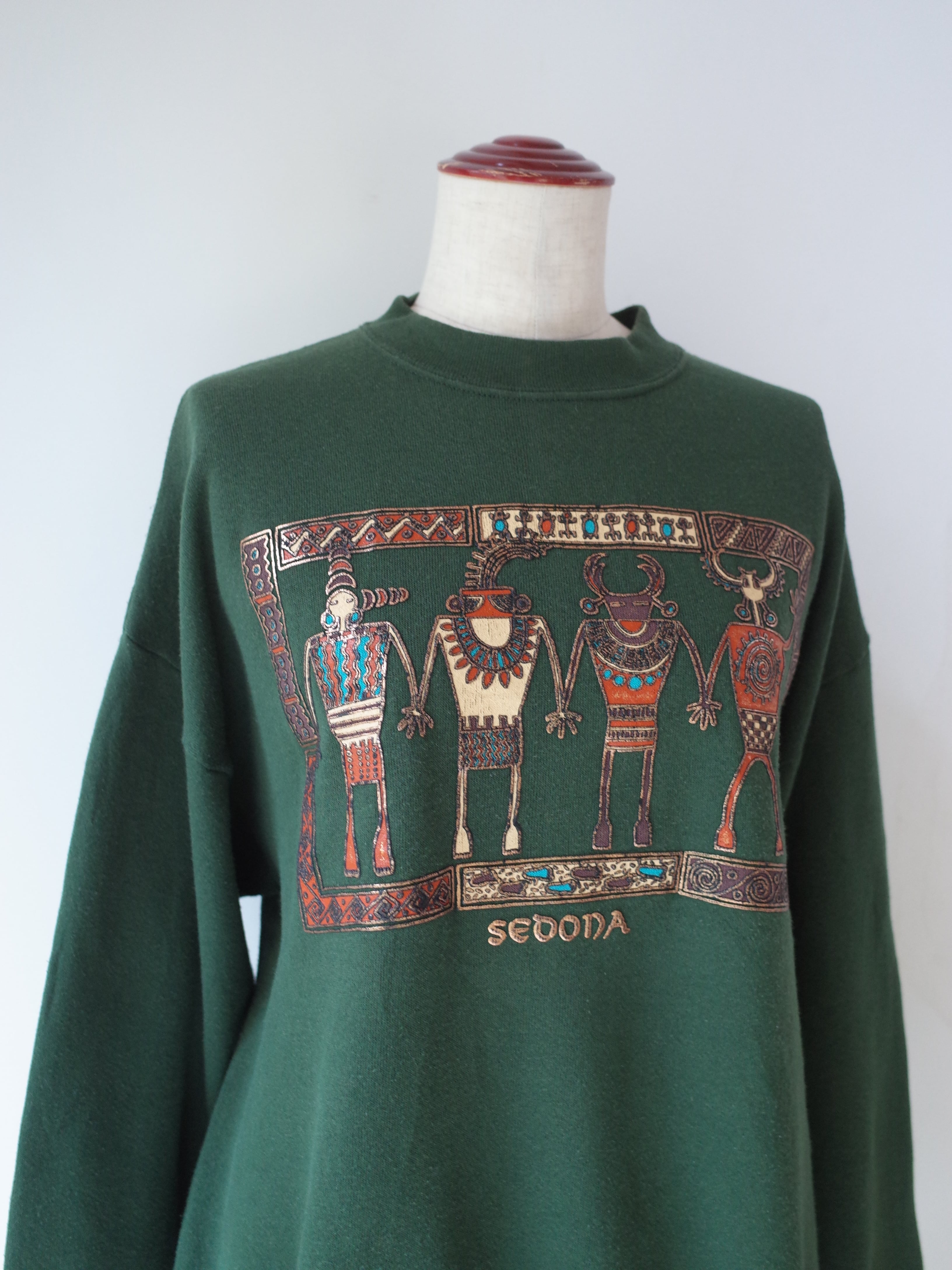 ・フォレストグリーンのボディにネイティブ調アートプリントが施されたセドナのスーベニアスウェット