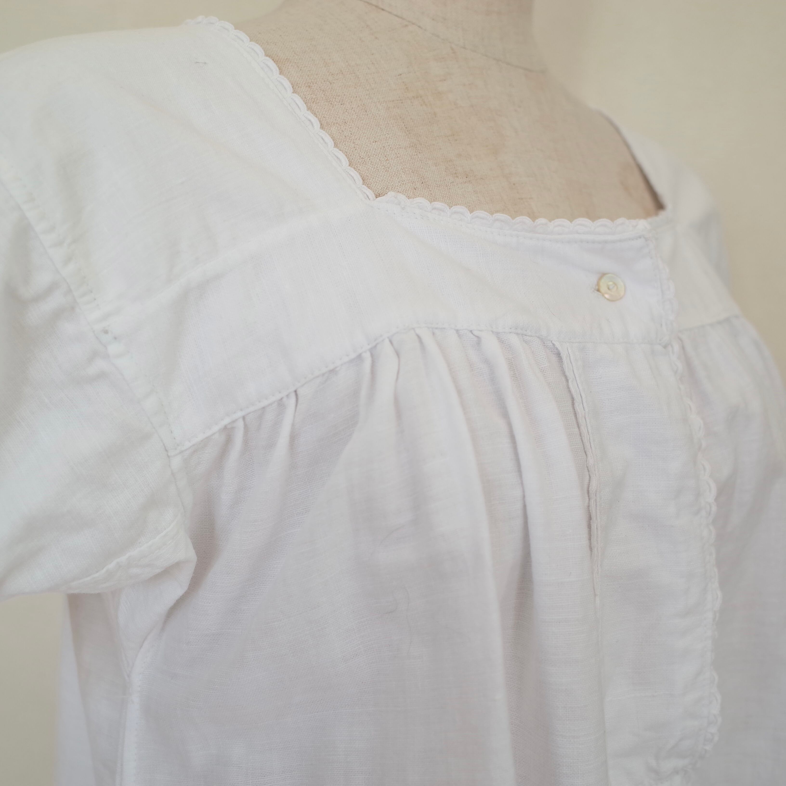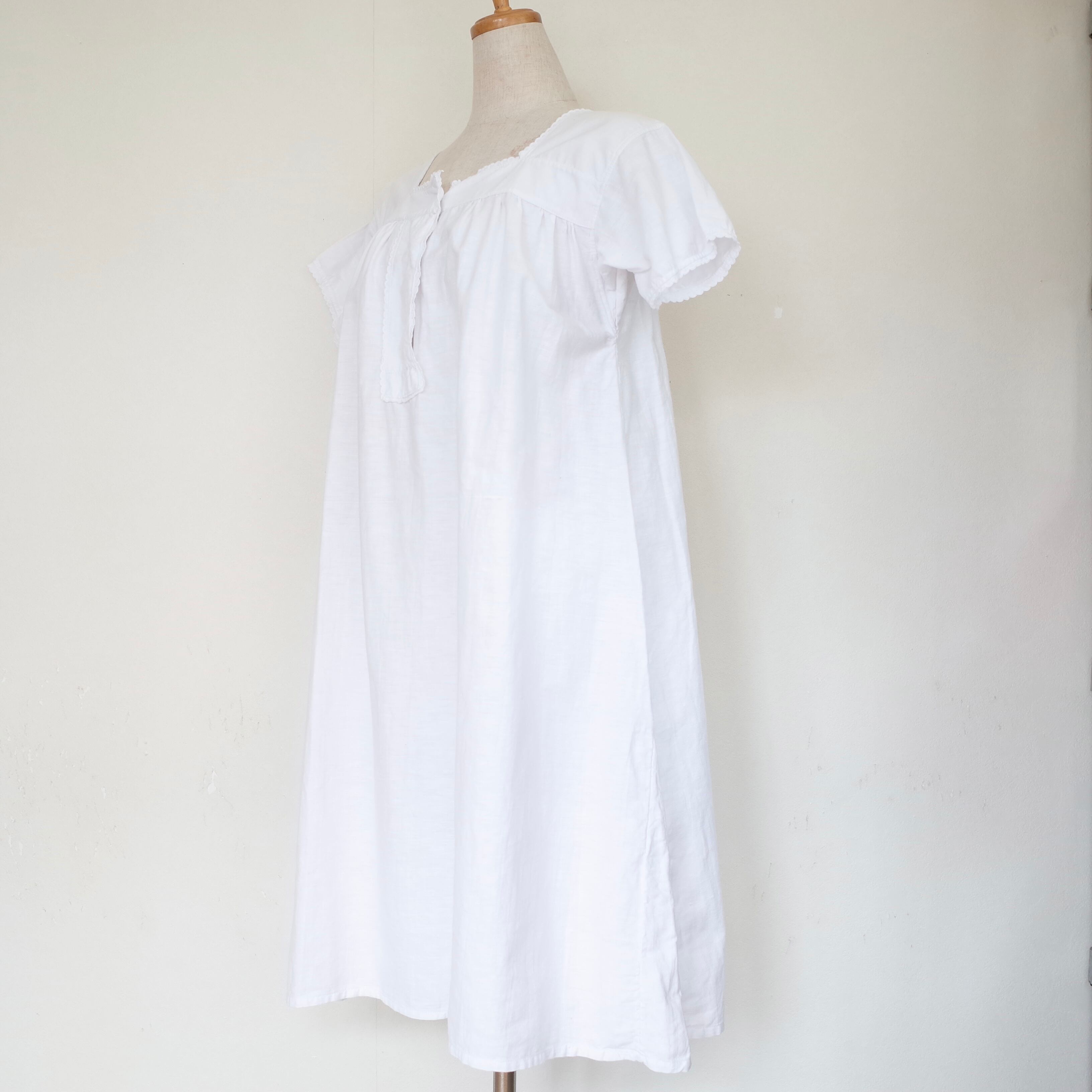 雰囲気あるヴィンテージのコットンドレス。上品でしっかりとした質の良いコットン生地で作られています。クリーンで爽やかな印象を与える一枚。デニムなど、ボトムとの合わせも可愛いです。