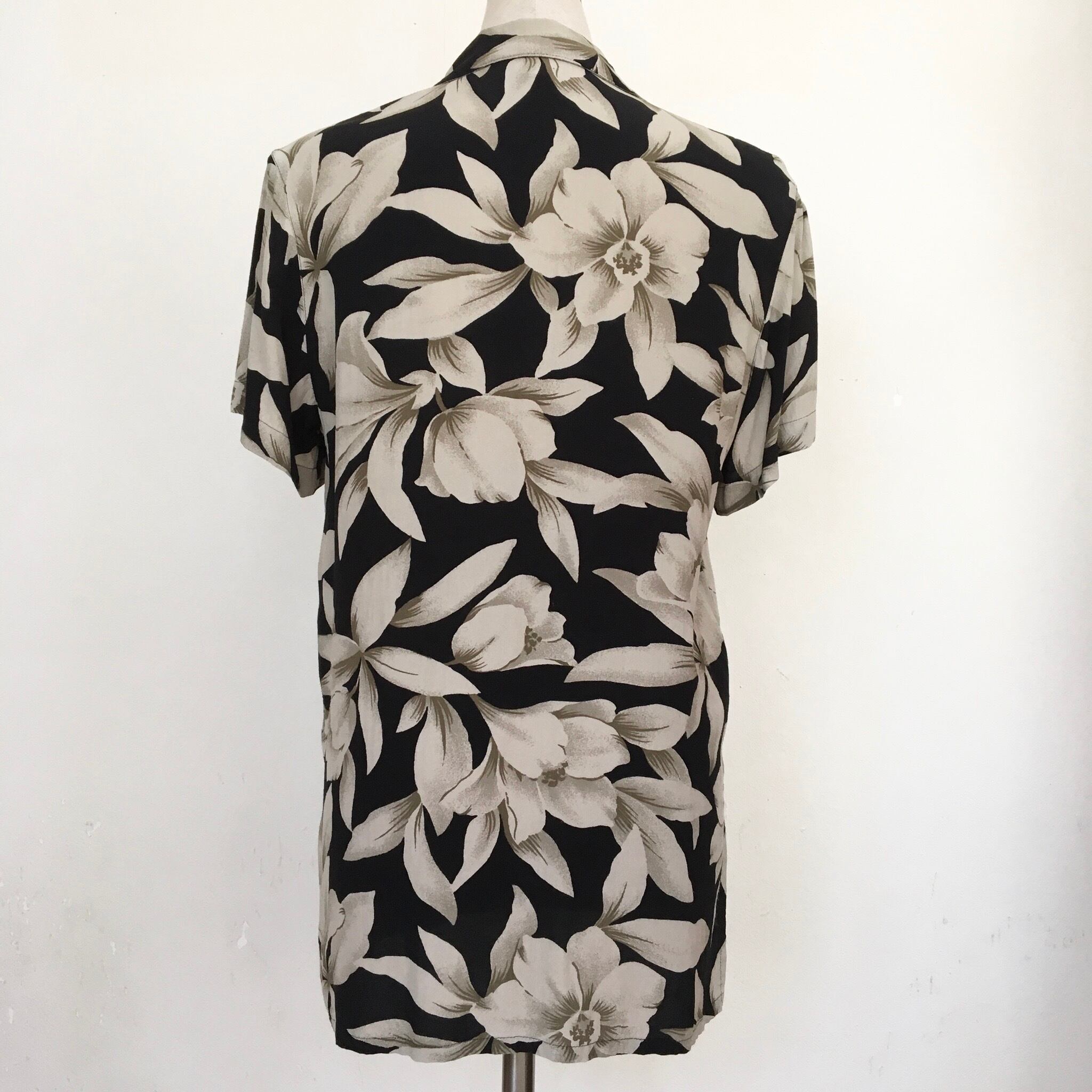 グレーとブラックで大人っぽい配色の落ち着きのあるフラワープリントの開襟シャツ。レーヨンのとろっとした素材感がカジュアルになりすぎ、より上品さをプラスしてくれます。ゆったりとしたサイズ感も着心地良く着用頂けます。