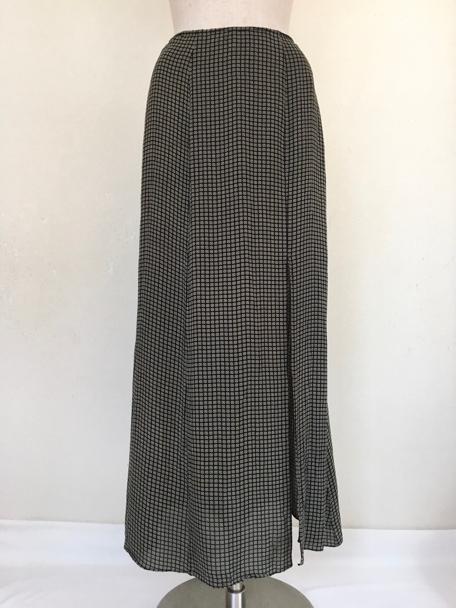 DKNYのシルクロングスカート。左前に深めのスリットが入っています。フラワーのようなクッキー型の細かい柄がちりばめられています。春夏はTシャツなどのカットソーと合わせてカジュアルに。秋冬にはニットやロングブーツと合わせてもかわいいです。スタイリングで印象がガラッと変わる一枚です。裏地は付いていません。