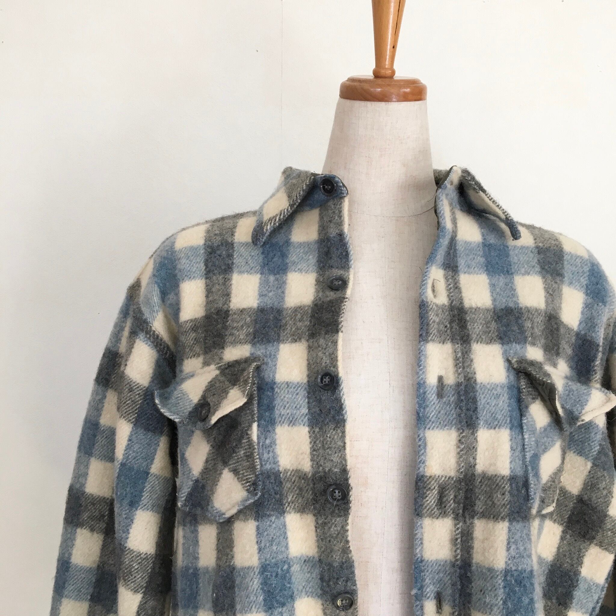 80年代アメリカ製Woolrichのウールシャツジャケット。厚手のウールで、ブルー×ホワイトベースの淡いチェック柄が爽やかな印象の一枚。女性が着るのに抜群なサイズ感です。最近ではセレクトショップなどでも人気のウールシャツジャケットですが、80s Woolrichのオリジナルはひと味もふた味も違ったヴィンテージ特有の雰囲気が出ていてとてもかっこいい一着です。