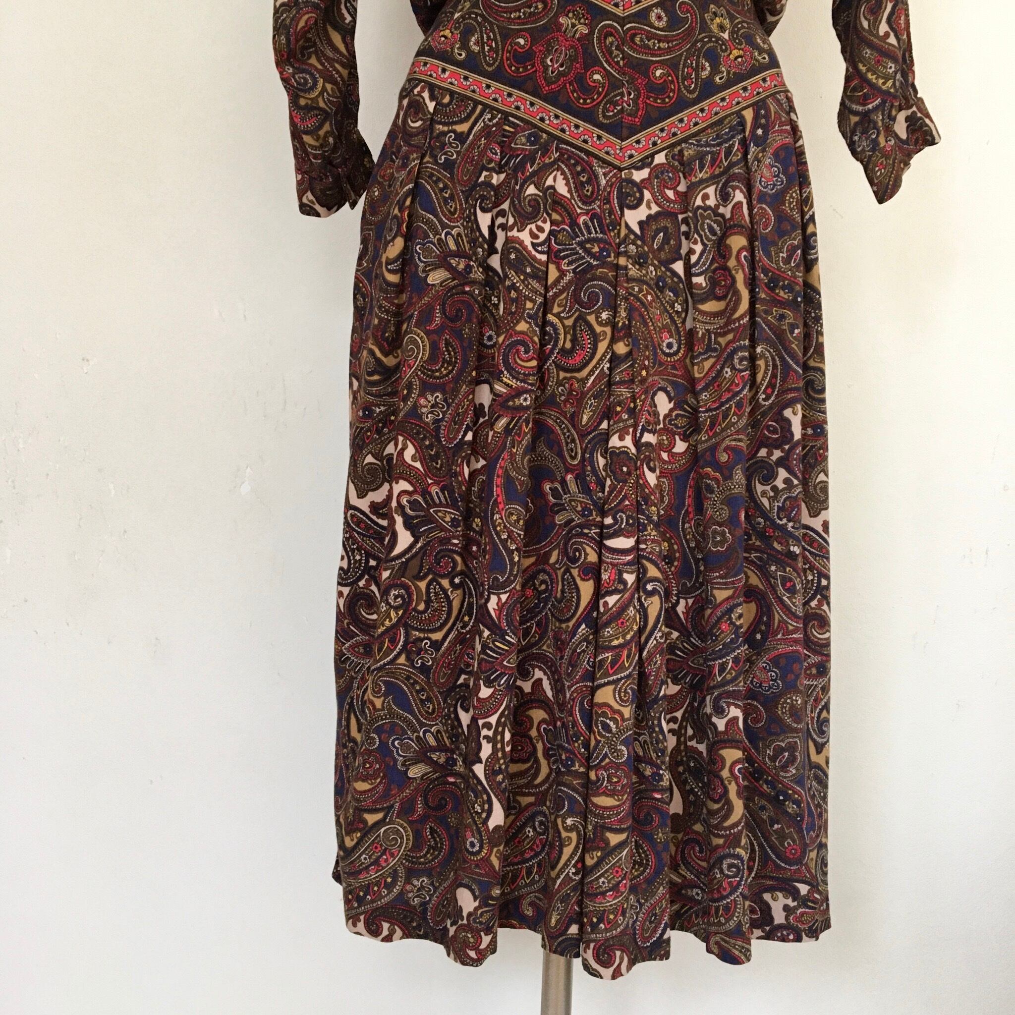 80年代アメリカ製ペイズリー柄のワンピース。ペイズリーのパターンの使い方や、ウエストのディテール、バックスタイルのボタンなど細かいところのデザインもぬかりない一枚。ボトムにジーンズを合わせてカジュアルに。ヒールとアクセサリーでドレスアップも可能。スタイリングの幅が広がるワンピースです。