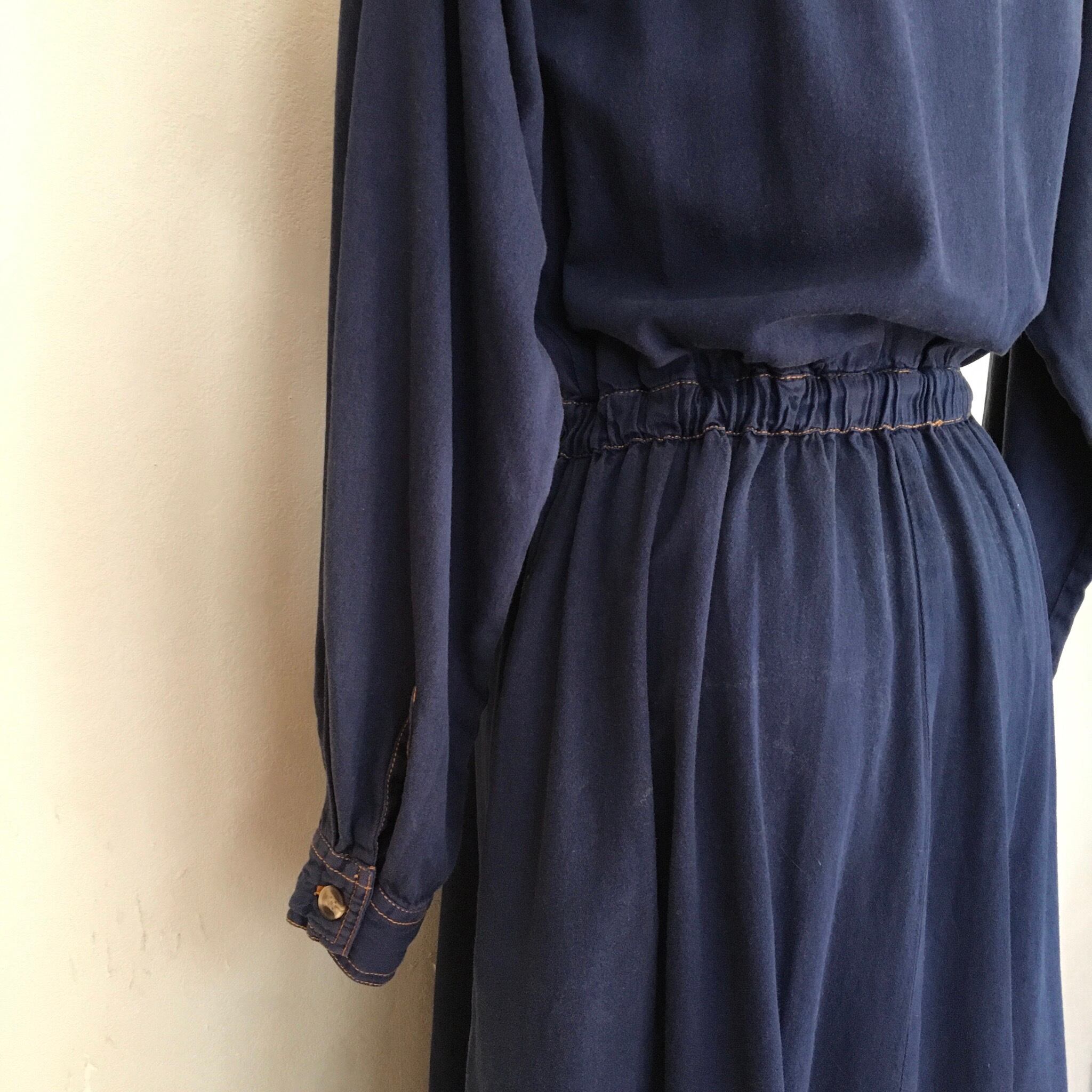ノーカラーのロングワンピースです。前開きなので、ロングカーディガンのように羽織りとしてもお使い頂けます。インディゴカラーは後染めで、ノーカラーもあとからリメイクしたようなデザインになってます。黄色いステッチもかわいいです。ウエストにゴムも入っているので、綺麗なギャザーがよります。ニットを重ねたり、着回しのきくワンピースです。