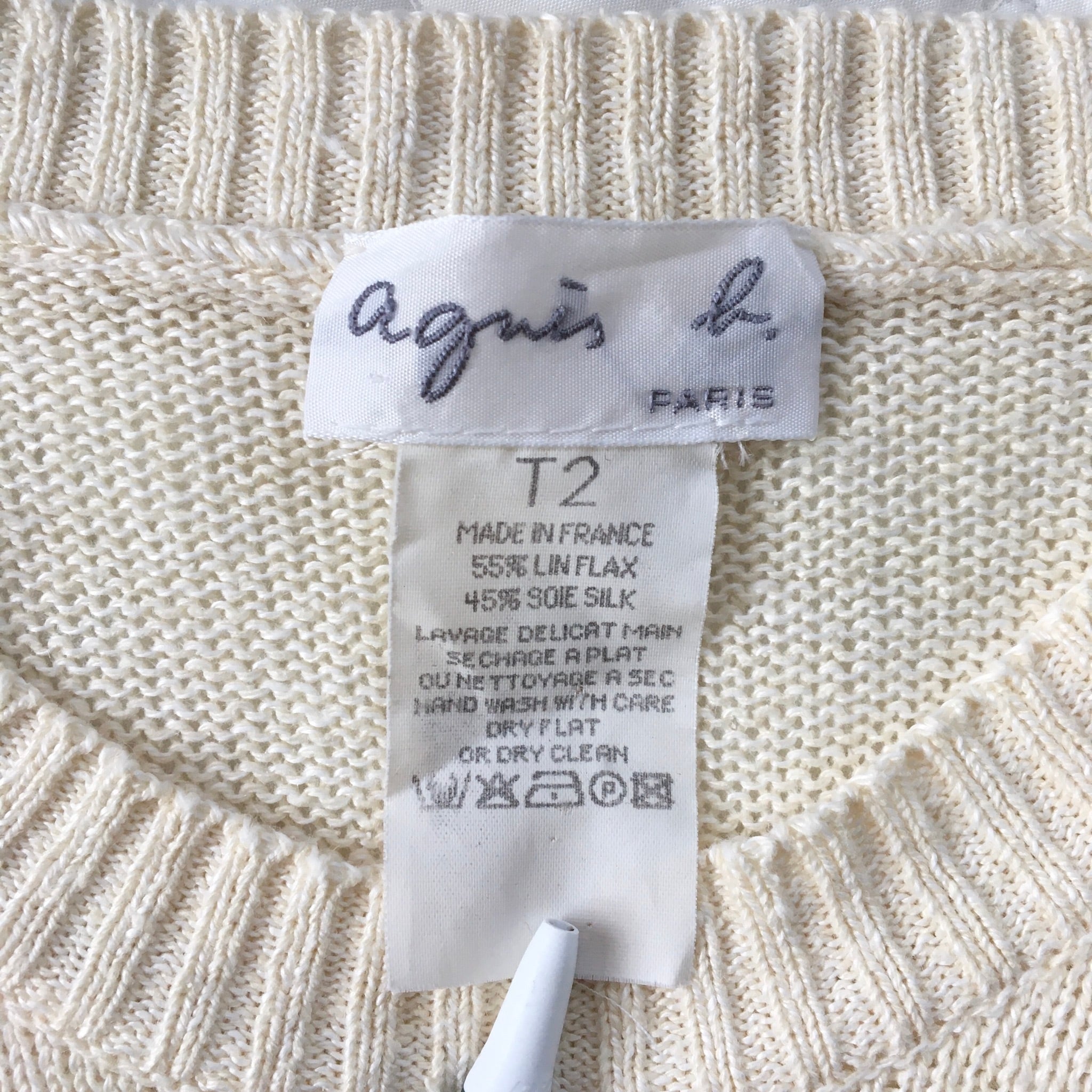 フランス製、agnes b.のショートスリーブのニットです。麻とシルクの混合素材がサラッとした肌触りで、程よい艶もあり絶妙な風合いを醸し出しています。ブラックのキャミソールと合わせて、透け感を楽しんで頂きたい一枚。ジャケットの下にインナーとしても活躍するニットです。
