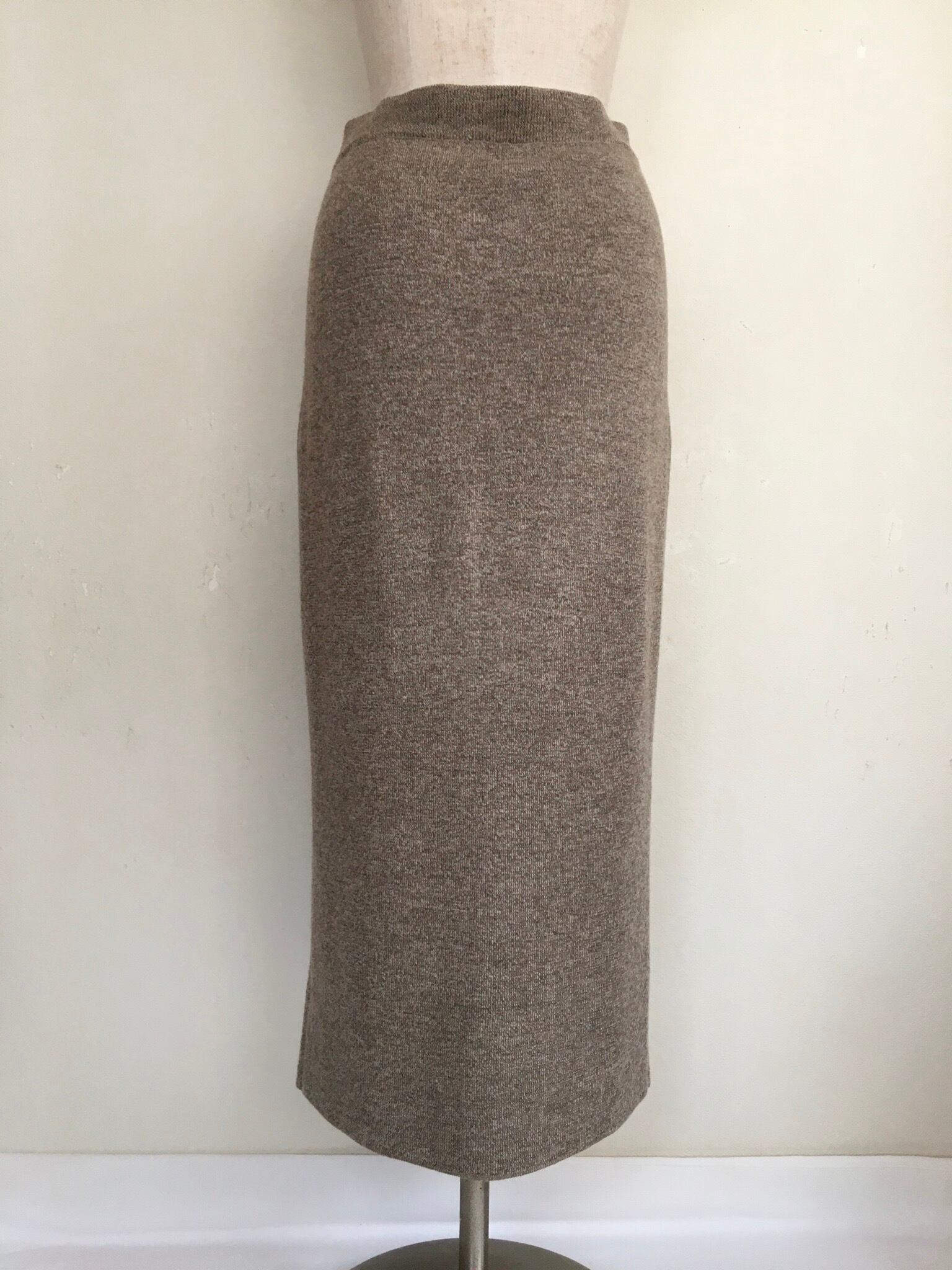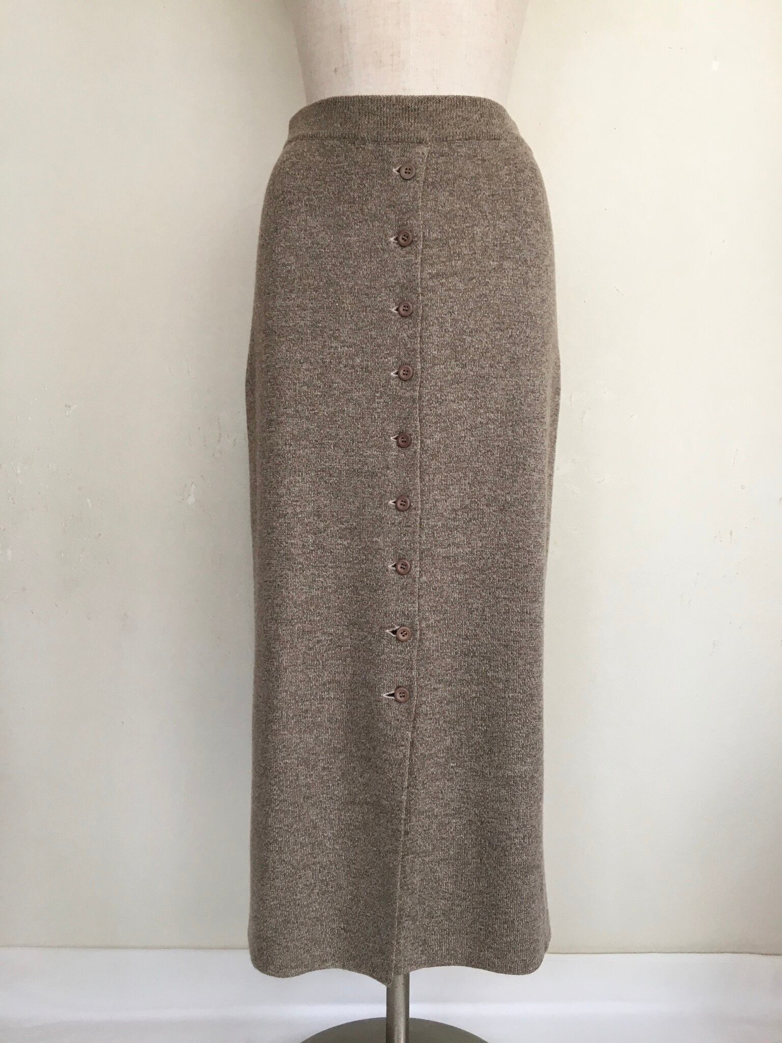 ニット素材のロングスカートです。Iラインですが、前開きでボタンが付いているので程よく裾に広がりがあり、とても綺麗なラインで着用頂けます。カジュアルにスウェットを合わせたり、ジャケットと合わせてスタイリングしたり、合わせ方でコーディネートが180°変わるスカートです。ニットで伸縮性もあり動きやすく、履き心地も良い一枚。