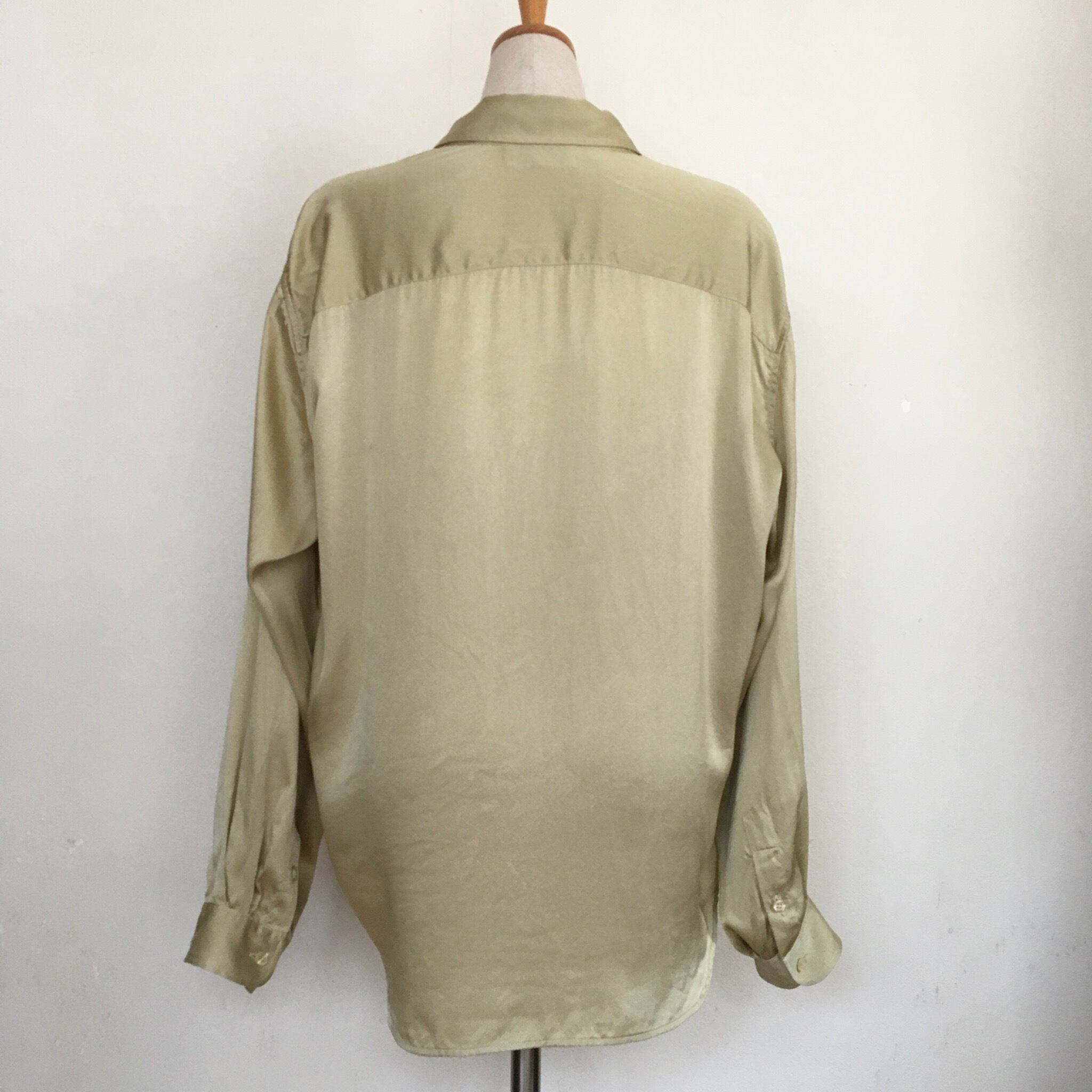 シルクのような光沢ととろみのある素材のブラウス。今年らしいピスタチオカラーです。サラッと羽織るだけで上品に決まる一枚です。