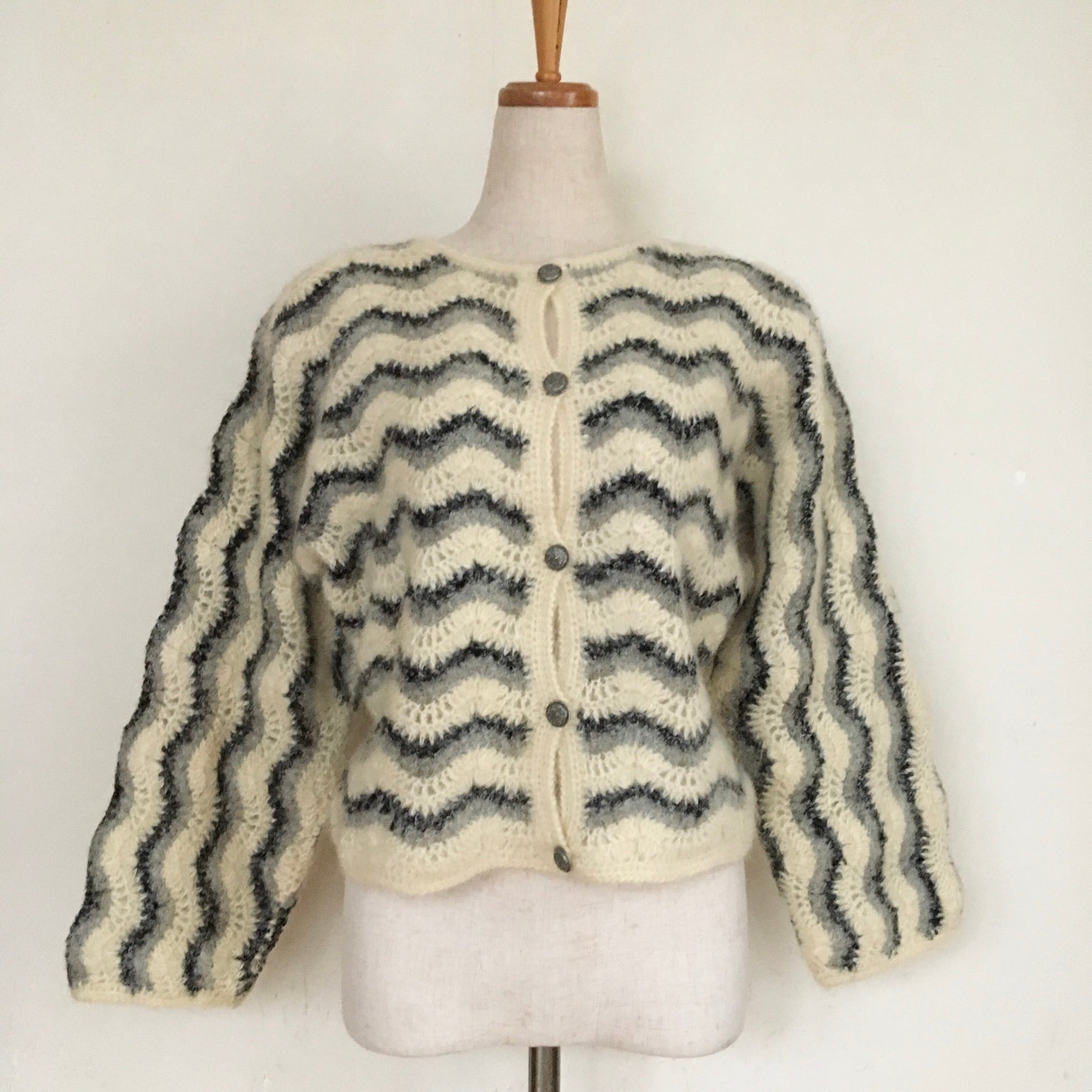 モヘアのニットカーディガン。なみなみのボーダーがレトロでかわいい雰囲気の一枚。太めのアームでシャツやブラウスと重ねて羽織ってコーディネートしたいカーディガン。コンチョボタンなところもポイントです。