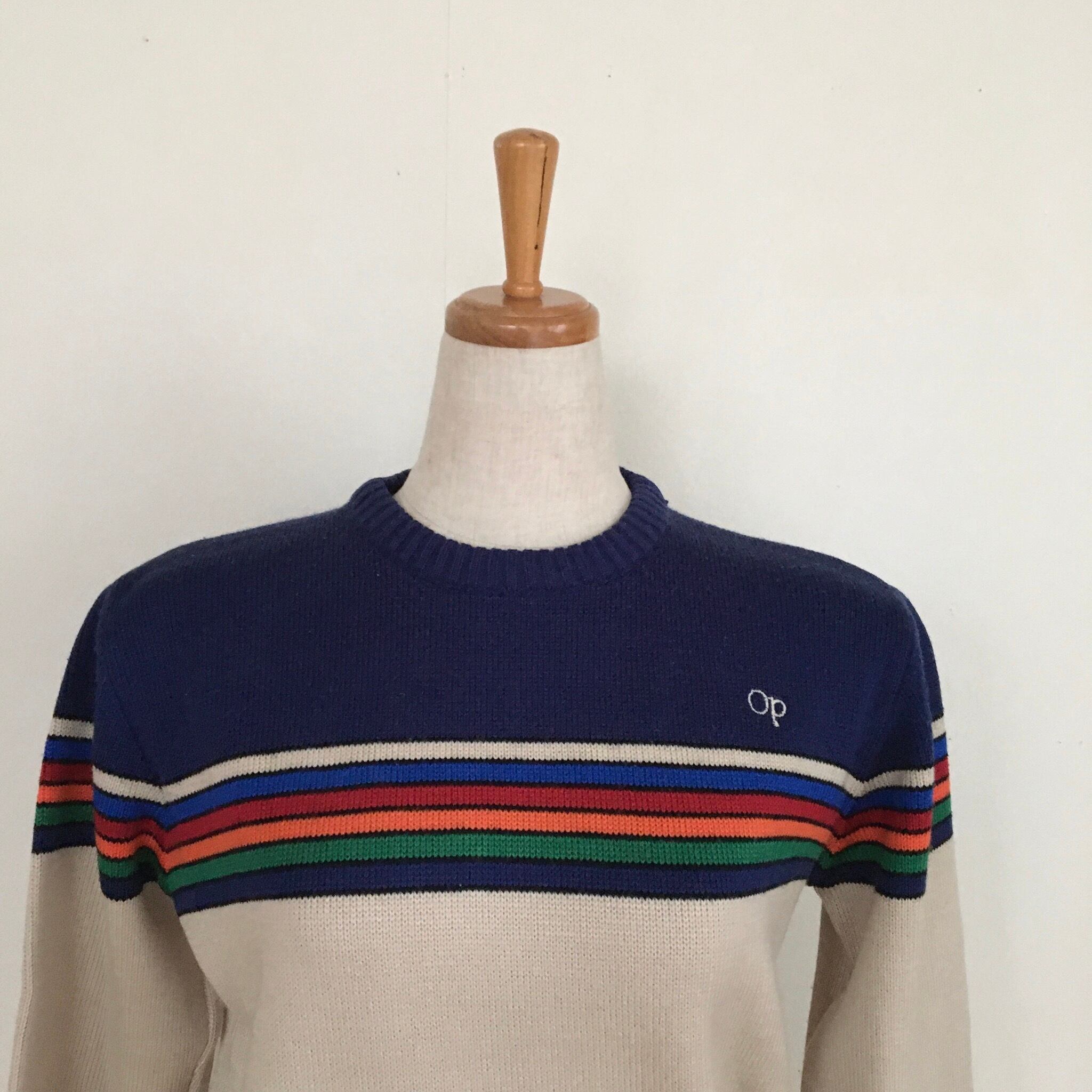 70年代製のオールド感漂うOPのアクリルニットです。ベージュベースの雰囲気あるボーダーは、ヴィンテージならではの味わい。ブーツカットのコーデュロイパンツなどを合わせて思いっ切り70sファッションを楽しみたい一着です。
