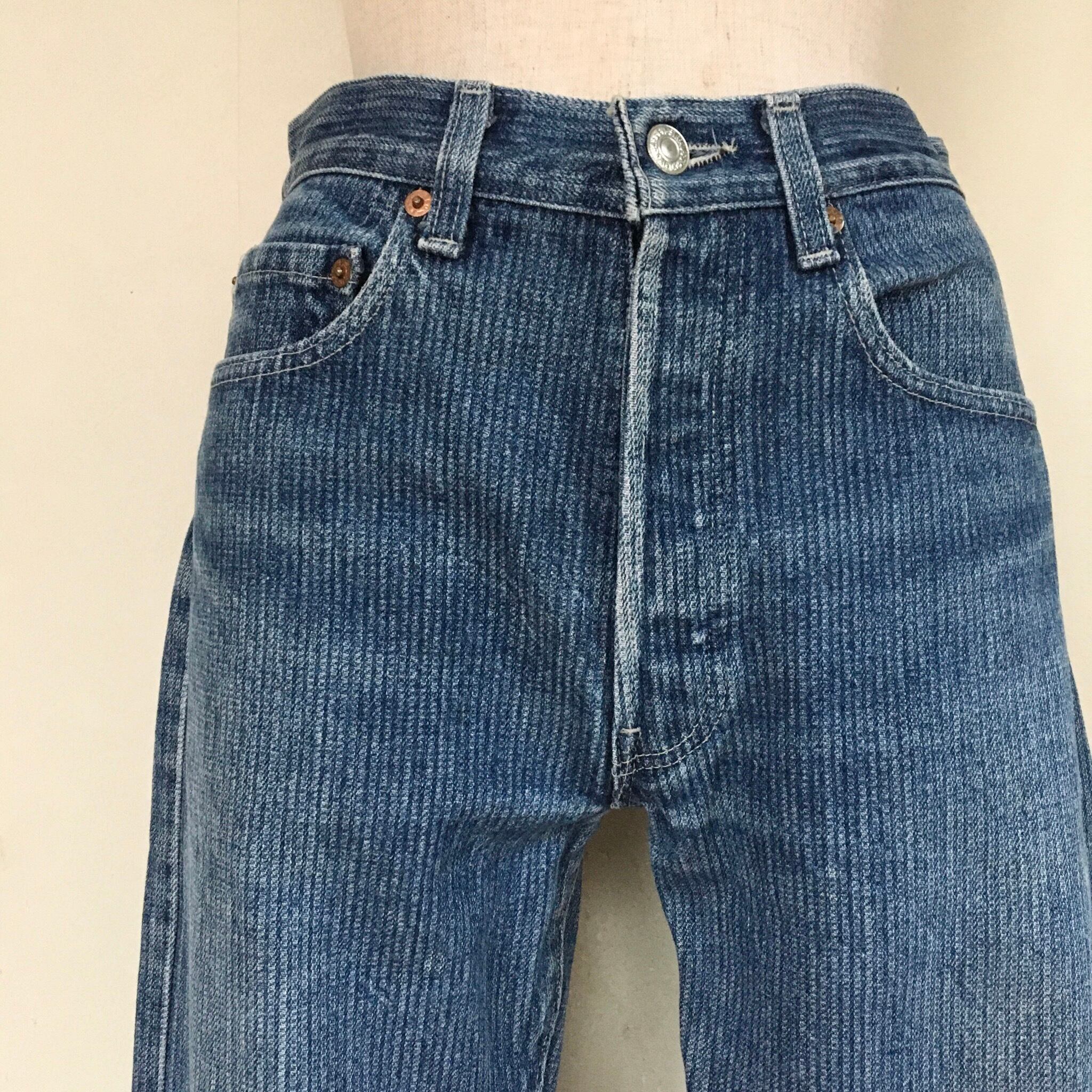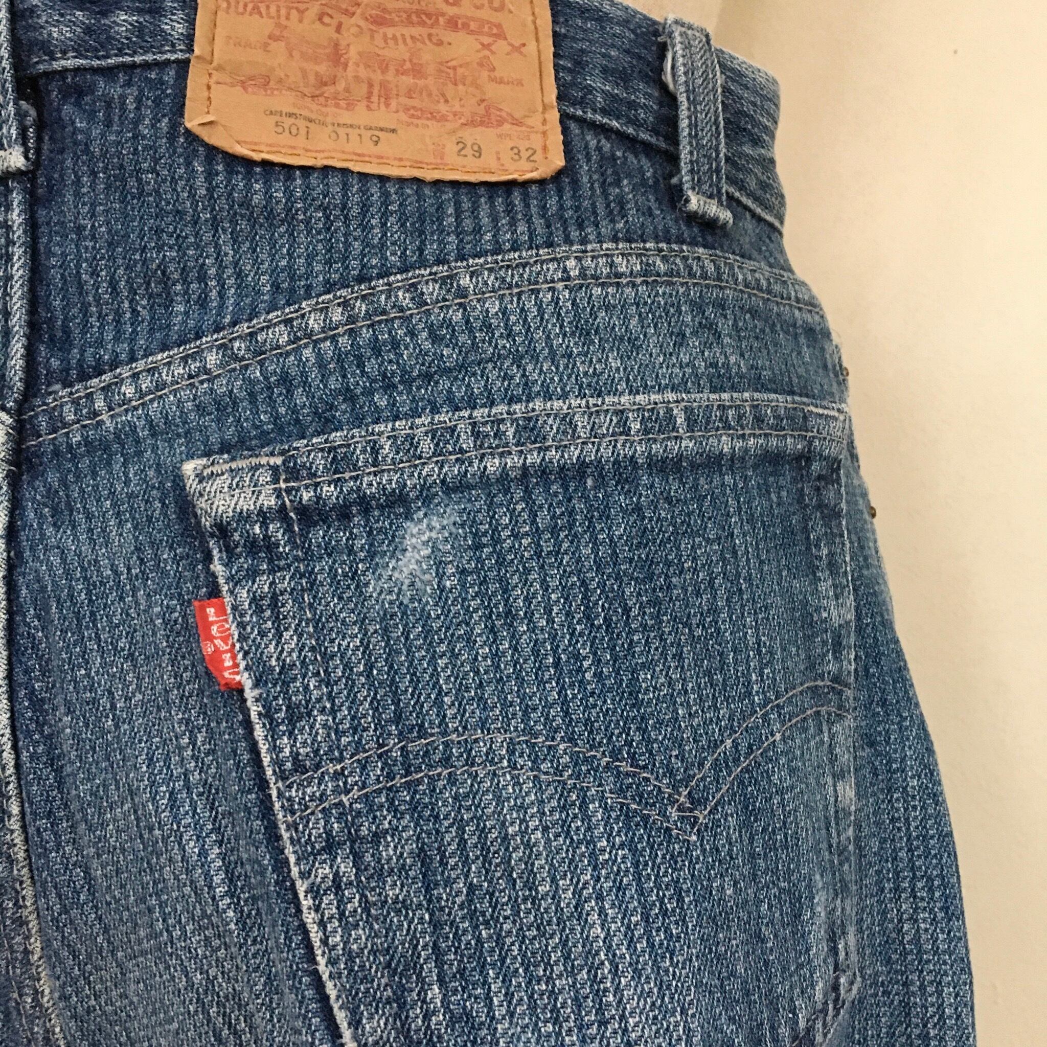 80年代USA製Levi's501のストライプです。ボタンフライになります。80年代の珍品Levi'sの代表格と言っても過言ではないコチラの「501-0119」。お色はインディゴブルーと白の配色で細かいピンストライプ柄が合わせやすく、 501がお好きな方や、何本かお持ちの方におすすめなストライプジーンズ。ひと味違ったスタイルがお楽しみ頂けます。サイズが合う方ぜひ◎