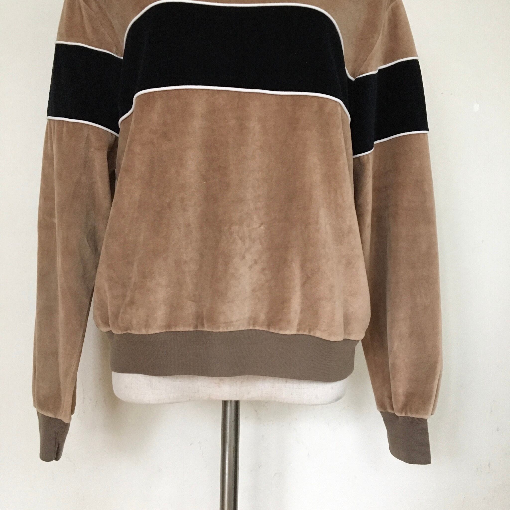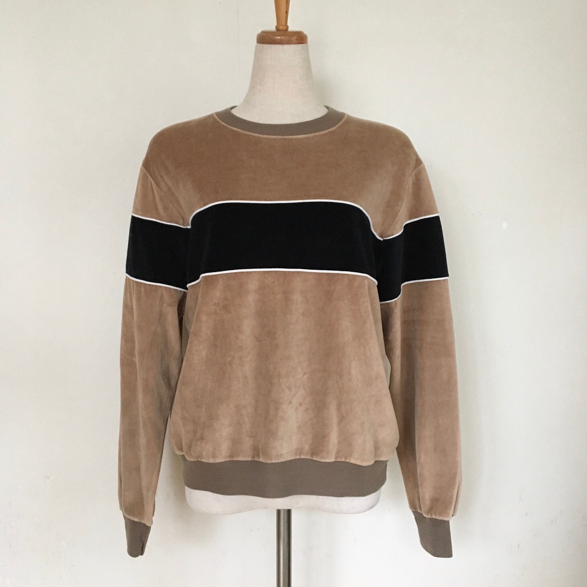 サラッとしていて着心地のいいベロア素材のトップス。スウェットよりも上品に、少しエッジも効かせてくれる意外と使い勝手の良い素材です。ベージュ×ブラックの配色、ホワイトのパイピングも締まって見えるバランスの良いデザインです。