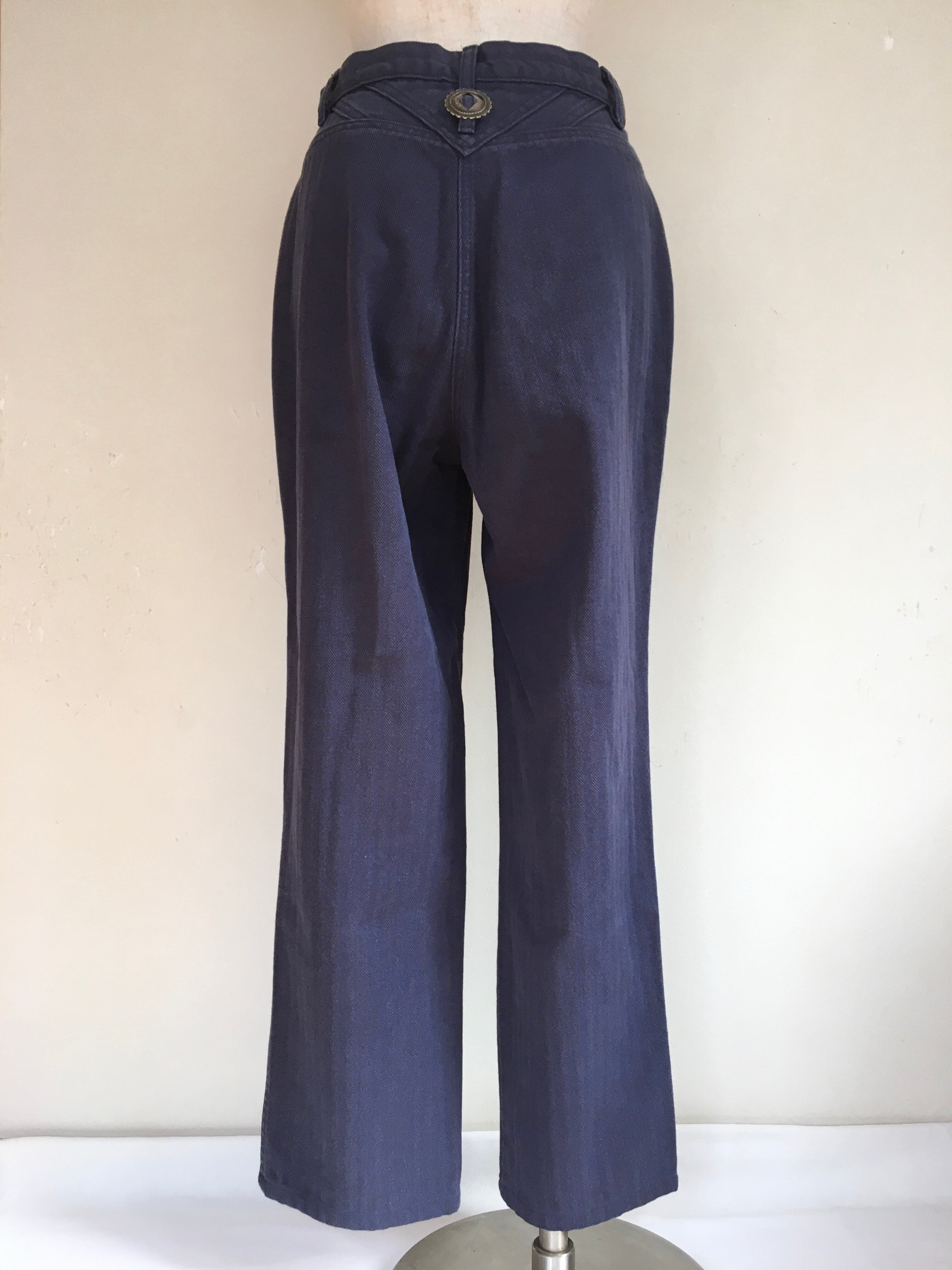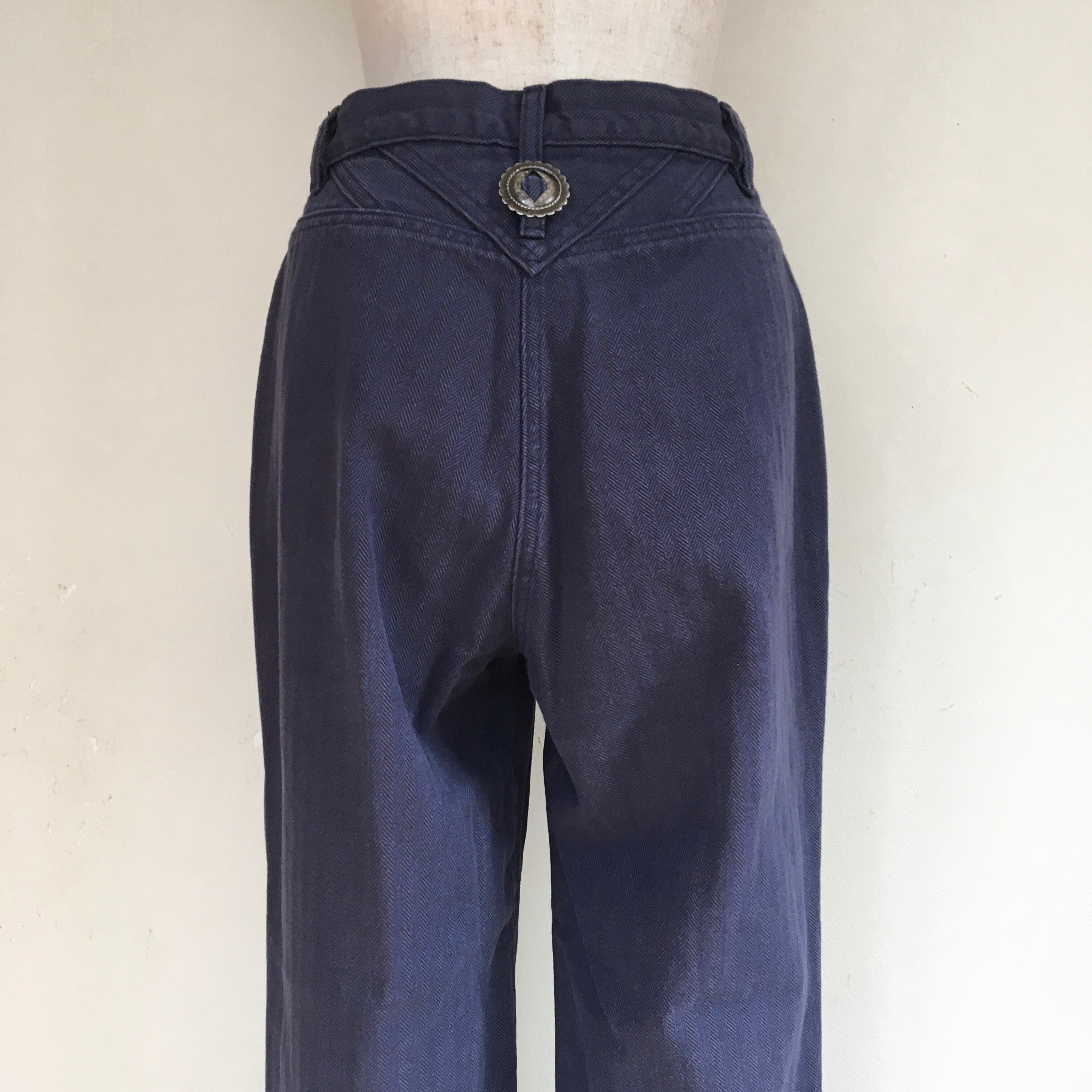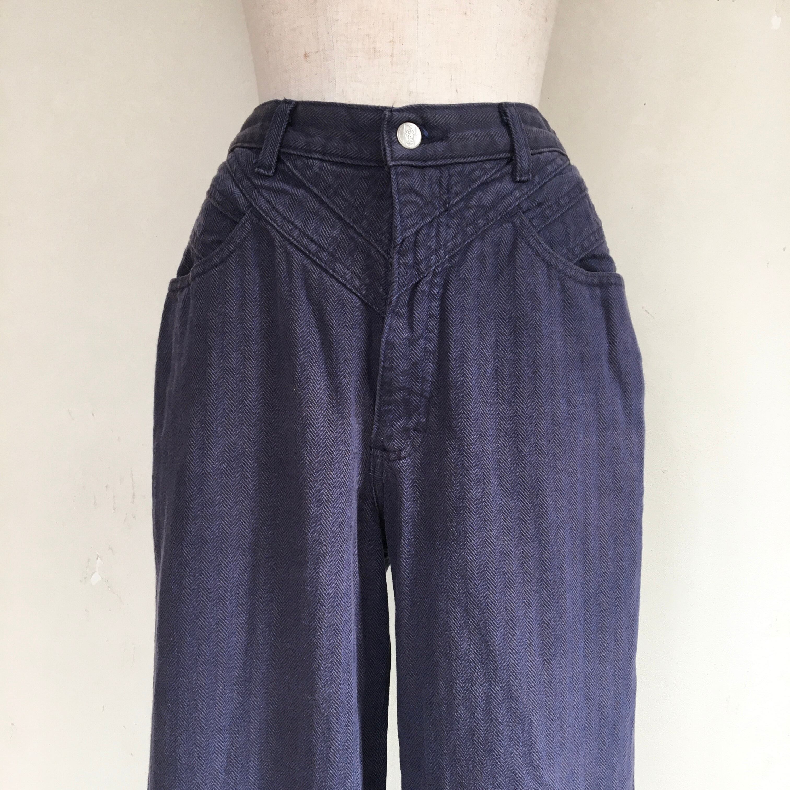 90年代USA製Roperのパンツです。Roperはアメリカの老舗ウエスタンウェアブランドです。ネイビー地にブラックの織も入った、ヘリンボーンのしっかりとした生地。太めのストレートレングスで、ロールアップしてハイカットスニーカーと合わせても◎バックのベルトループにさり気なくついたコンチョがウエスタンらしいデザインです。