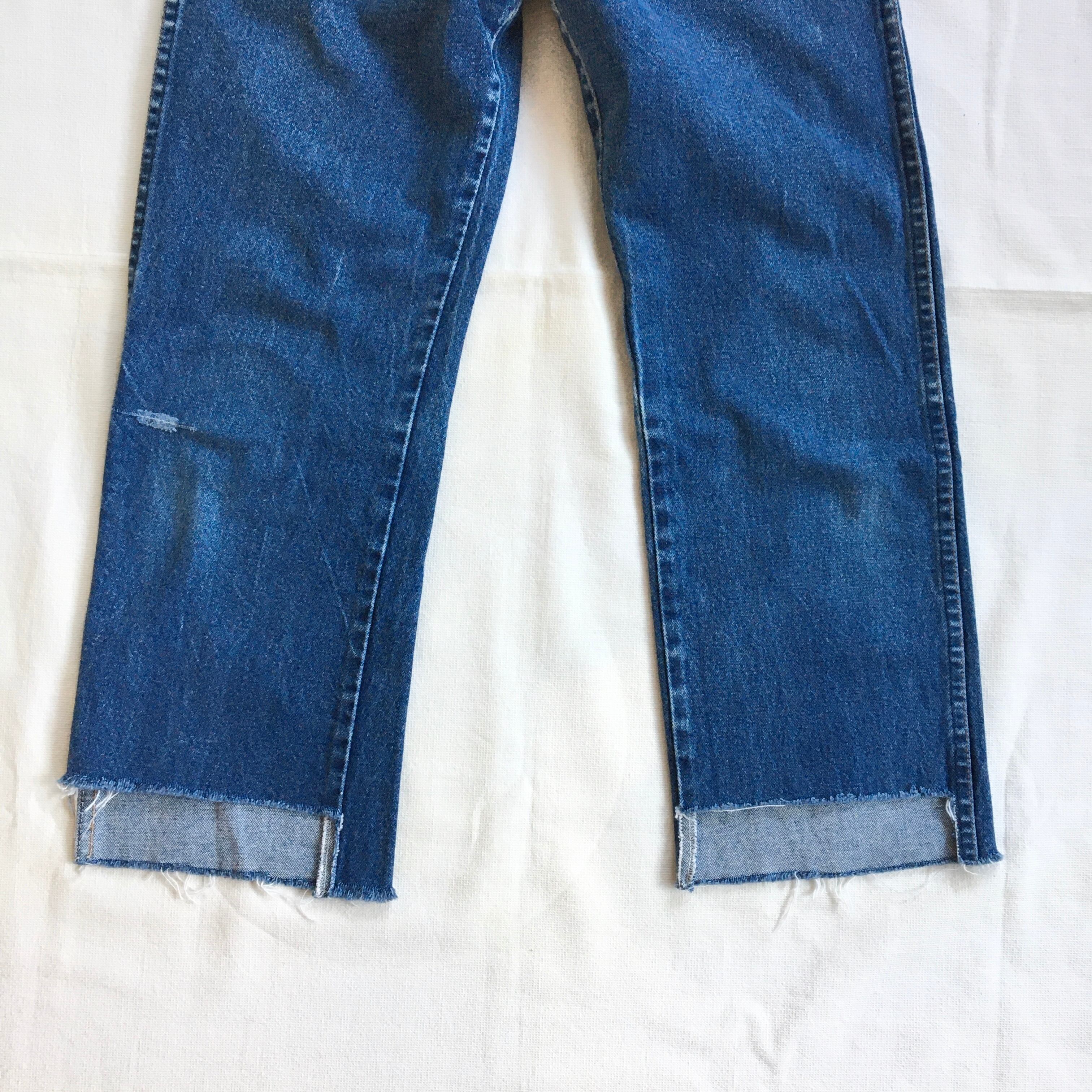 80年代USA製Wranglerのデニムです。レングスはストレートですが、裾は前後で長さが違うカットオフになっています。クロップド丈になっていて、ハイカットのスニーカーなどと合わせるとかわいいです。ブルーの落ち具合も、ヴィンテージならではの雰囲気が出ていてかっこいい一本です。