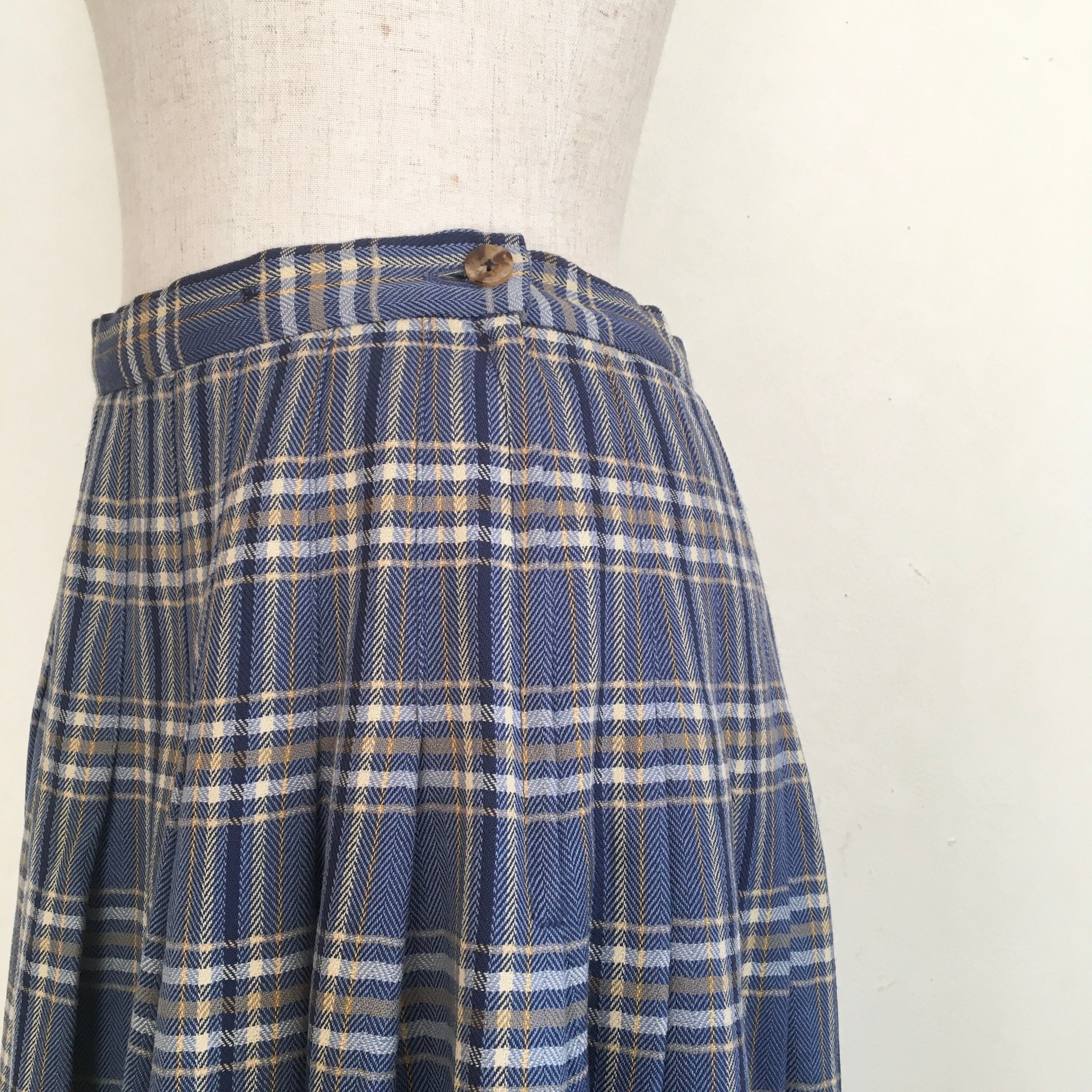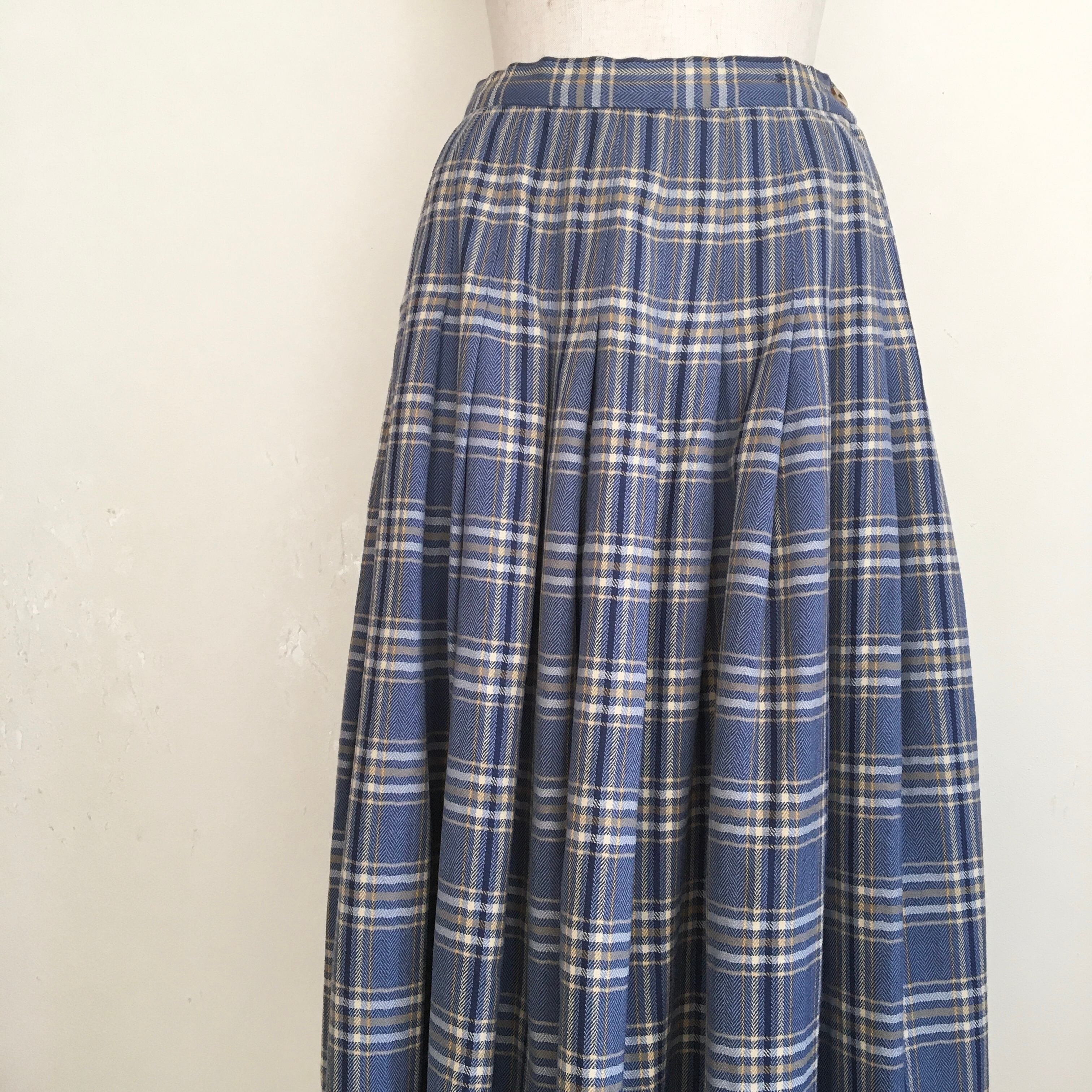 80年代アメリカ製PENDLETONのチェックロングスカート。プリーツで程よいボリューム感。サックスブルーにベージュやネイビー、ホワイトの配色が柔らかく、爽やかな印象です。トップスはニットを合わせて、足元はショートブーツやハイカットスニーカーでカジュアルに。ジャケットで少し綺麗めなスタイリングも◎ヴィンテージらしい雰囲気を出しながらも今っぽさも兼ね備えたスカートです。