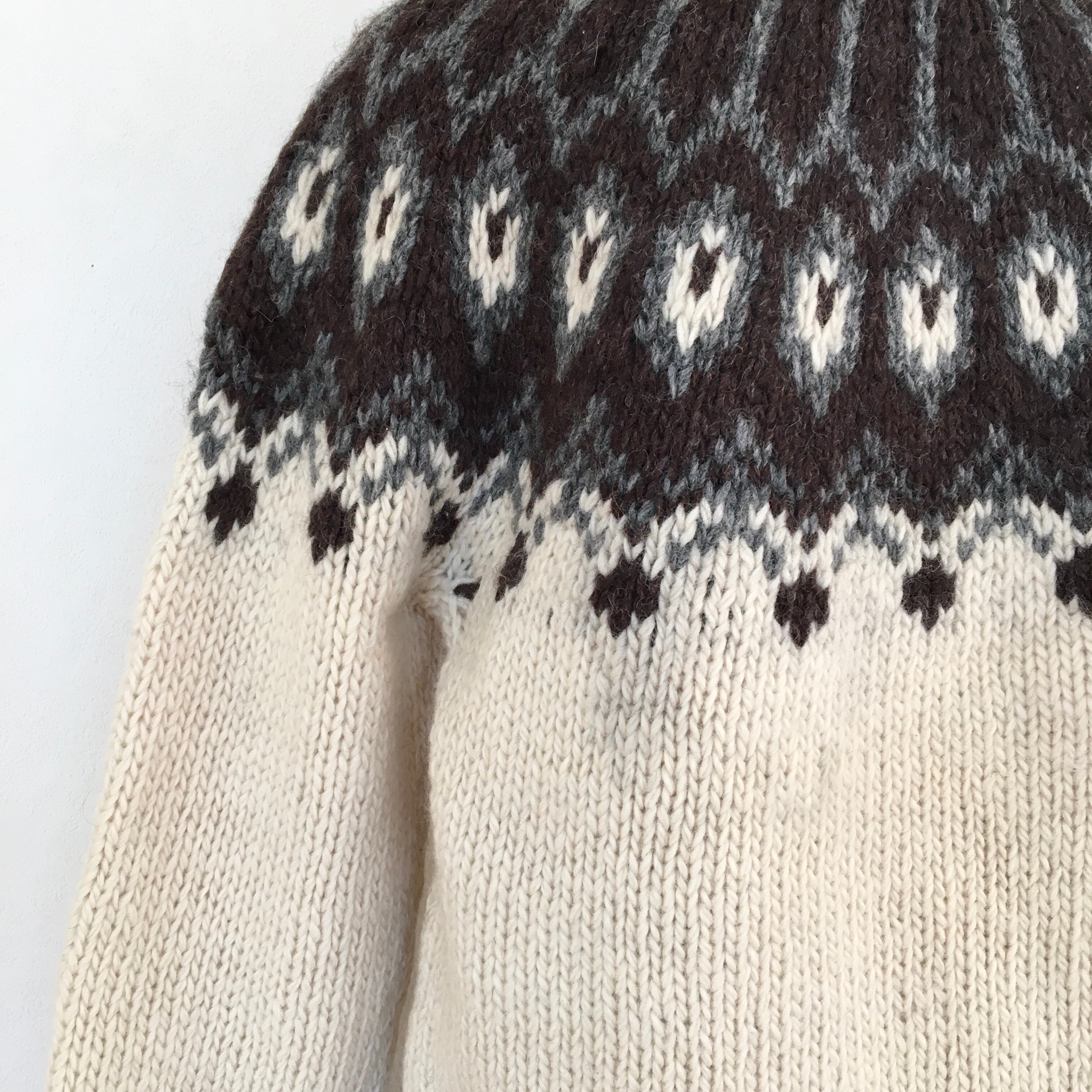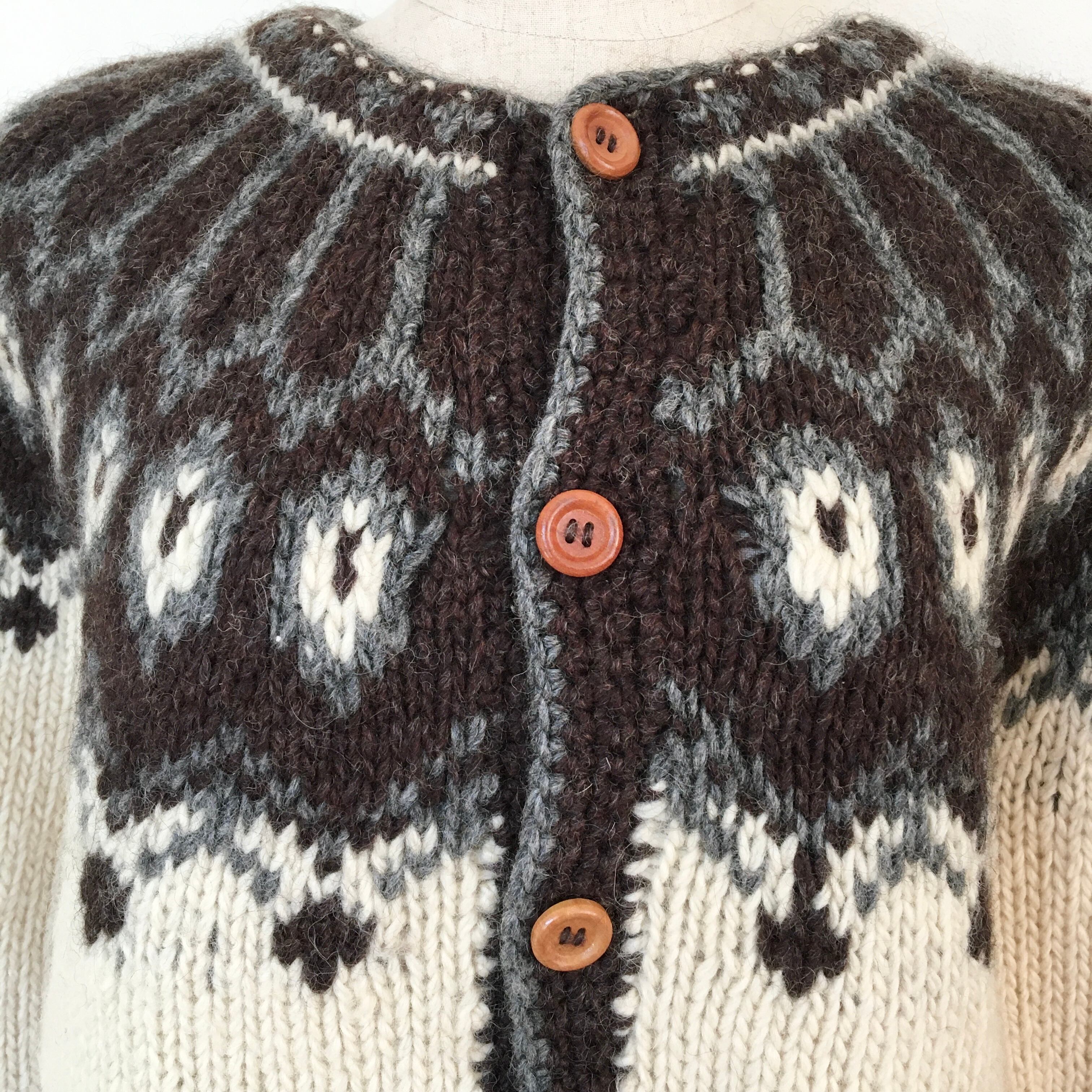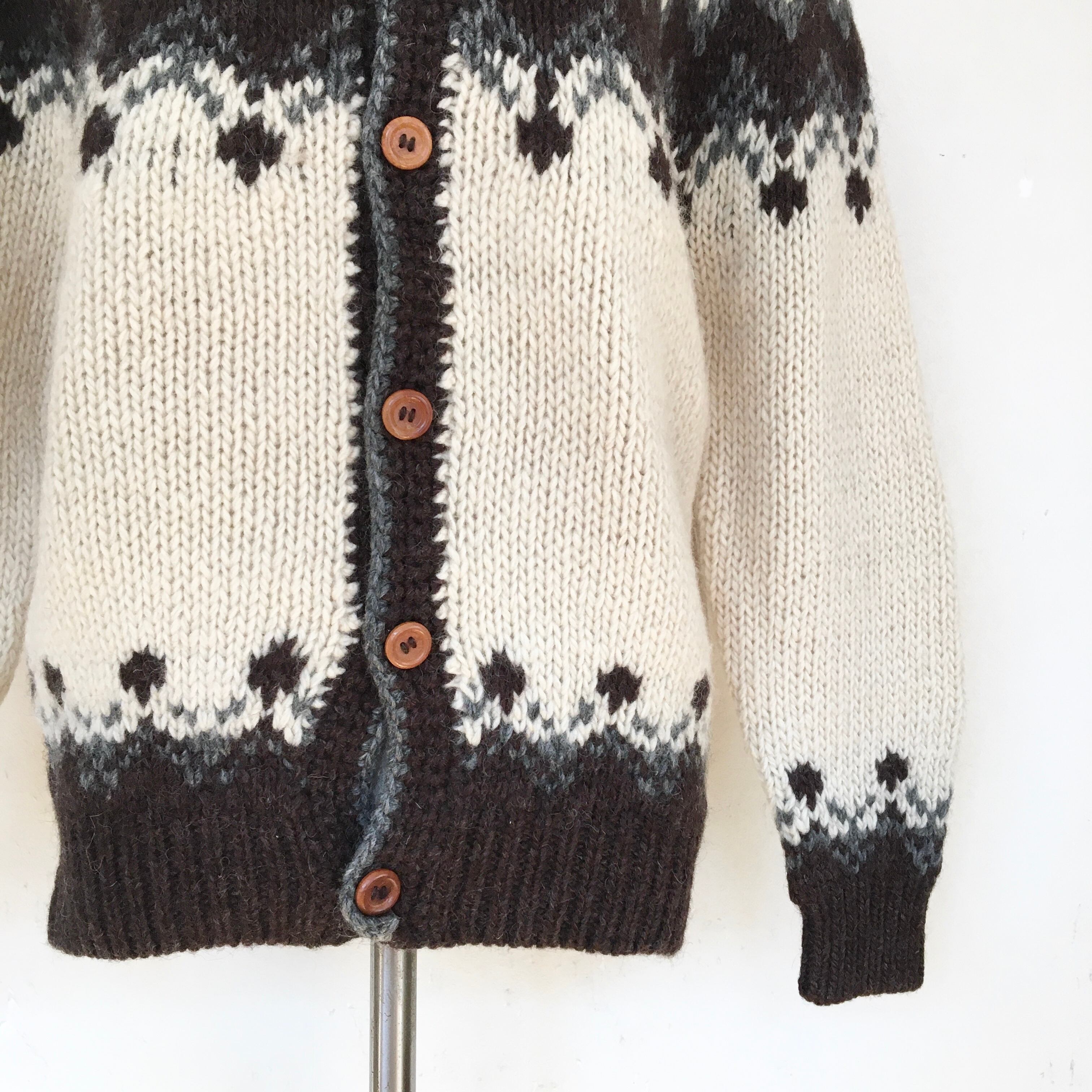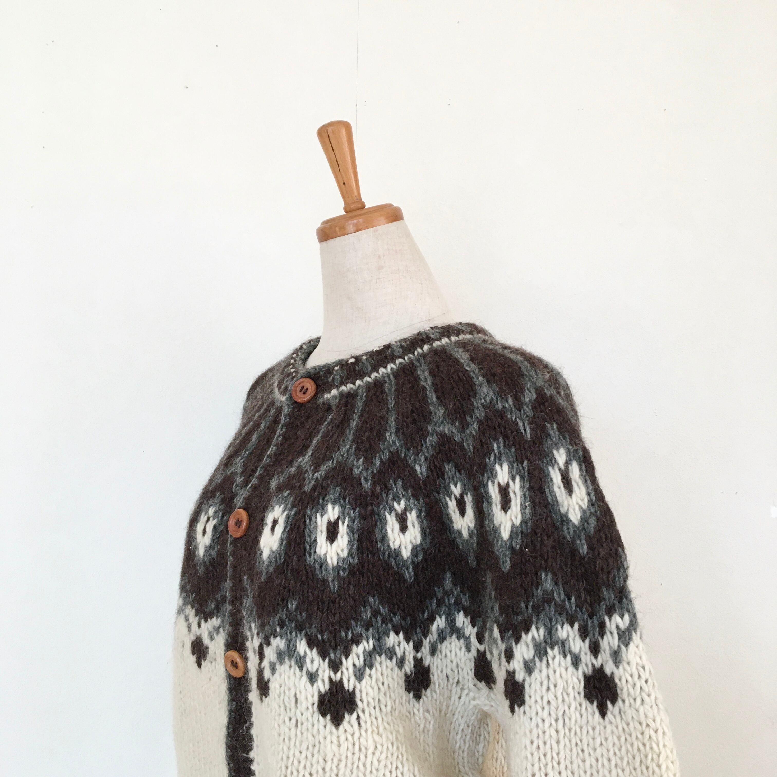 ハンドメイドのフェアアイル柄ニットカーディガン。手編みの風合いや程よいオーバーサイズのボリュームが魅力的な一枚。デニムジャケットなどの上からも羽織れるサイズ感。ラフにフレアのデニムパンツを合わせたり、ガーリーなロングスカートやワンピースに合わせるのもおすすめです。ユニセックスで着用頂けます。