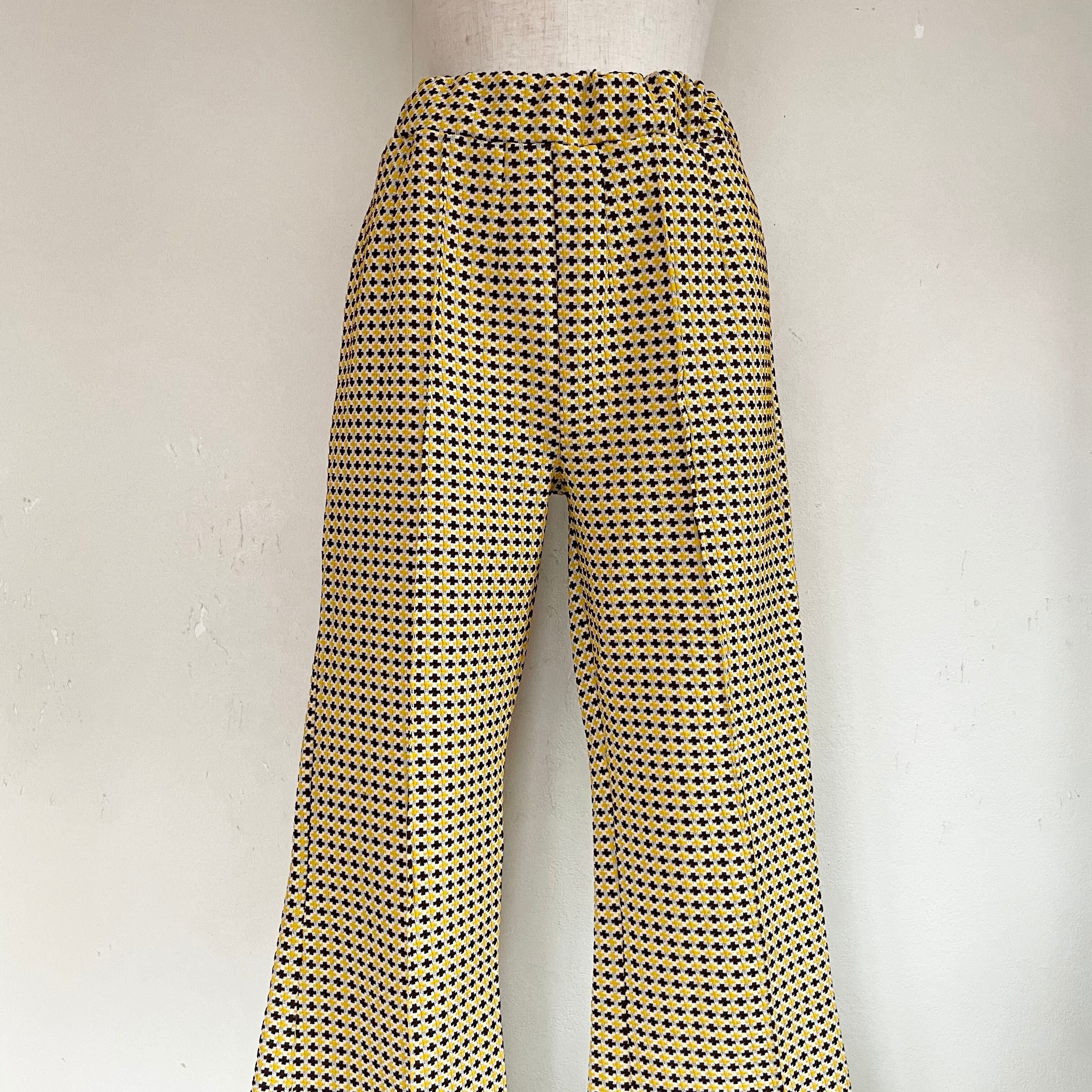 70年代シンガポール製の千鳥格子柄イージーパンツ。ブーツカットのシルエットがレトロな雰囲気を出しながらも今っぽいさもあります。ニットでもジャケットでも、カジュアルにスウェットでも◎足元はショートブーツを合わせて。イエロー×ブラウンの配色がかわいい個性的な一枚です。