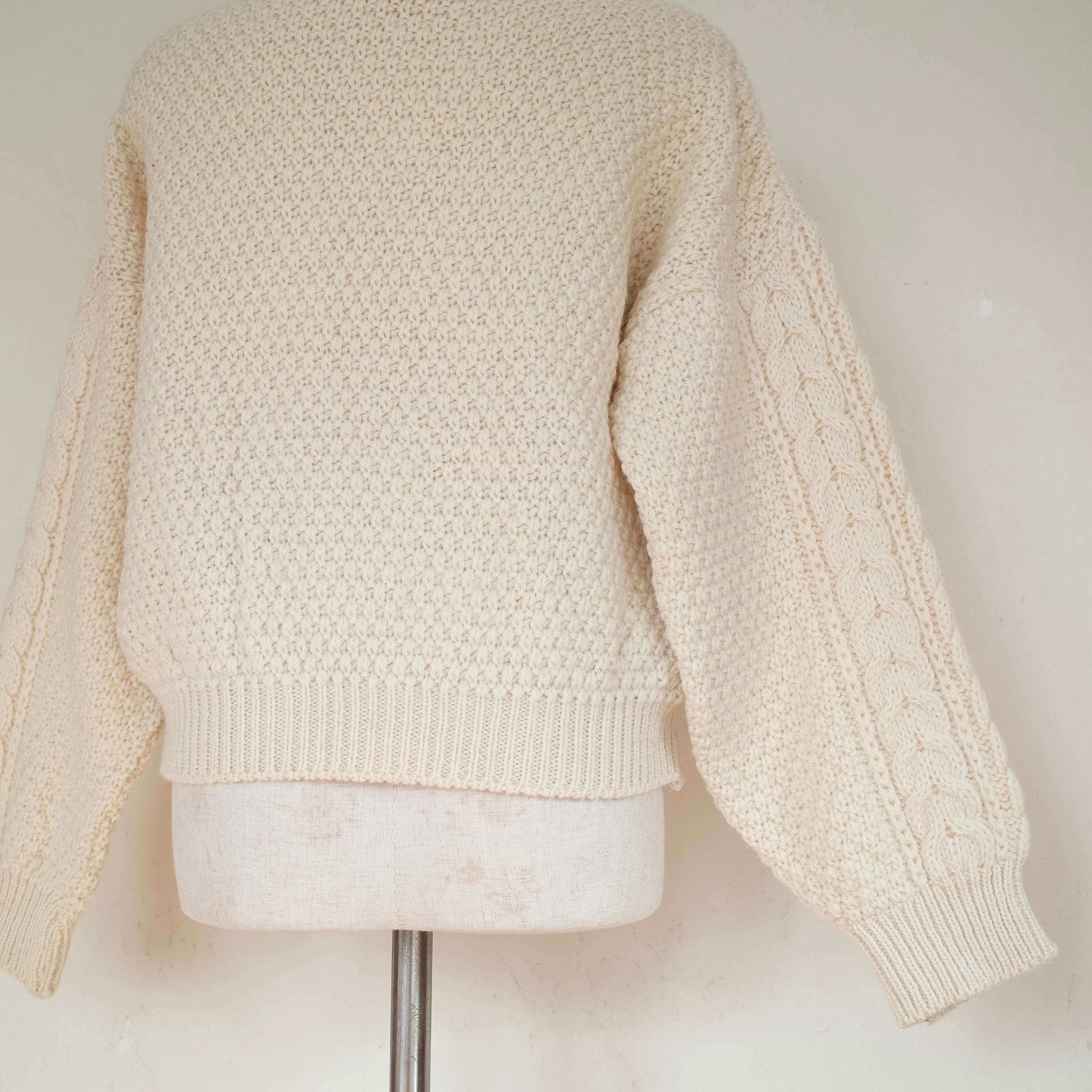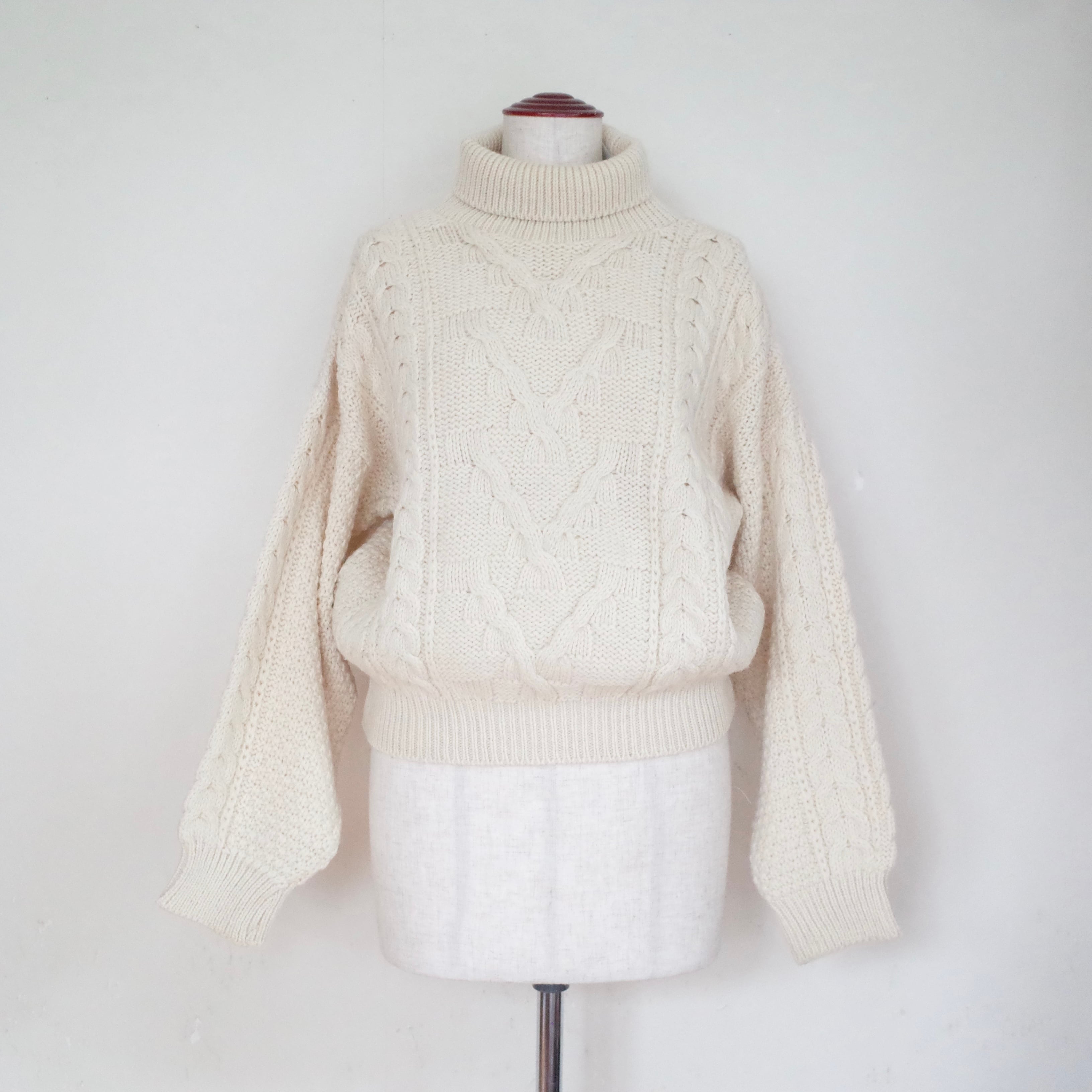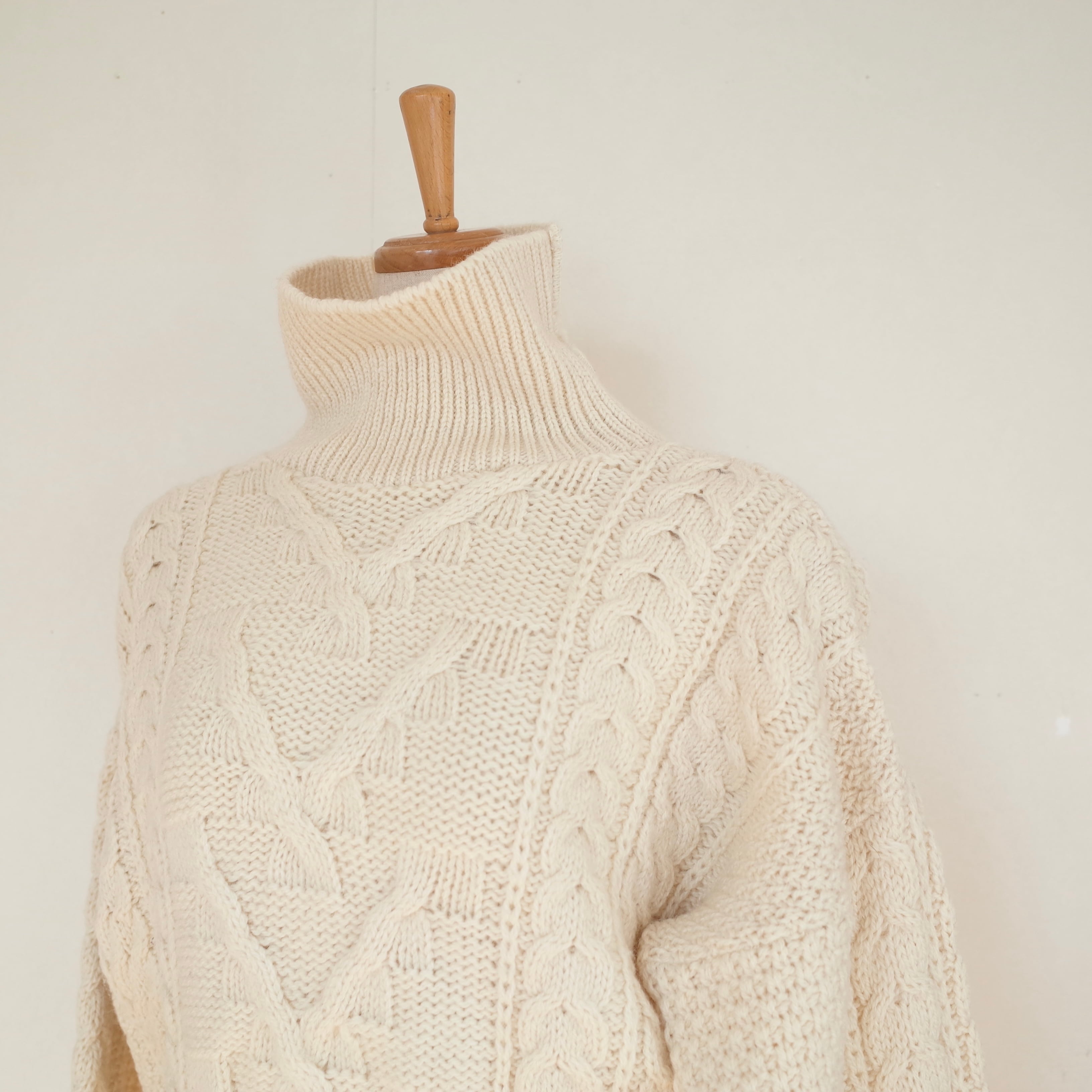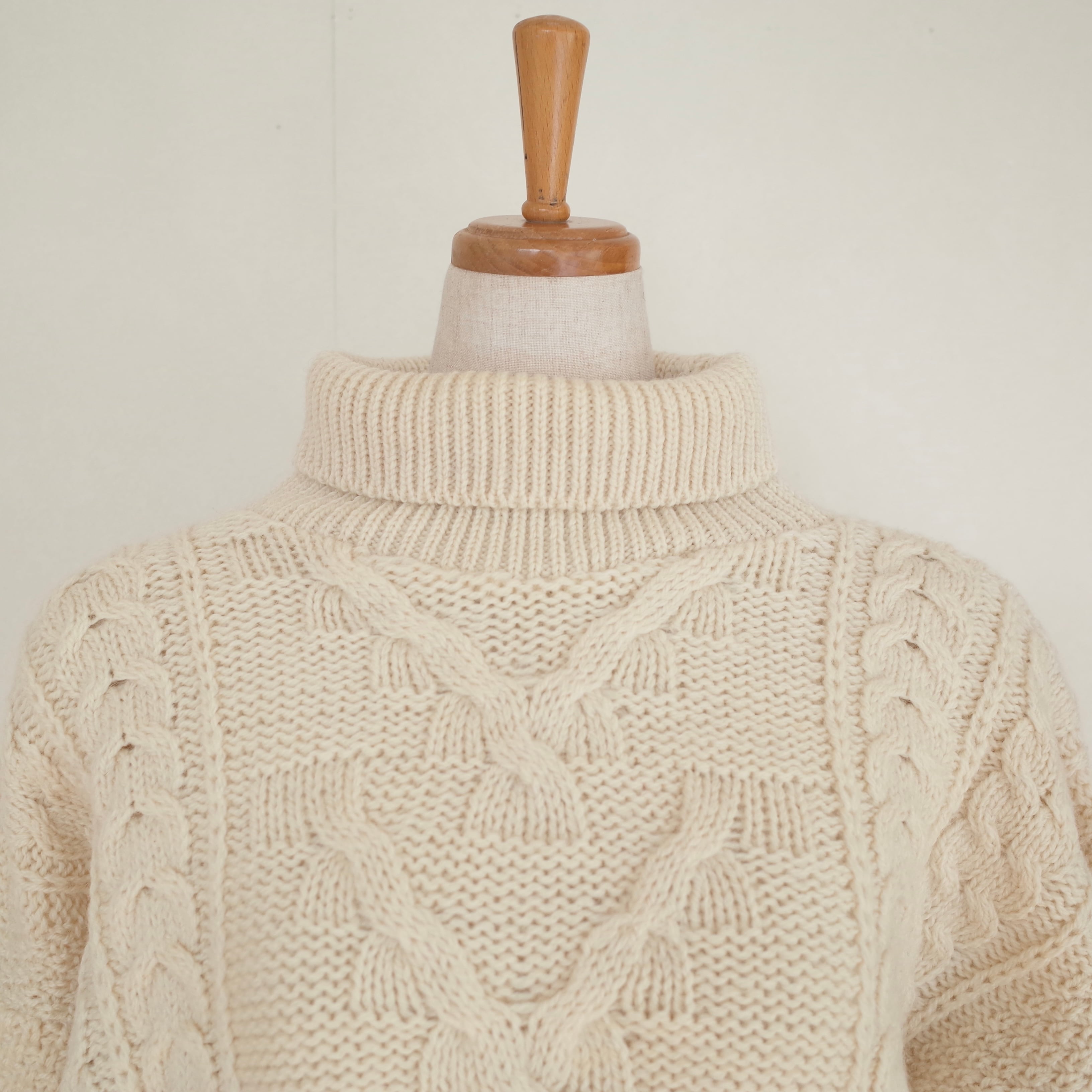 イングランド製タートルネックのアランニット。ネックは伸ばしても、折り返してモックネックのように着用してもかわいい一着。丈感、肩が落ち気味のアームシルエットなど、絶妙なバランスが抜群なニットです。