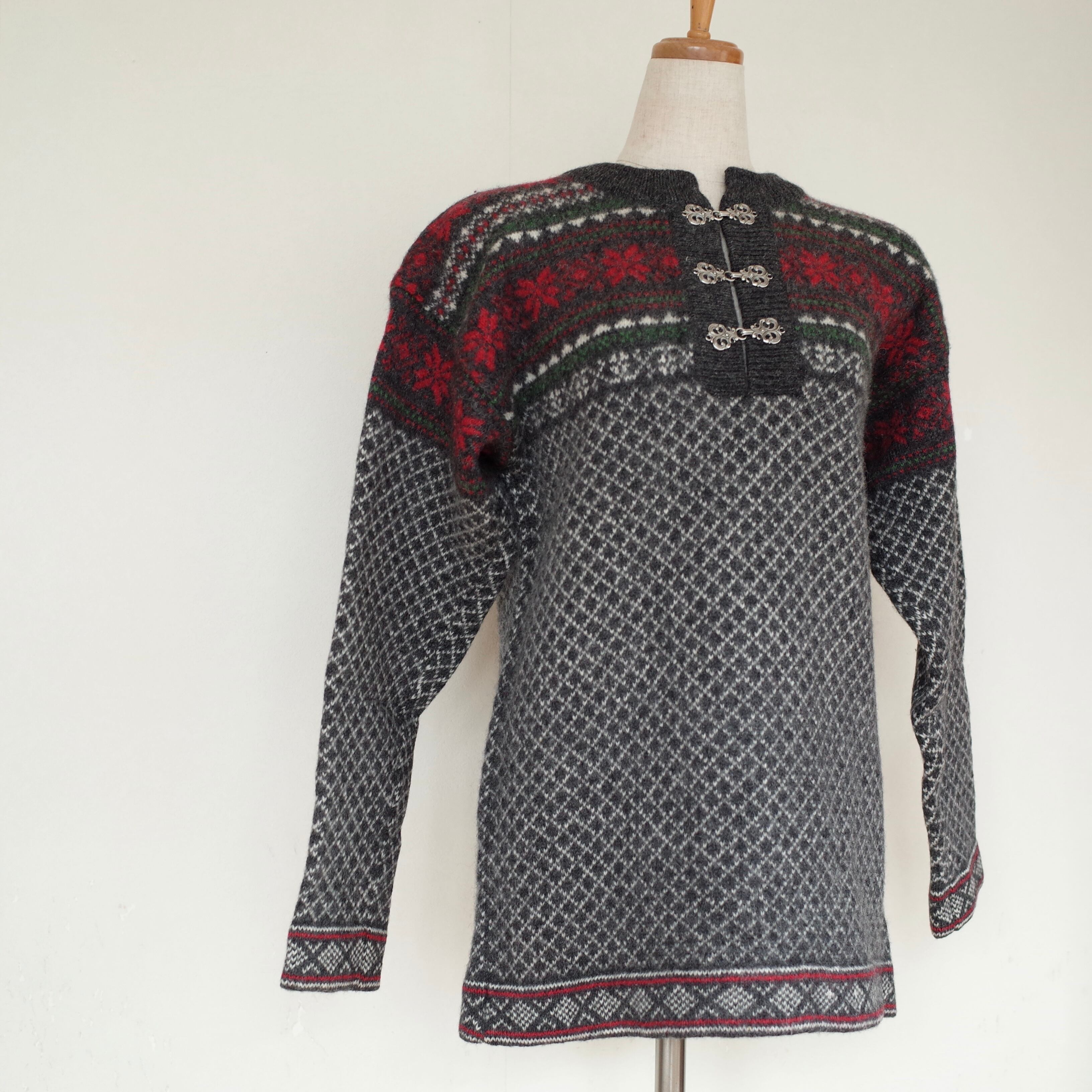 ノルディック柄のセーター。身幅がやや細めで、丈が長めのシルエット。ロングスカートを合わせたり、パンツスタイルにもバランスgood‼︎落ち着いたチャコールカラーにグリーンとレッドの配色も◎