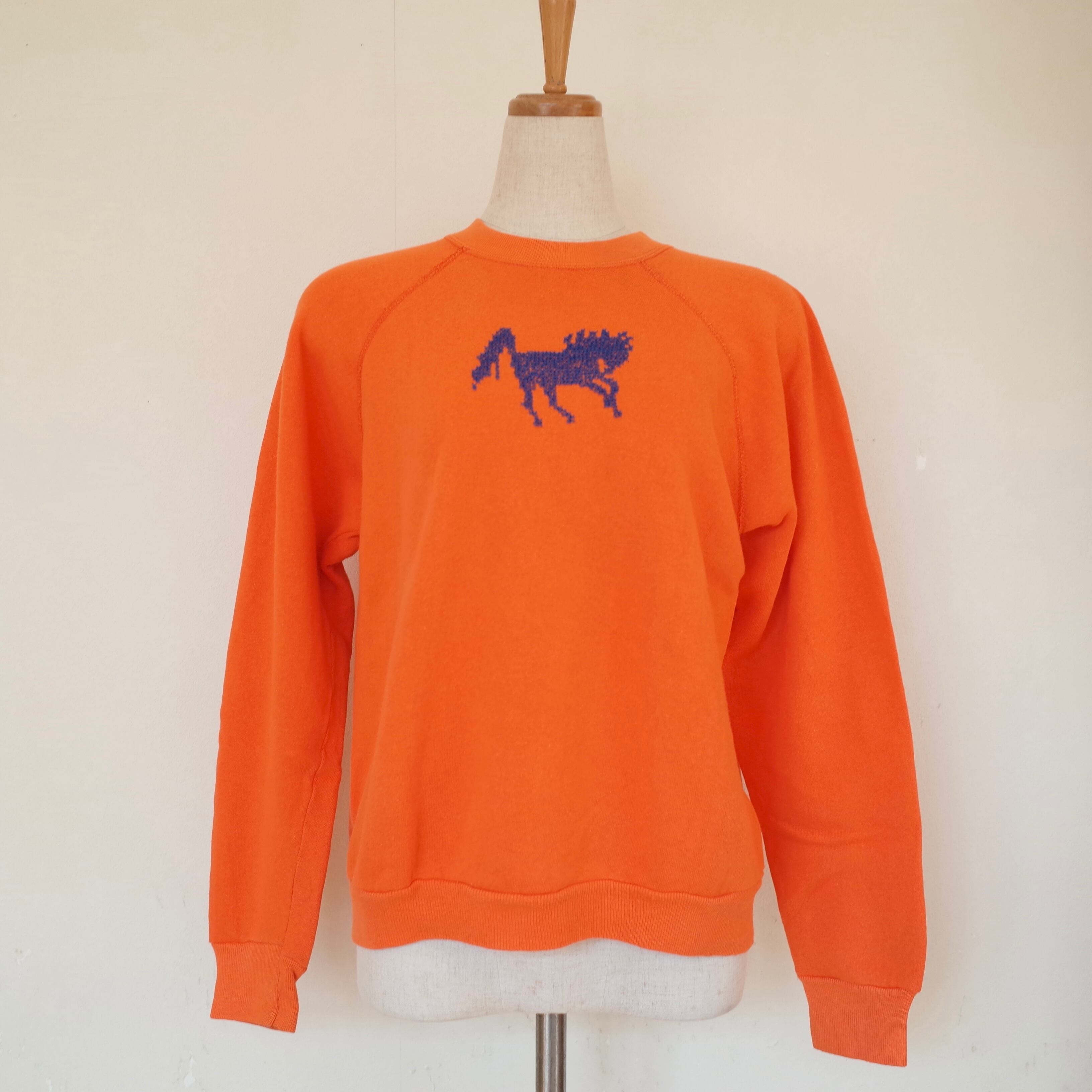 80年代アメリカ製の刺繍スウェット。ボディはTultexです。ブルーの馬の刺繍が目を惹く一枚。誰かが無地のスウェットに手作業で施したと思われます。オレンジ×ブルーの配色も◎世界にひとつだけの特別なスウェットです。