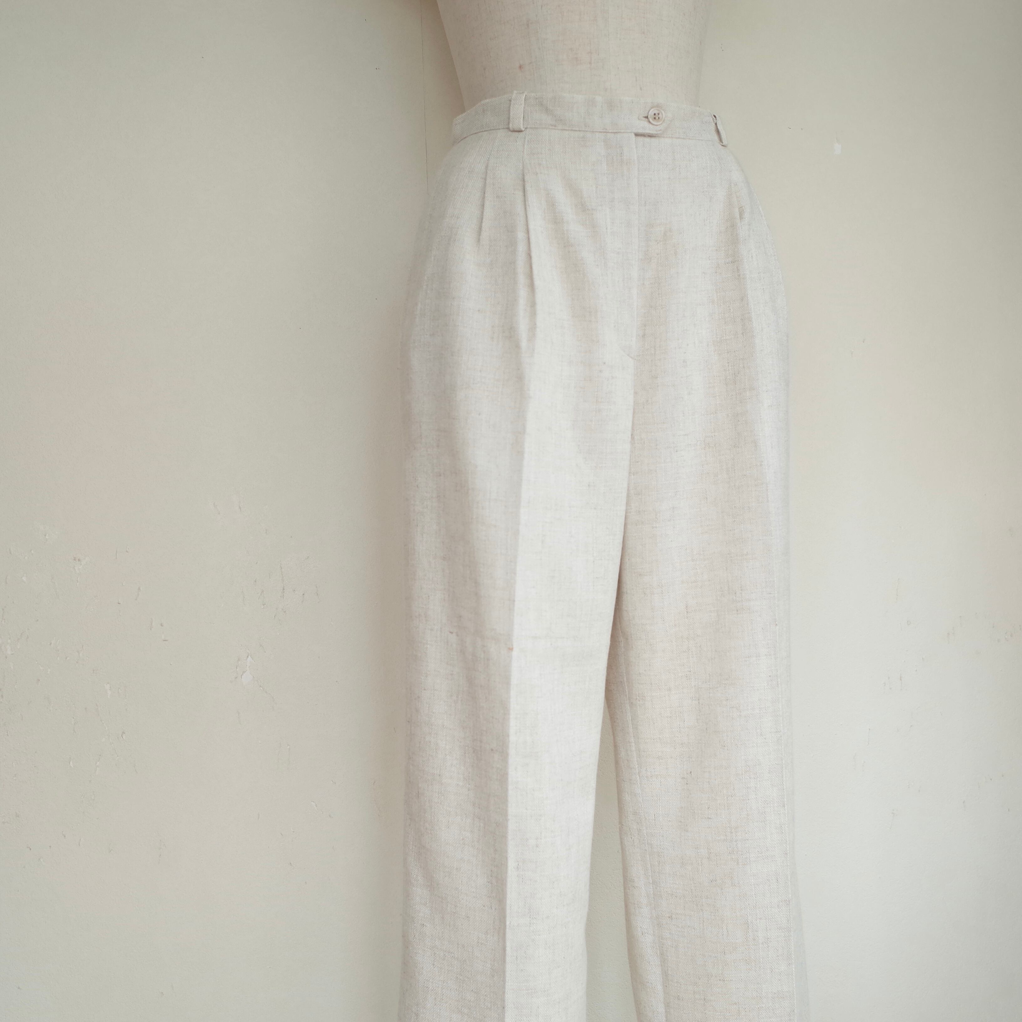 シルエットが綺麗なタックパンツ。リネンのような素材が上品で涼しげな印象の一本。裏地もちゃんと付いています。プリントTシャツと合わせたカジュアルなスタイルからジャケットと合わせた綺麗目コーディネートまで幅広く活躍してくれるパンツです。