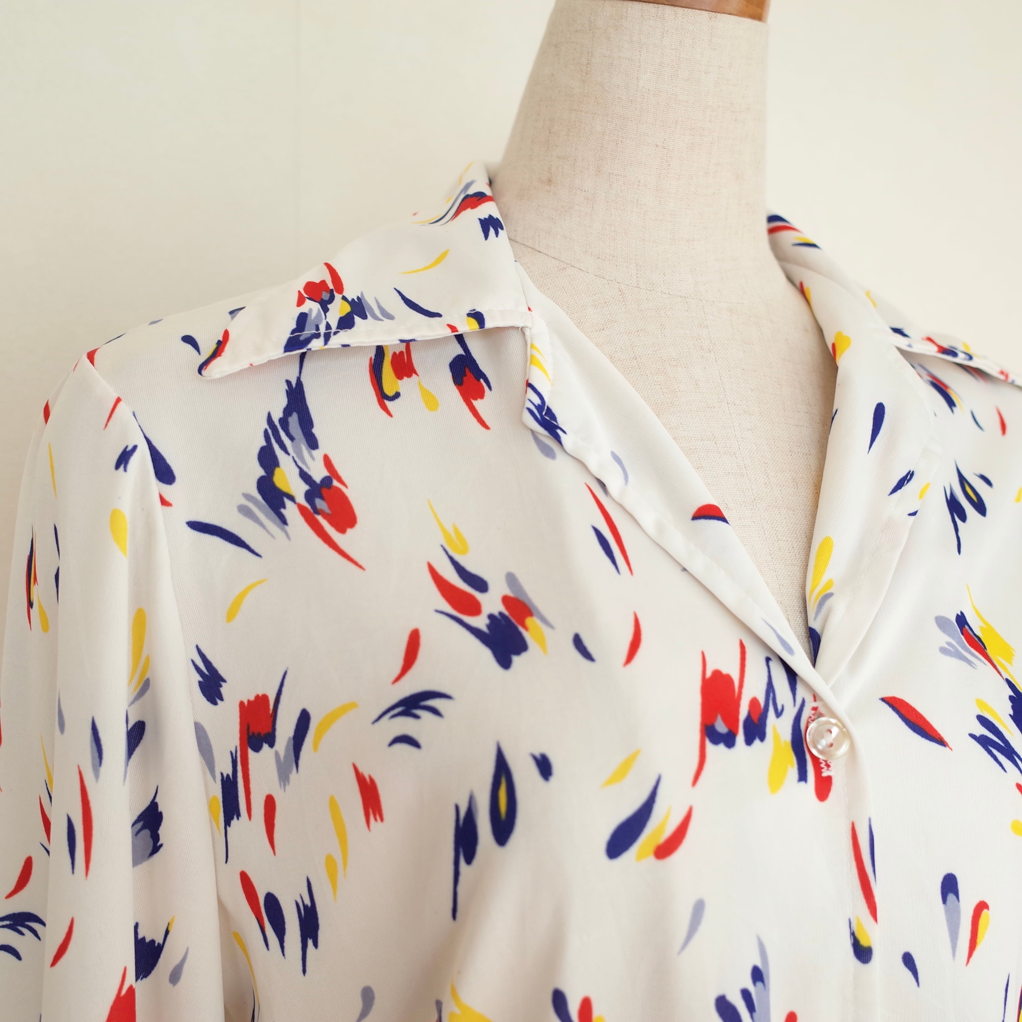開襟のポリシャツ。ブルー、レッド、イエローの筆で描かれたようなプリントのデザインがgoodな一枚。デニムにインしたり、Tシャツの上に羽織っても◎雰囲気あるポリシャツです。