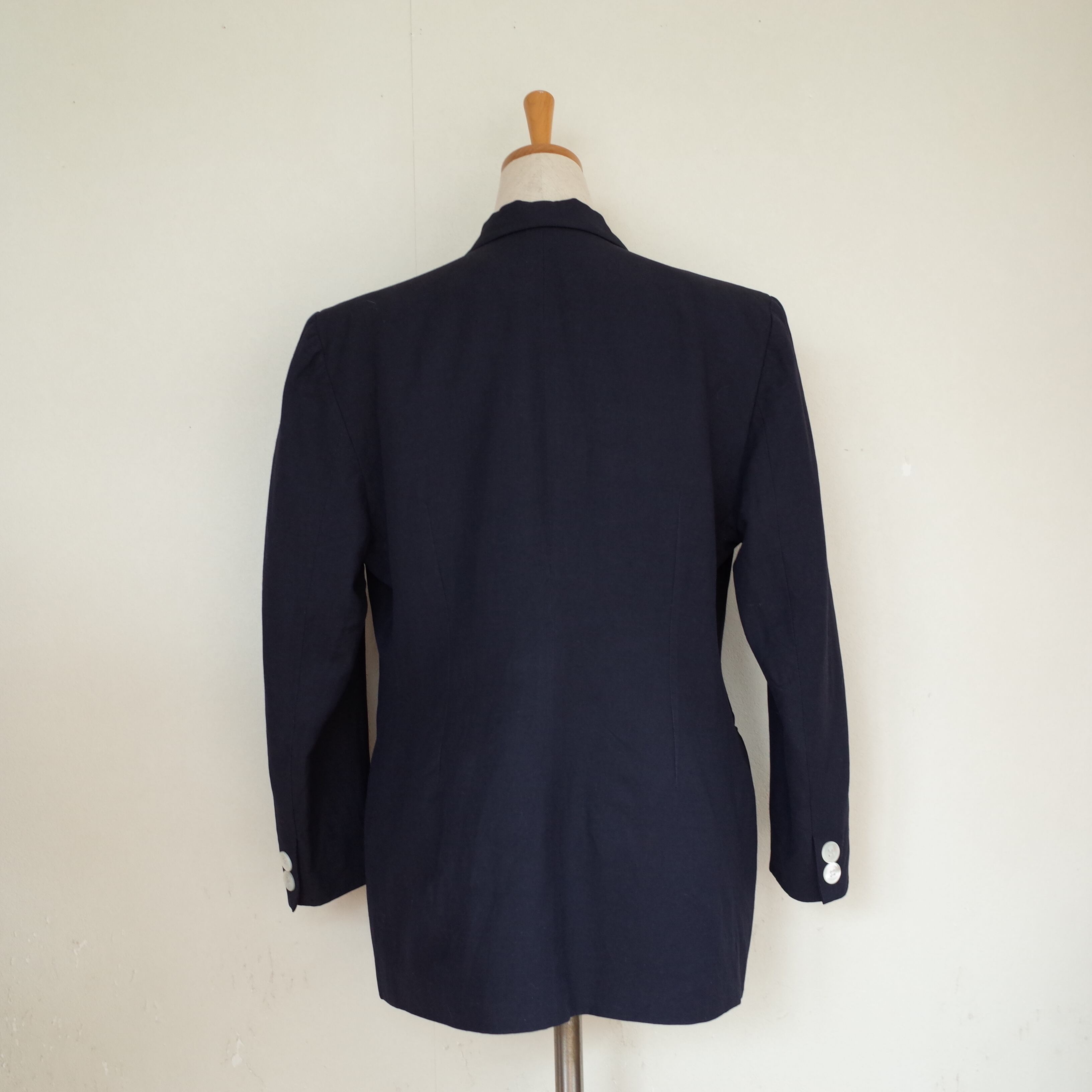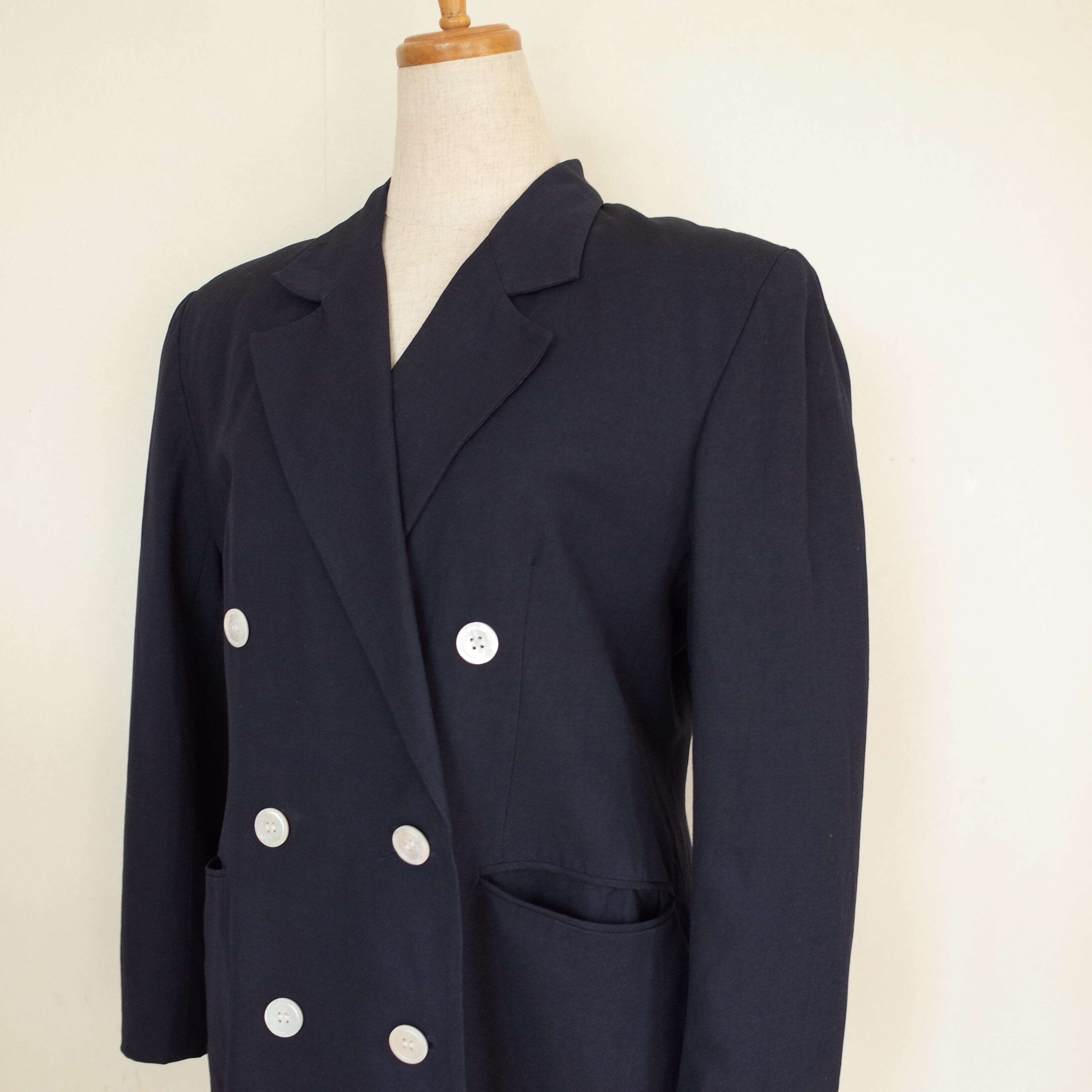 使い勝手の良いネイビーのダブルジャケット。レーヨンリネンのサラッとした生地で、ラフに羽織れるサイズ感。カジュアルにカットソーとデニムやロングスカートなどを合わせて。袖をまくって着用も◎