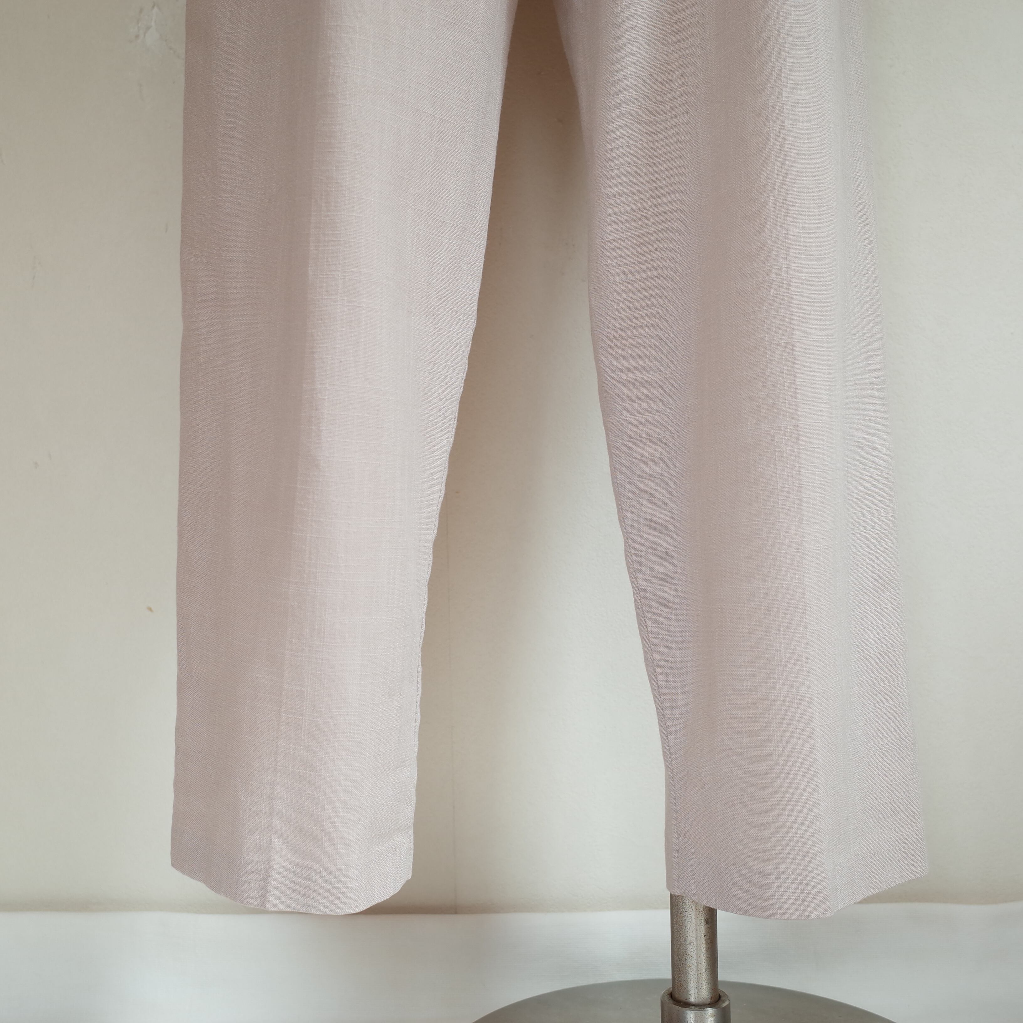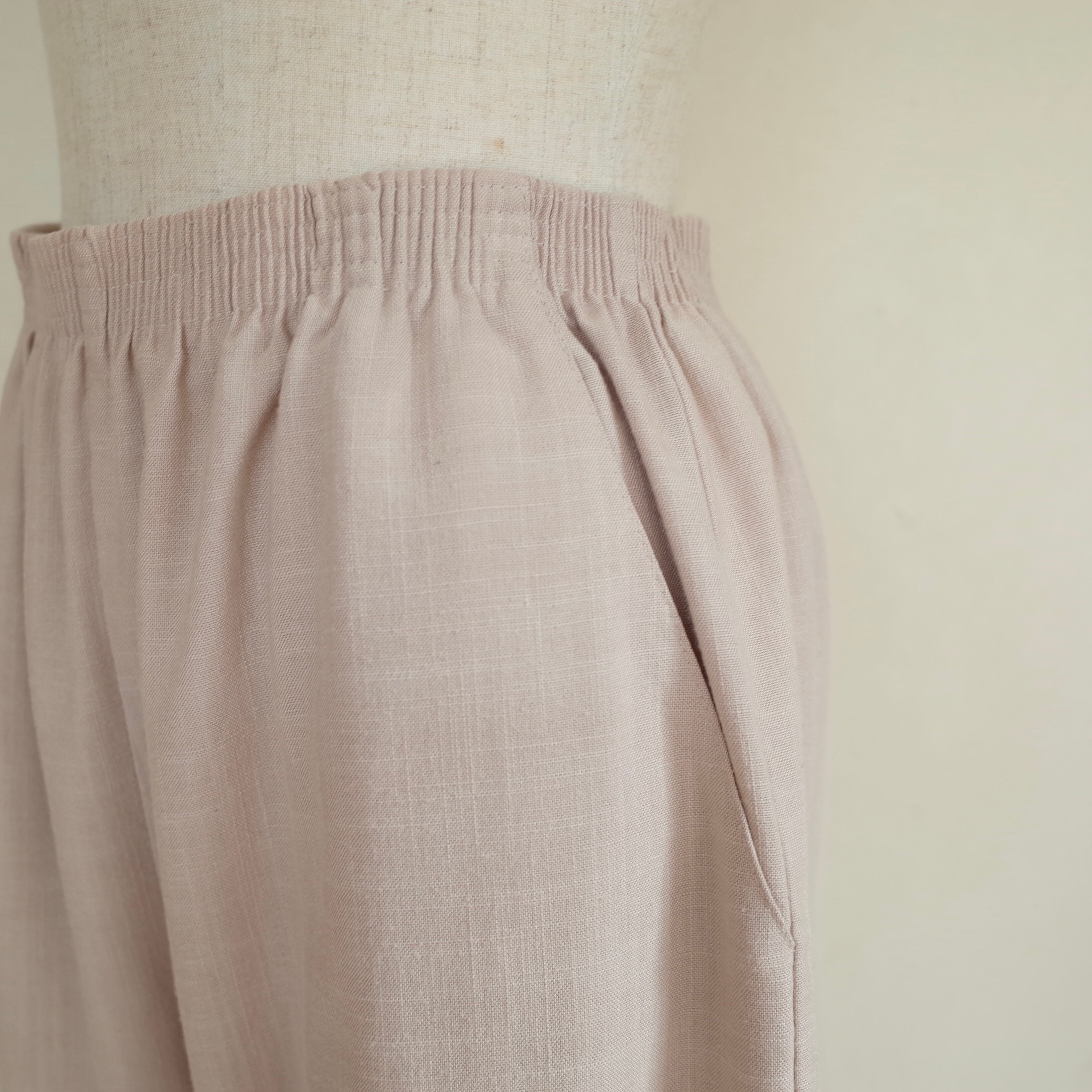 レーヨン混のサラッとした肌触りのイージーパンツ。リネンのような生地感で涼しげな一枚。カラーも着回しのきくベージュ。ウエストはゴムで楽ちんな履き心地の為、お家でのリラックスウェアとしても◎コーディネート次第では綺麗目にも着用頂ける万能なパンツです。