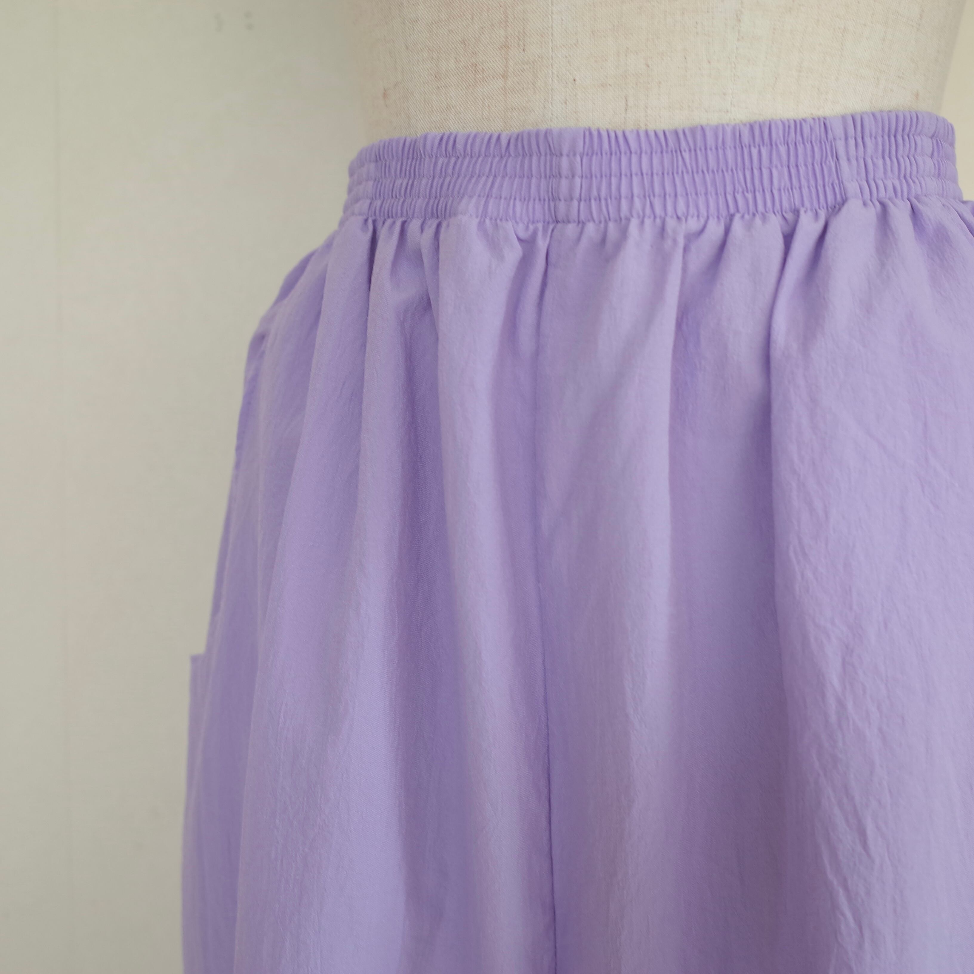 ナイロンのようなシャカシャカとした少し光沢のある薄手の生地感のイージーパンツ。カラーは今年らしいライトパープル。ウエストはゴムで楽ちんな履き心地の為、お家でのリラックスウェアとしても◎コーディネート次第では綺麗目にも着用頂ける万能なパンツです。