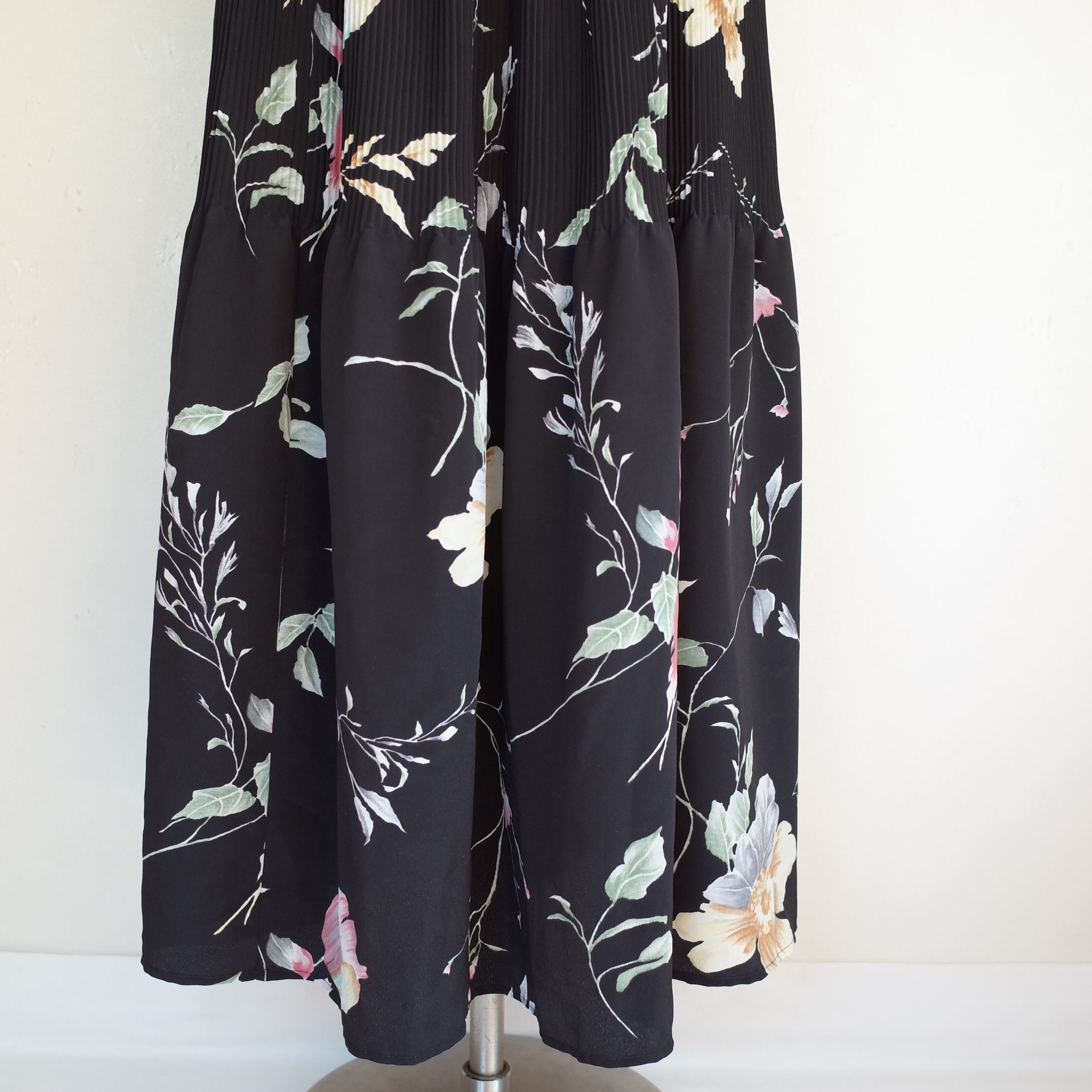 アメリカ製フラワープリントのロングスカート。ウエストからもも辺りまで細かいプリーツが入っている、切り替えのデザインが珍しい一着。カジュアルにカットソーやスウェットと合わせても◎ジャケットやヒールを合わせて綺麗目にも。ウエストはゴムで、長時間座っていてもシワになりにくいラフなスカートです。