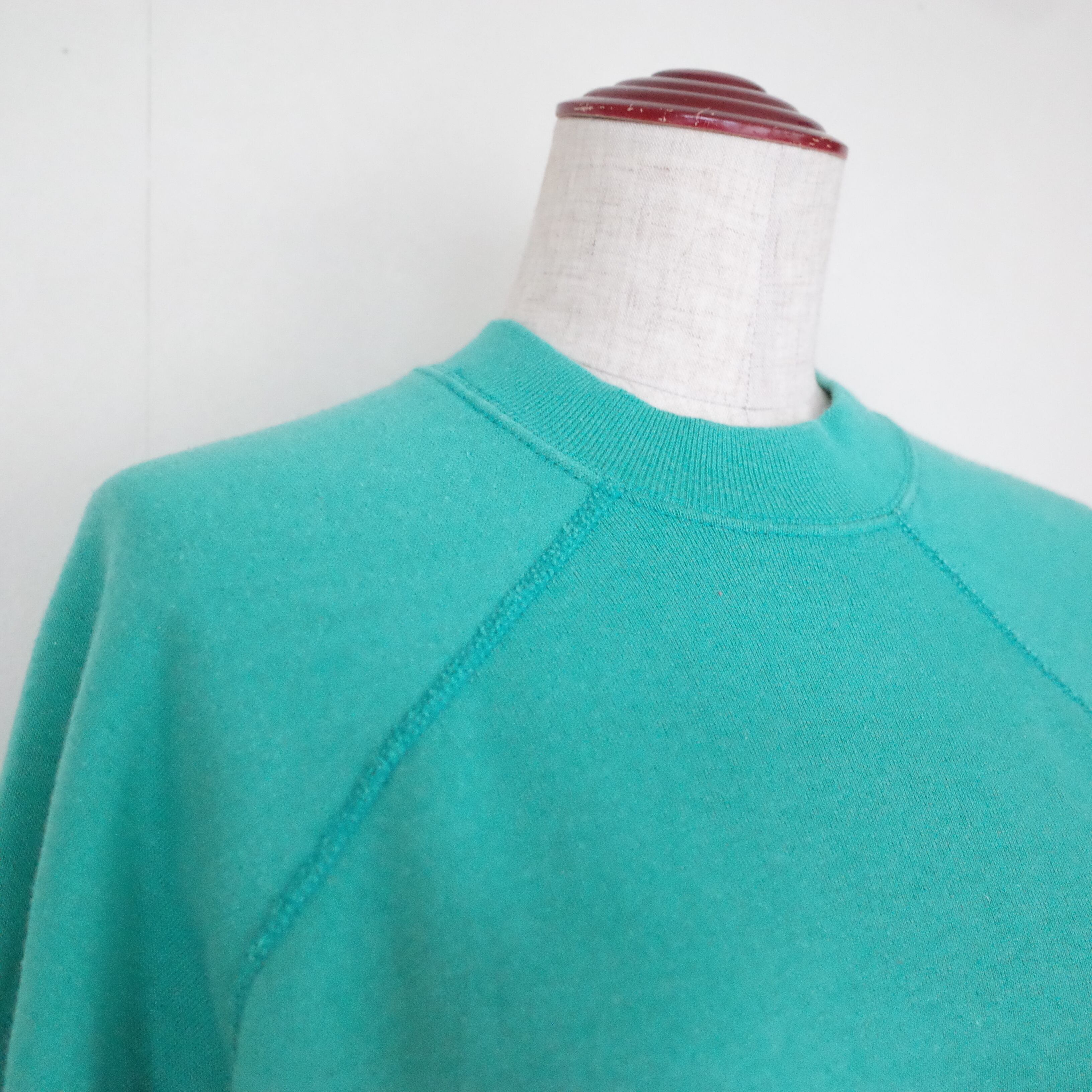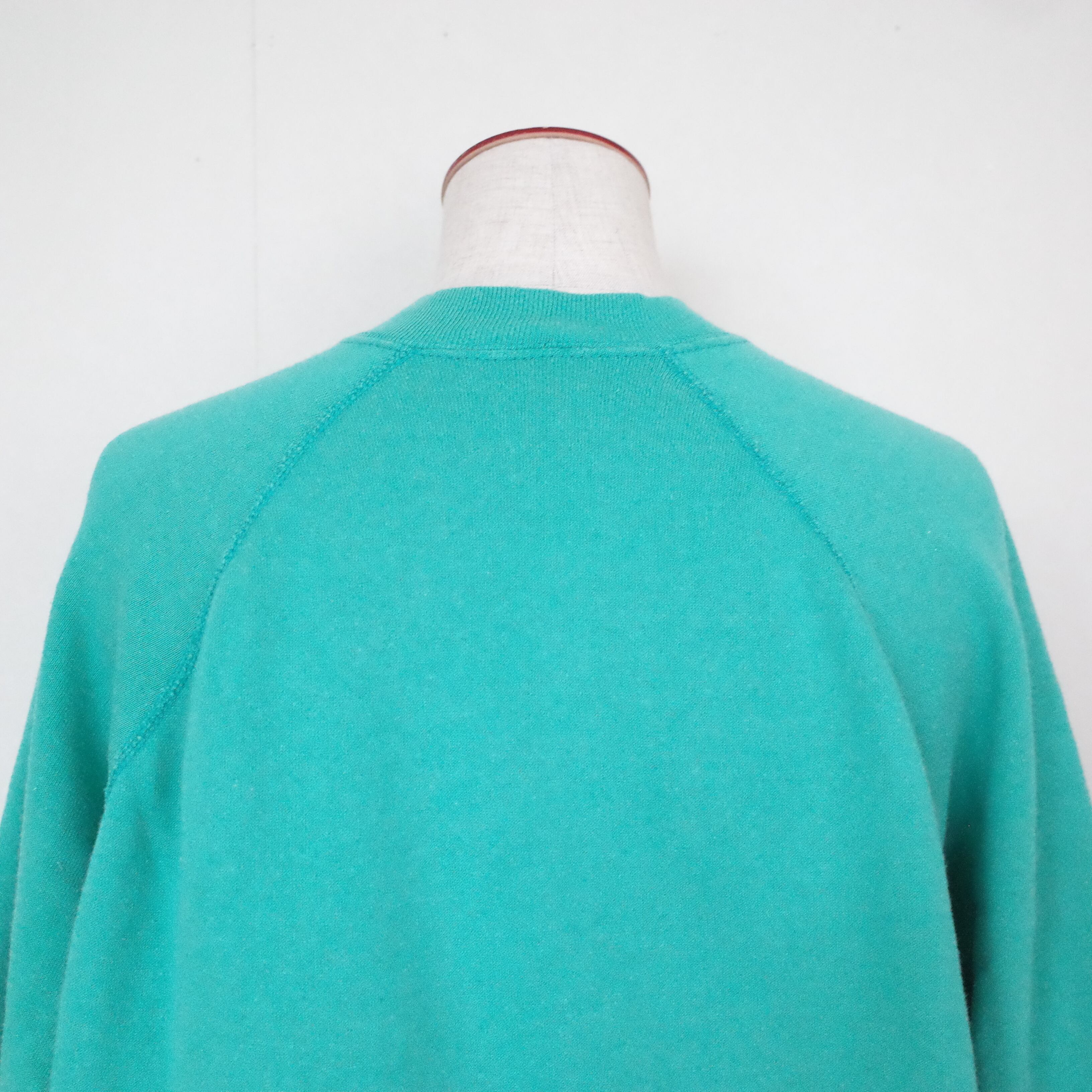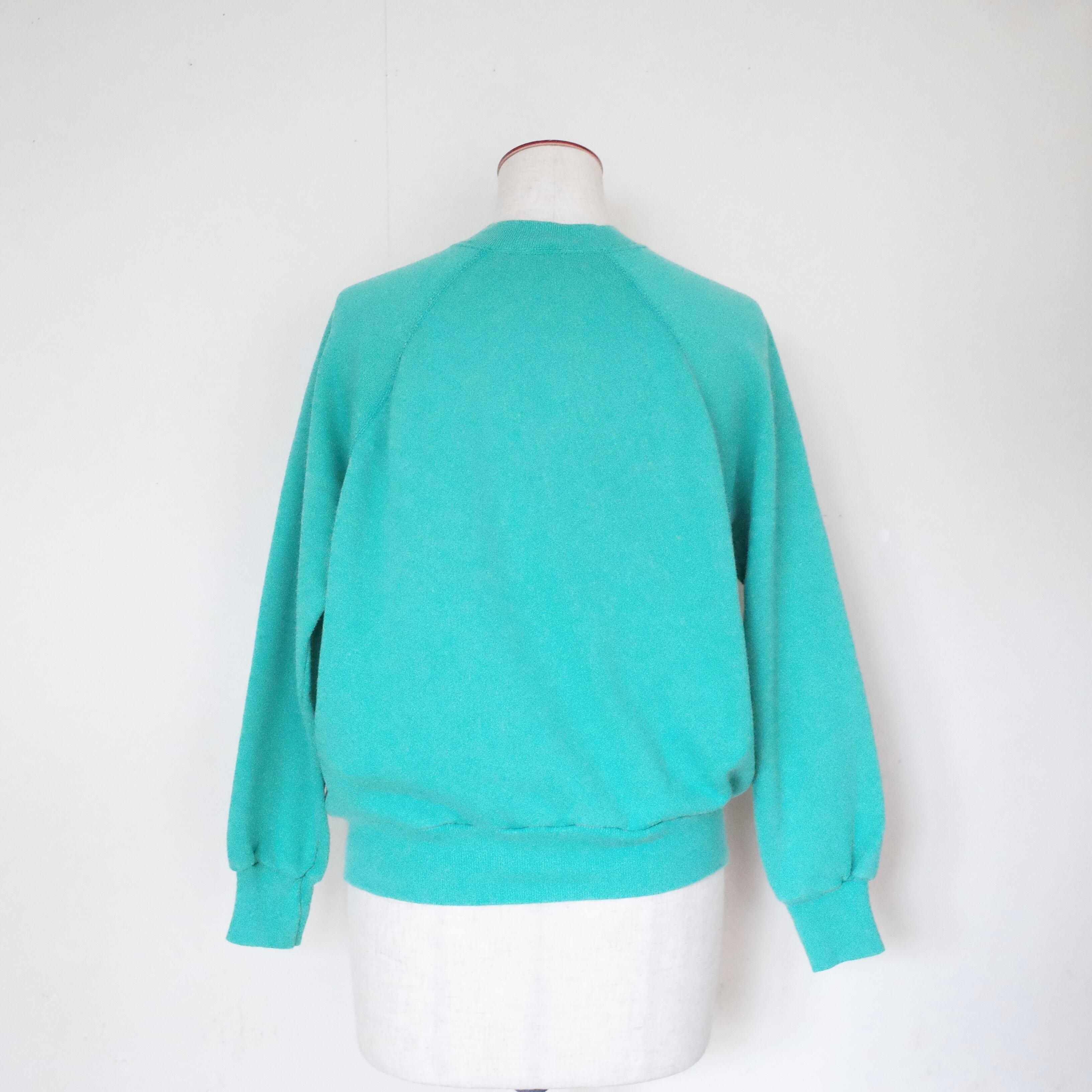 80年代アメリカ製無地スウェット。エメラルドグリーンのカラーがアメリカらしい一枚。差し色としても使える無地のスウェットはカラーバリエーションを持っておきたいアイテムのひとつです。