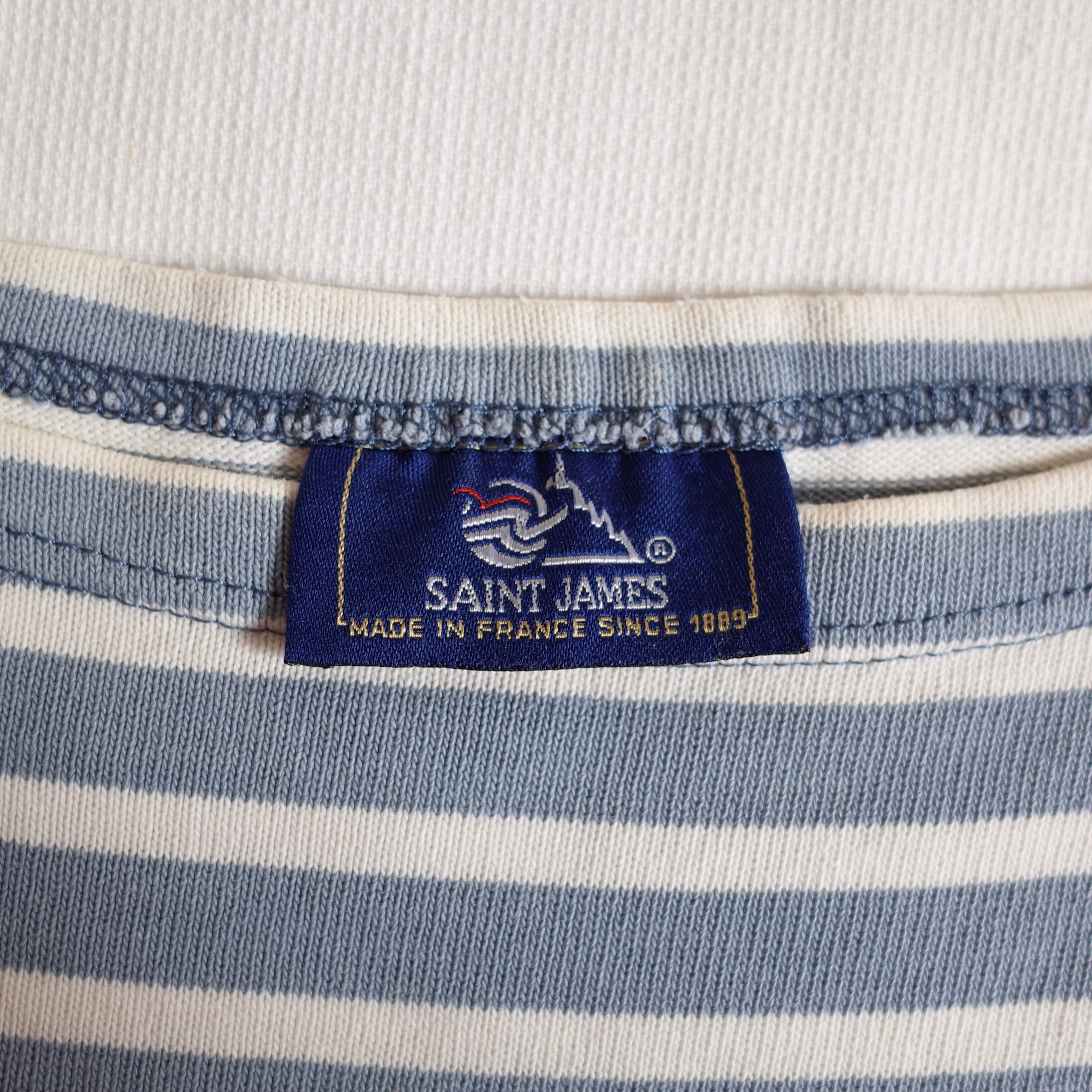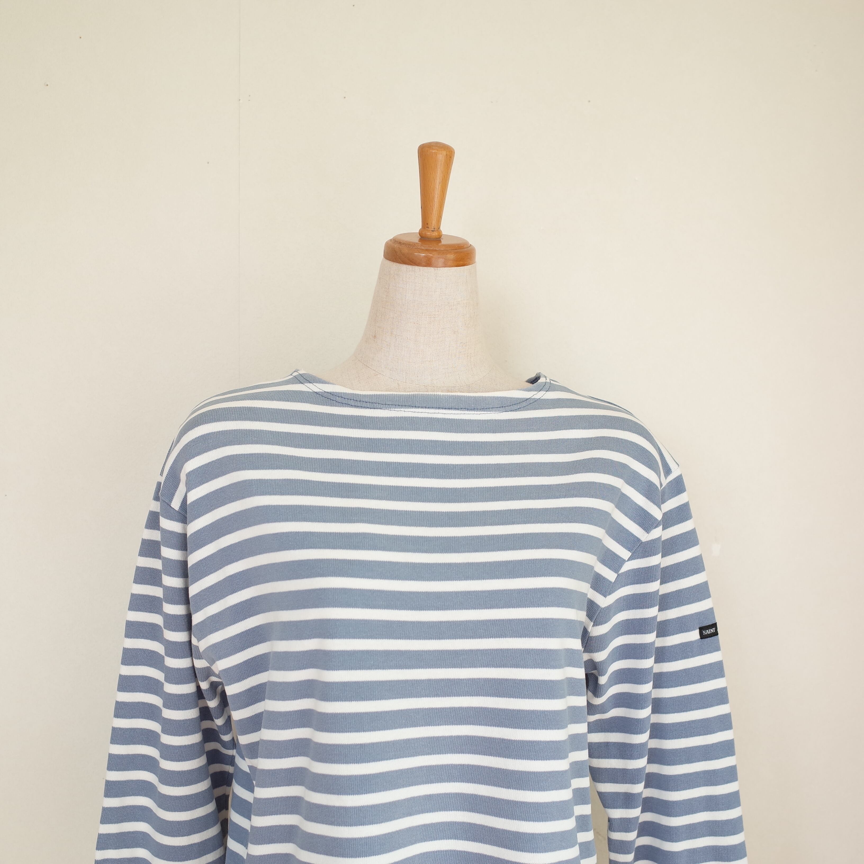 80年代フランス製Saint Jamesのバスクシャツ。淡いブルーとホワイトのボーダーが、フランスのエスプリを感じさせます。海の暮らしから生まれた実用的なデザインとコットン100%の素材は大変丈夫で、着込んで洗濯を繰り返していくうちに、だんだんと風合いが出て、ニュアンスを保ちながら長く愛用することができます。こちらは既に着込まれている為、味がある一枚です。ユニセックスで着用頂けるサイズ感で、女性が着用するとビックシルエットがかわいいです。肩が落ちている感じがより抜け感を演出してくれます。