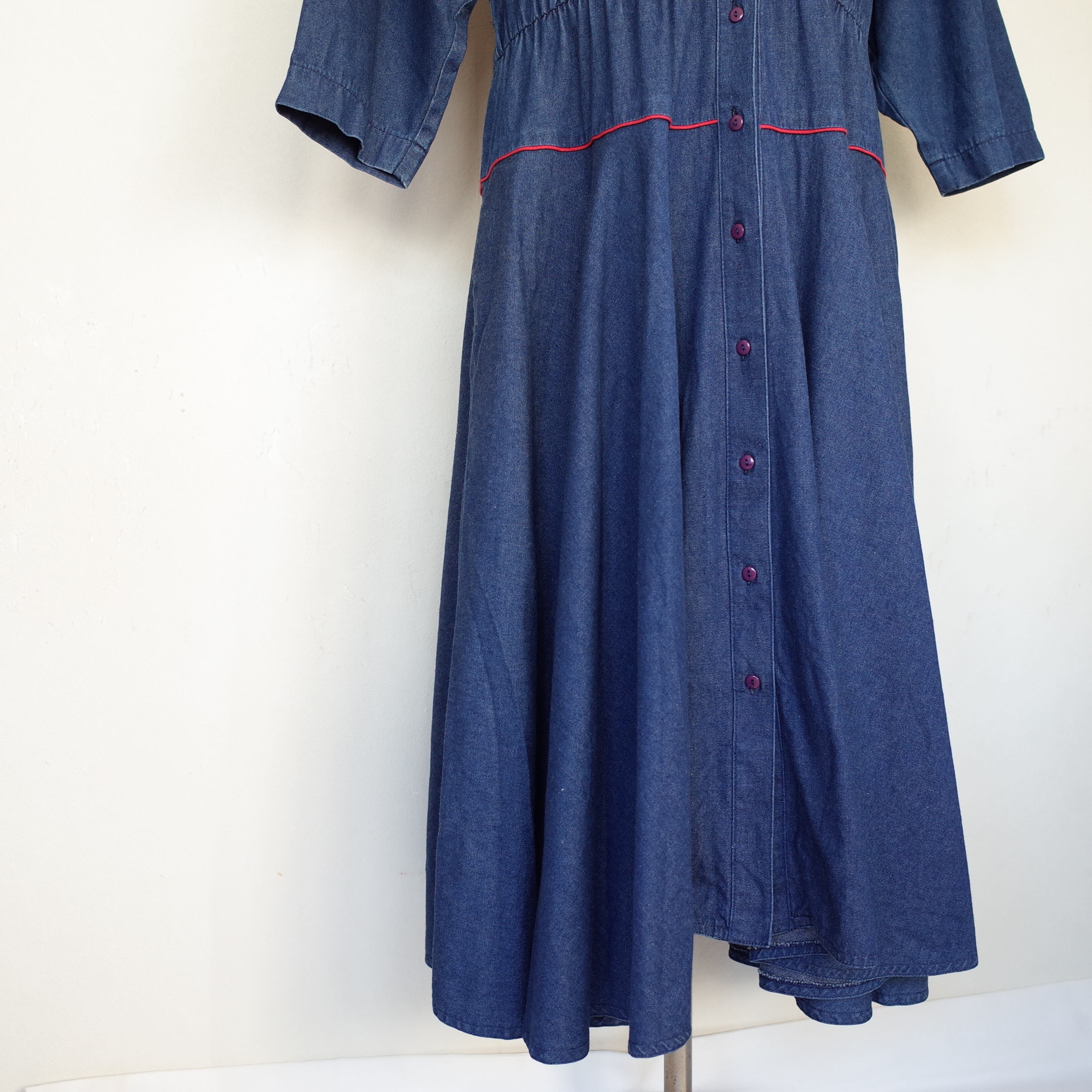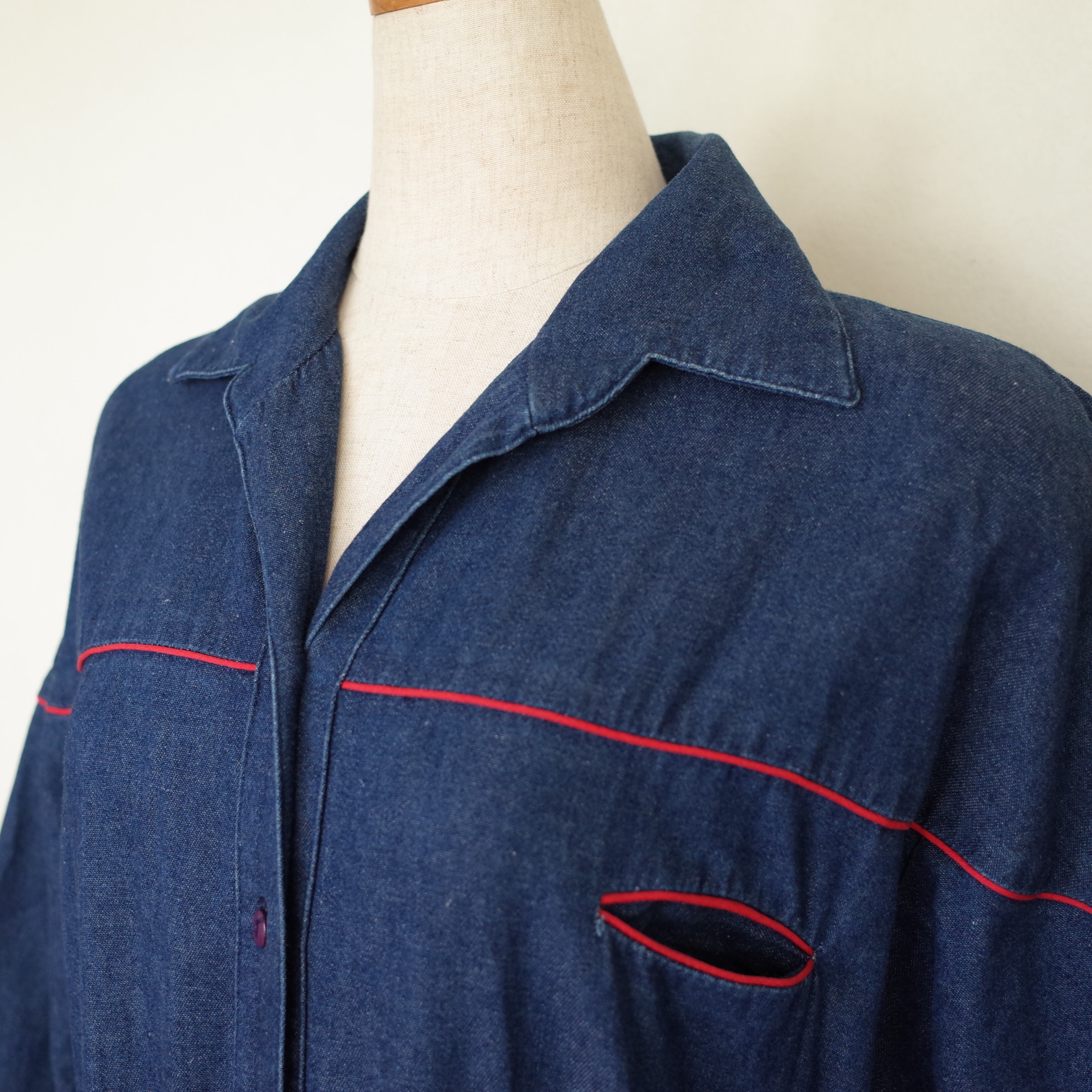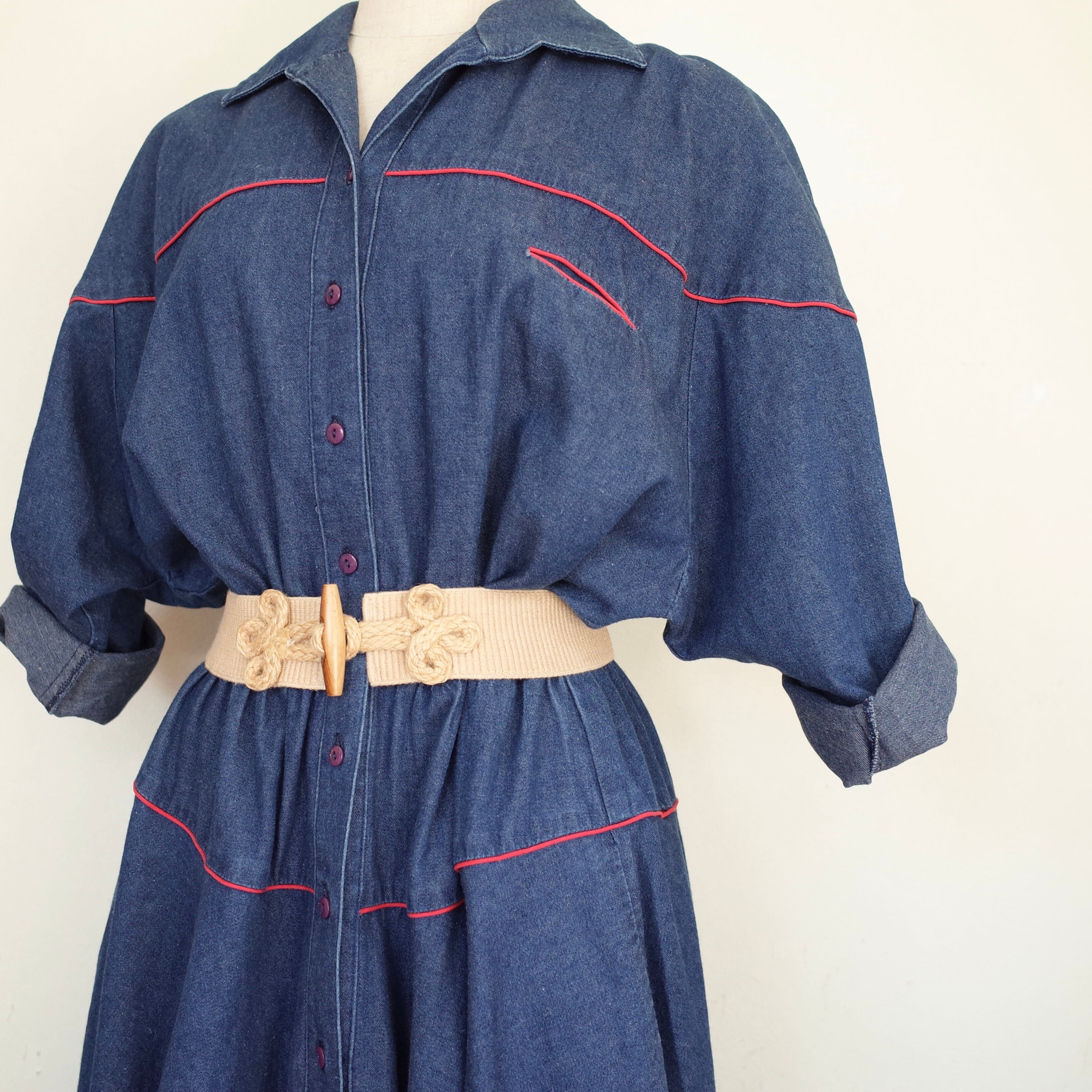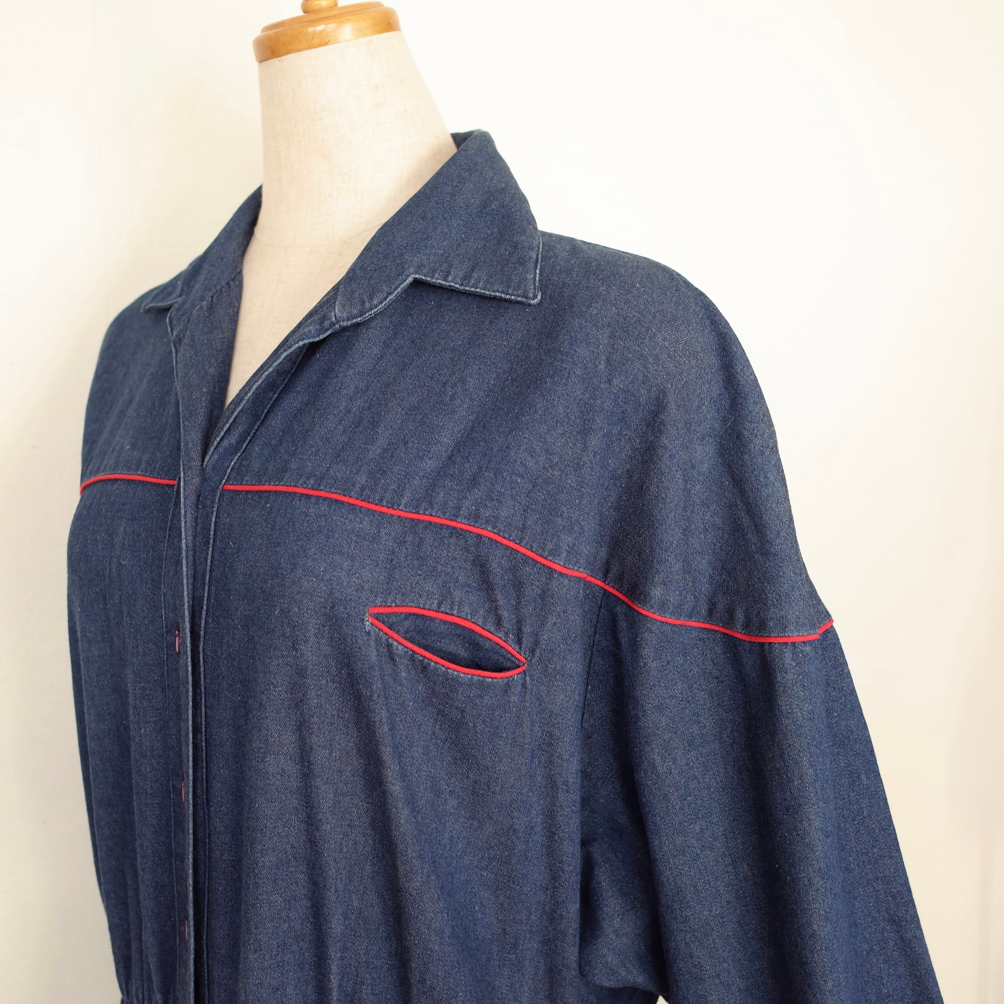 デニムに赤いパイピングが可愛い、柔らかいデニム素材のワンピース。開襟でラグランスリーブのウエスタンなデザイン。ベルトでウエストマークをすればよりシルエットが洗練されます。両サイドにポケットも付いるので前を開けて羽織としても◎