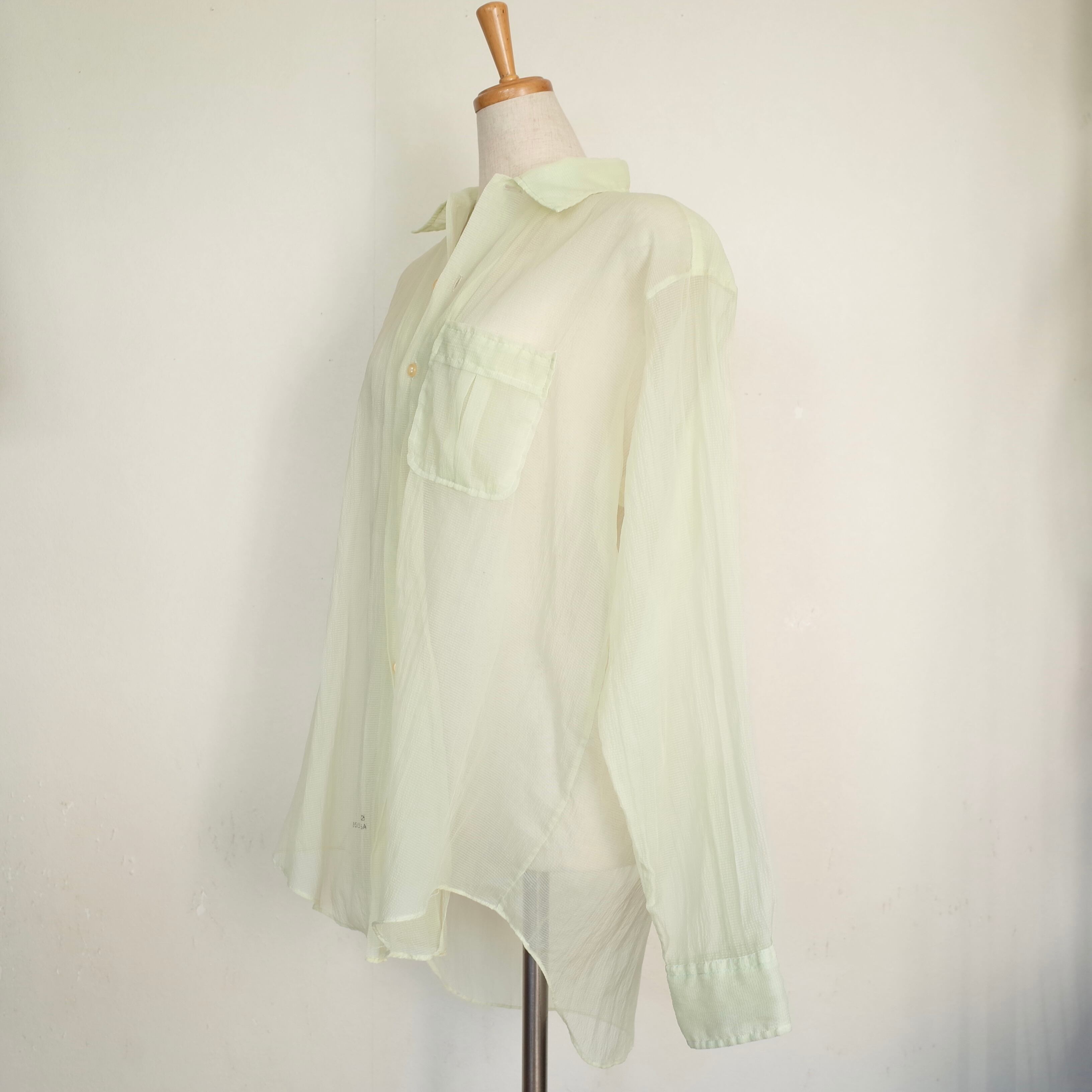 ヴィンテージのナイロンシャツ。オーバーサイズのシルエットと優しいイエローカラーが今っぽい一枚。シアー感があるので、今の時期に羽織としてぴったりなシャツです。