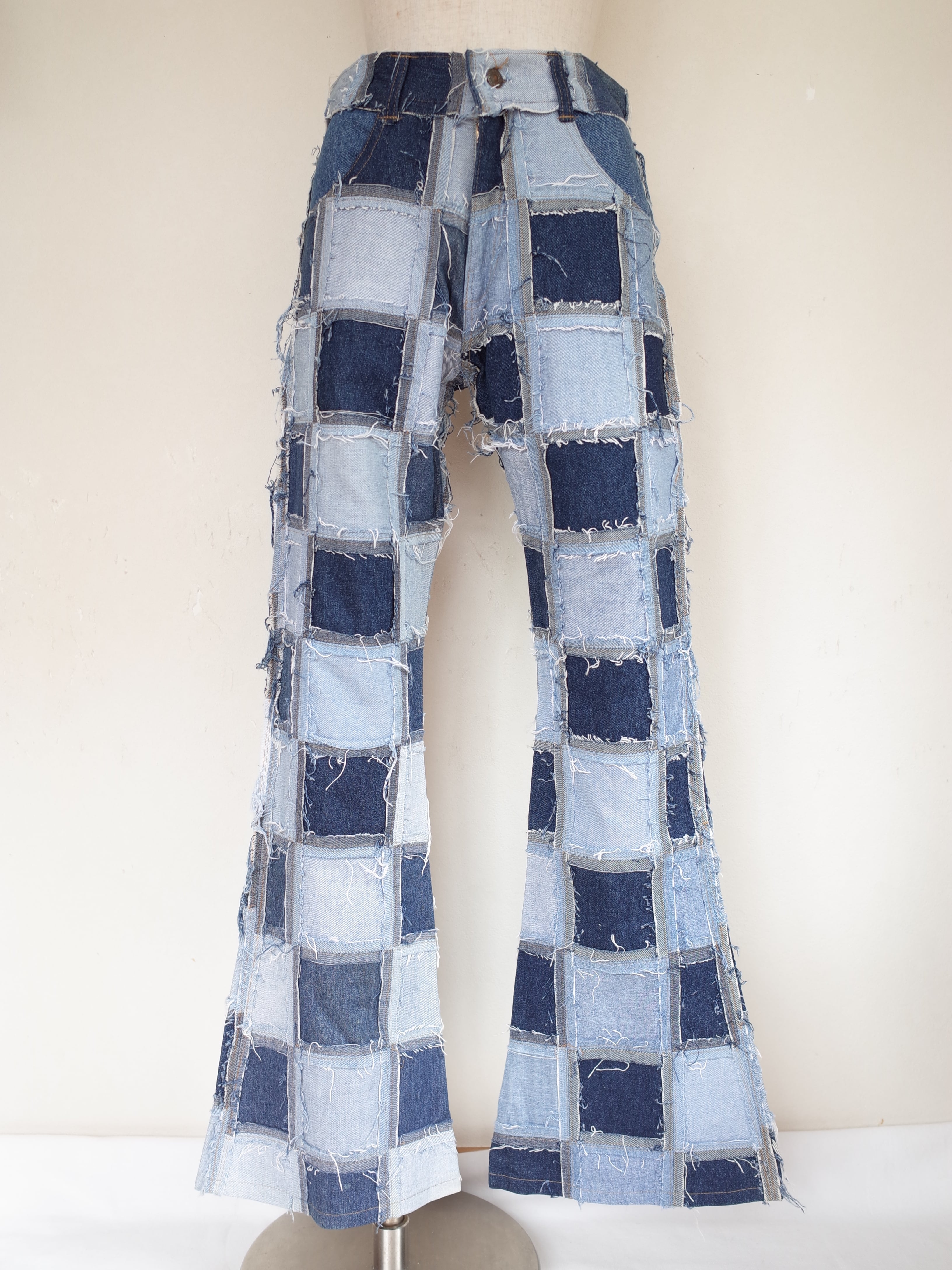 クレイジーパターンのリメイクデニムパンツ。フレアの大きいブーツカットのレングスで、70'sファッションを思いっきり楽しめる個性的な一本です。
