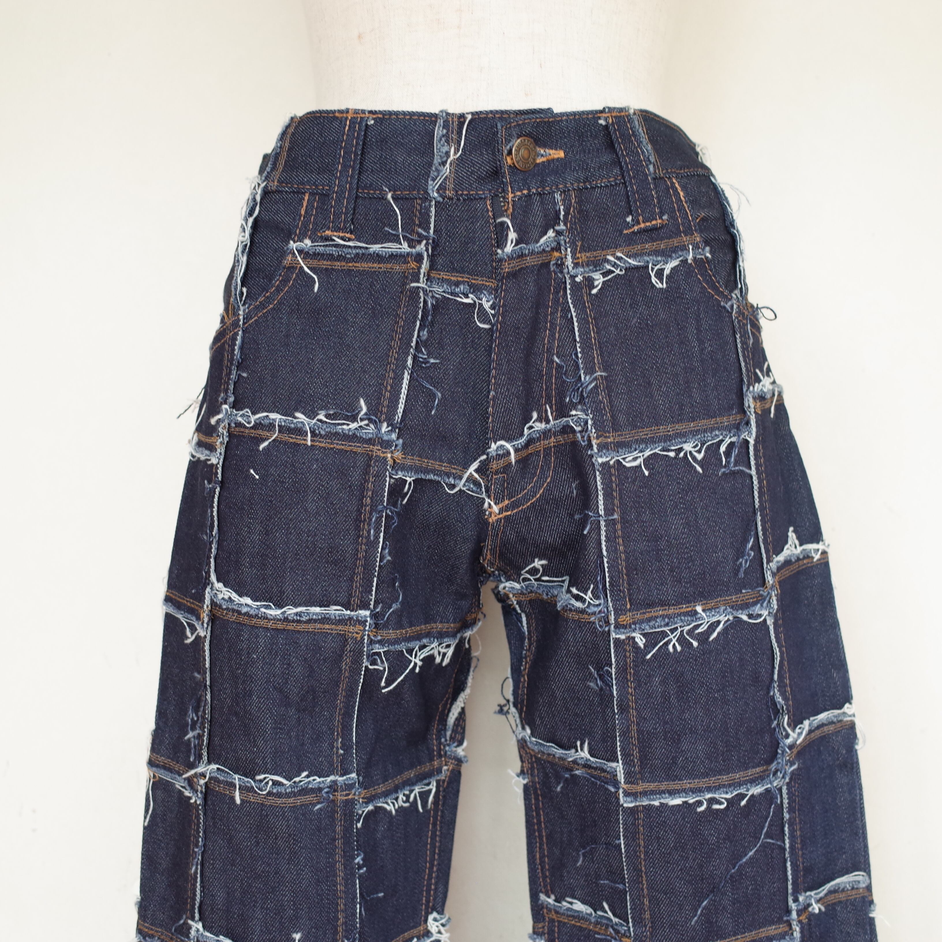 クレイジーパターンのリメイクデニムパンツ。ブーツカットのレングスがヒッピー感満載の一本。オーバーサイズのシャツなどを合わせれば、今っぽい要素も兼ね備えたスタイリングに。70sファッションを楽しめる個性的なデニムです。