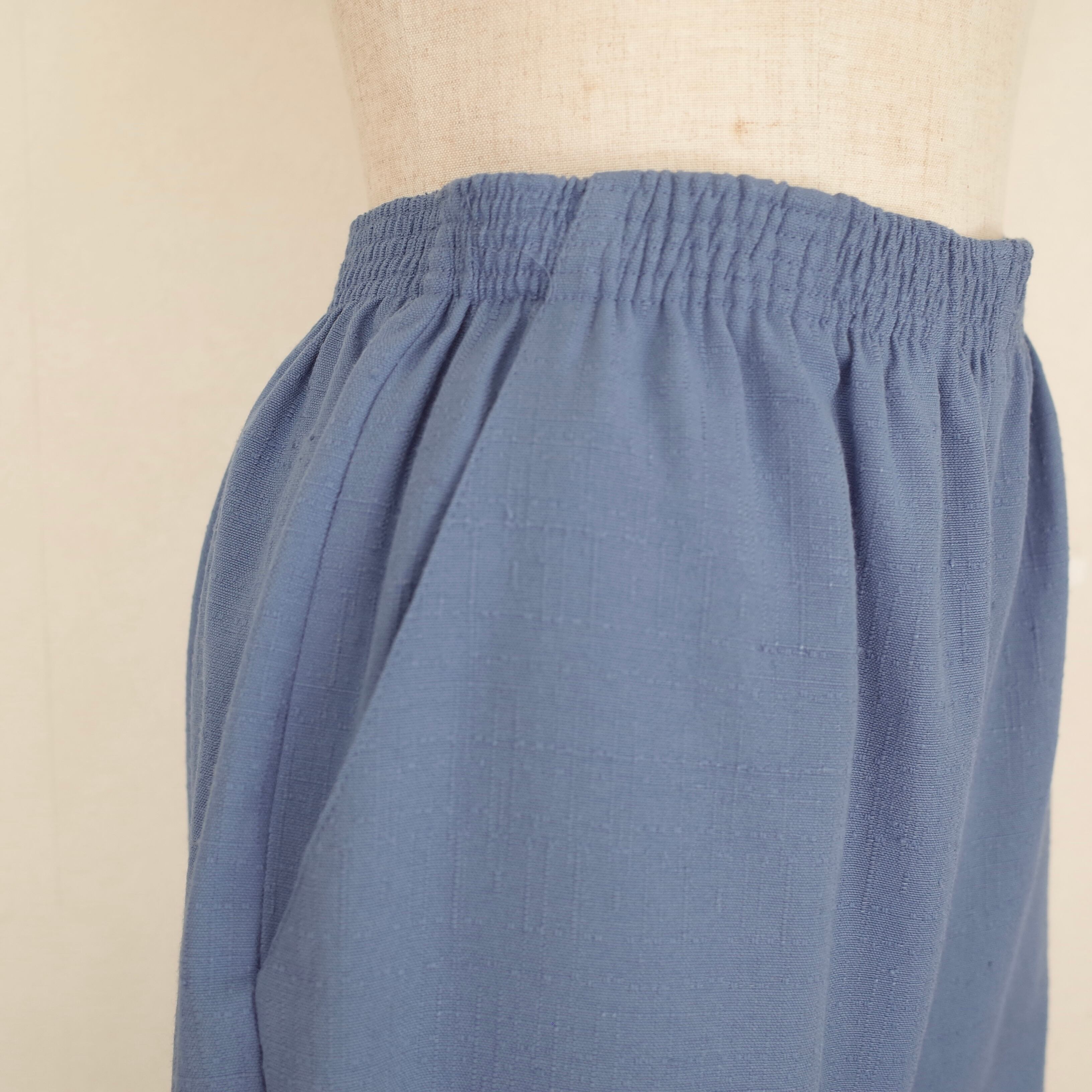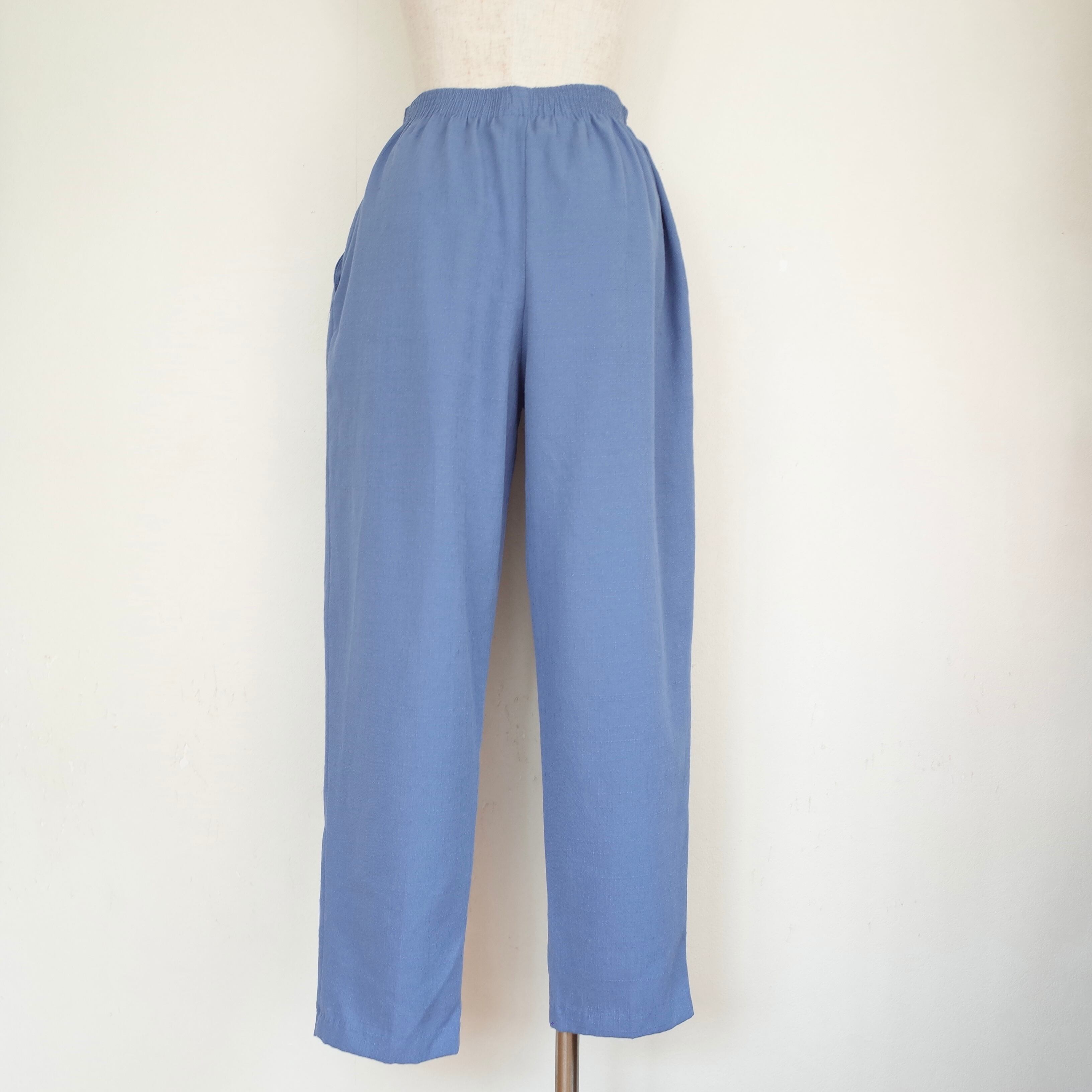 今年らしいサックスブルーのカラーが綺麗なイージーパンツ。ウエストはゴムで楽ちんな履き心地の為、お家でのリラックスウェアとしても◎コーディネート次第では綺麗目にも着用頂ける万能なパンツです。