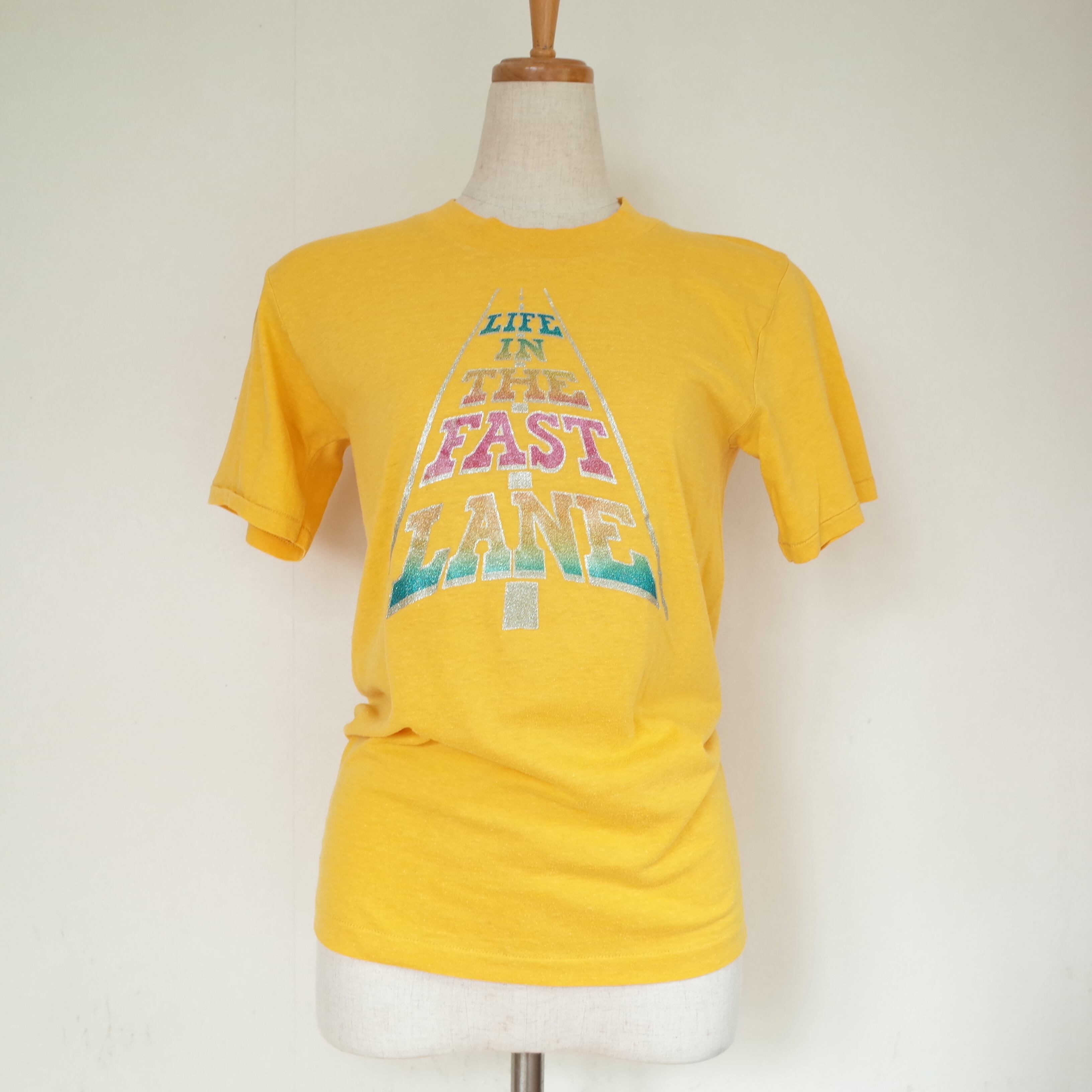 90年代製T PLUSのグリッタープリントTシャツ。バックはフロッキーの両面プリント。異なる二つのプリントで違った雰囲気を楽しめる一枚です。