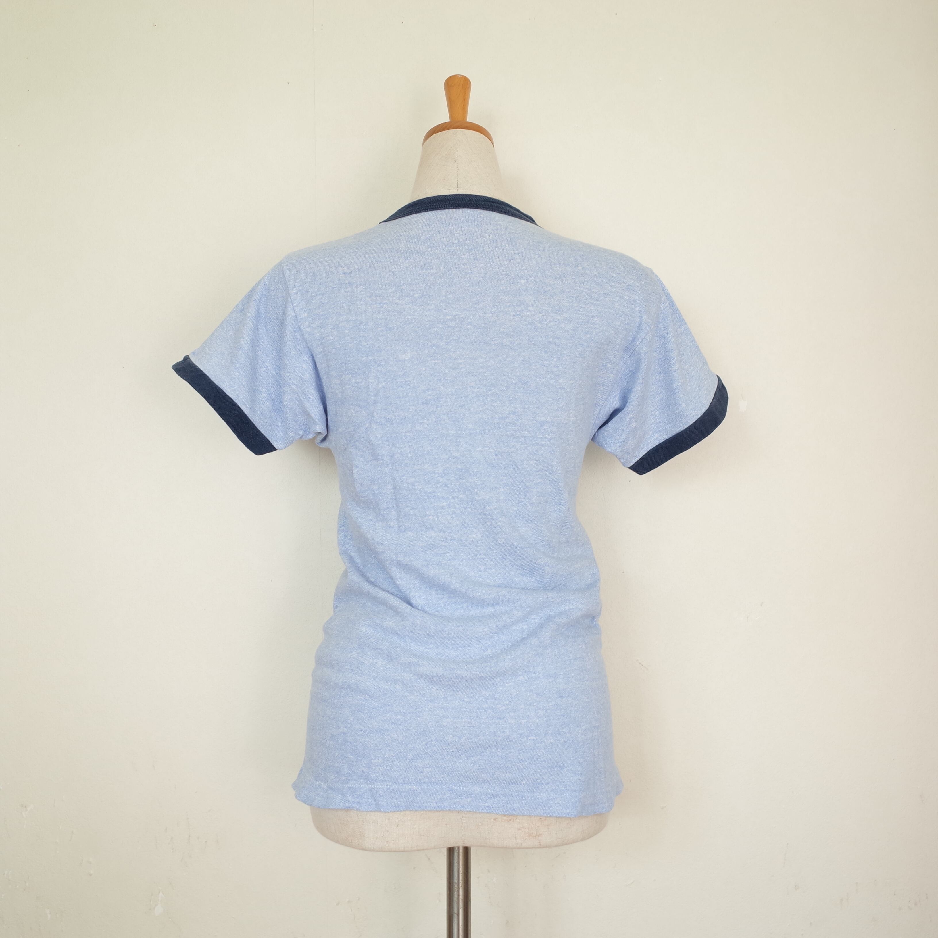 70年代アメリカ製ChampionのカレッジTシャツ。バータグの染み込みプリントです。少し着丈は長めのジャストサイズで、トリムになっています。ヴィンテージらしい一枚です。